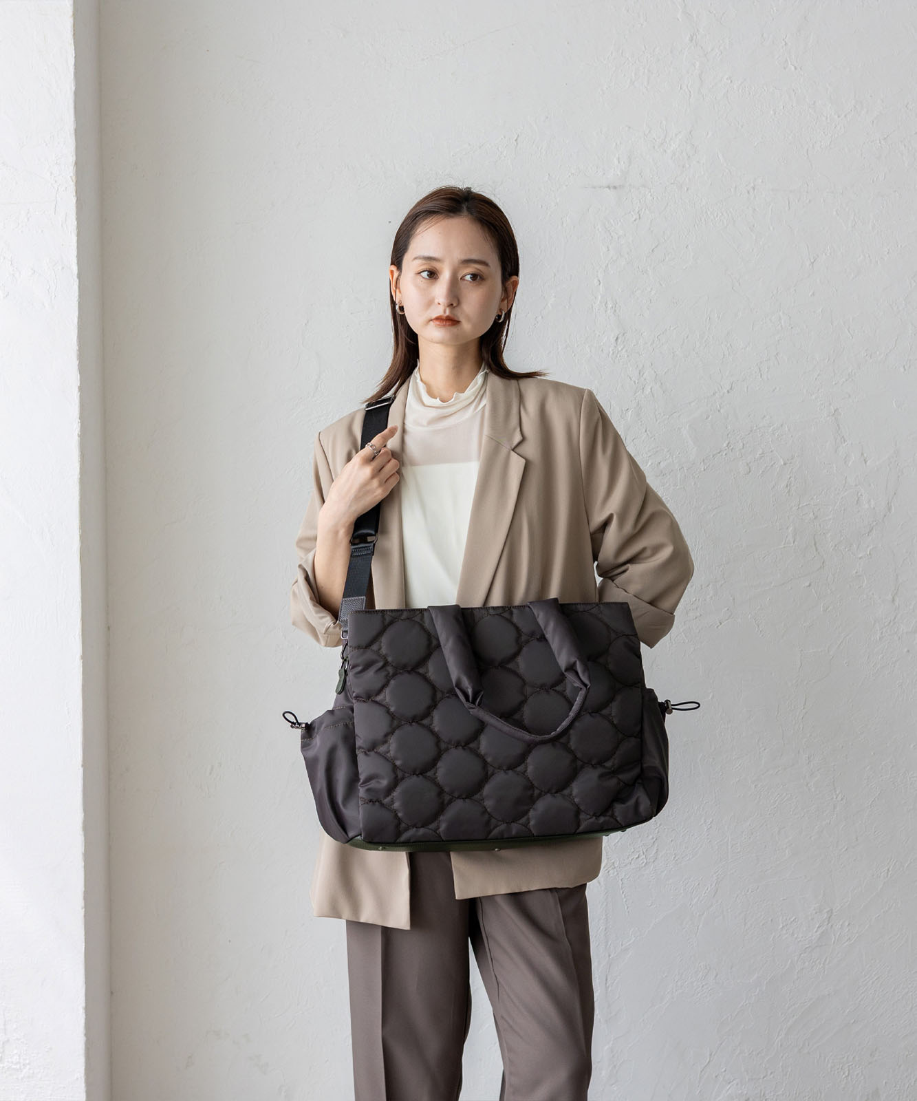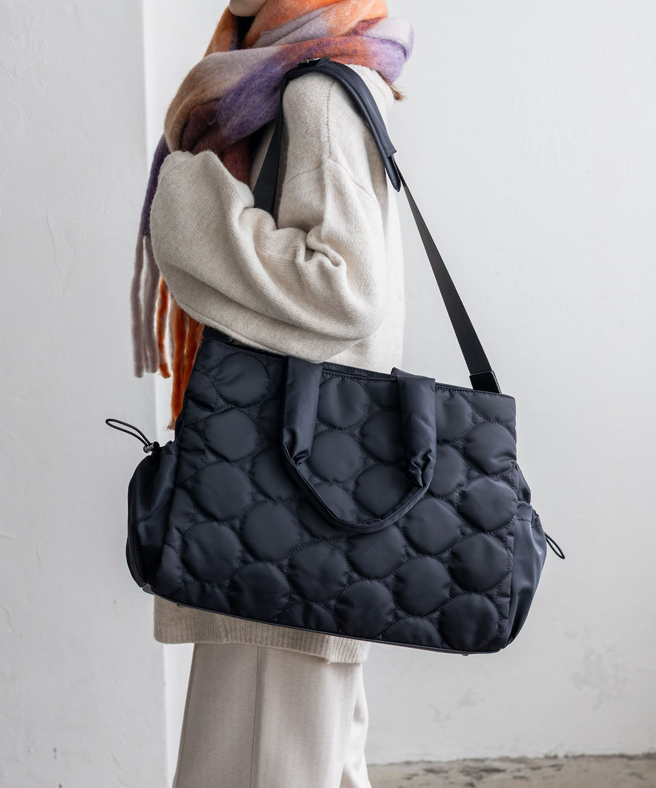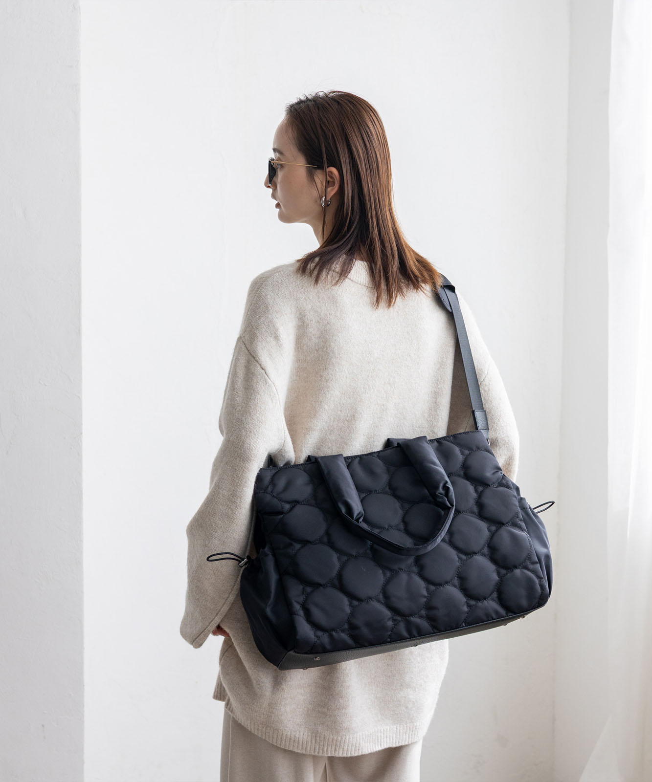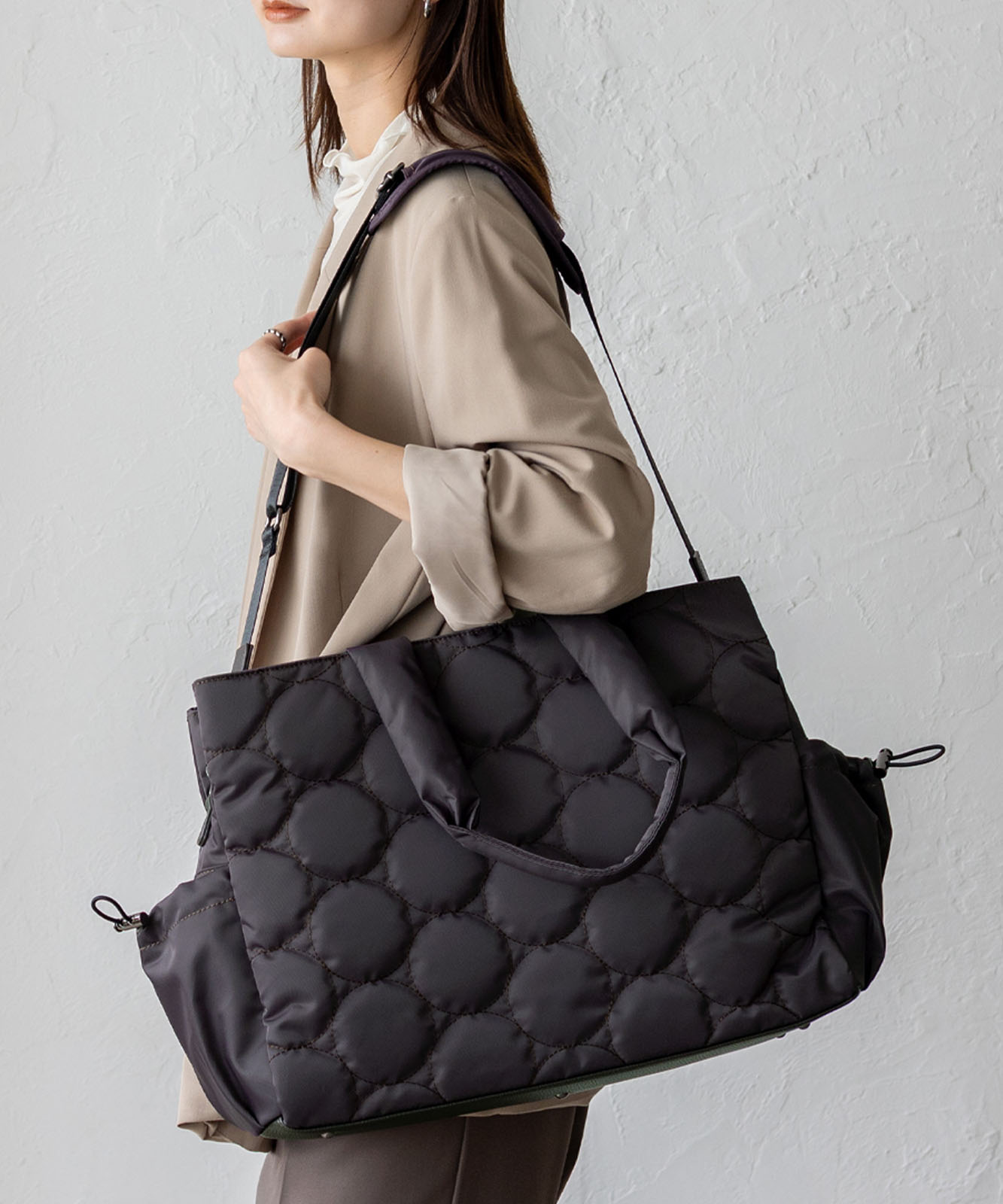 アウターの上からでも肩にかけやすい長めのハンドルで、通勤時の持ち運びもスムーズ。