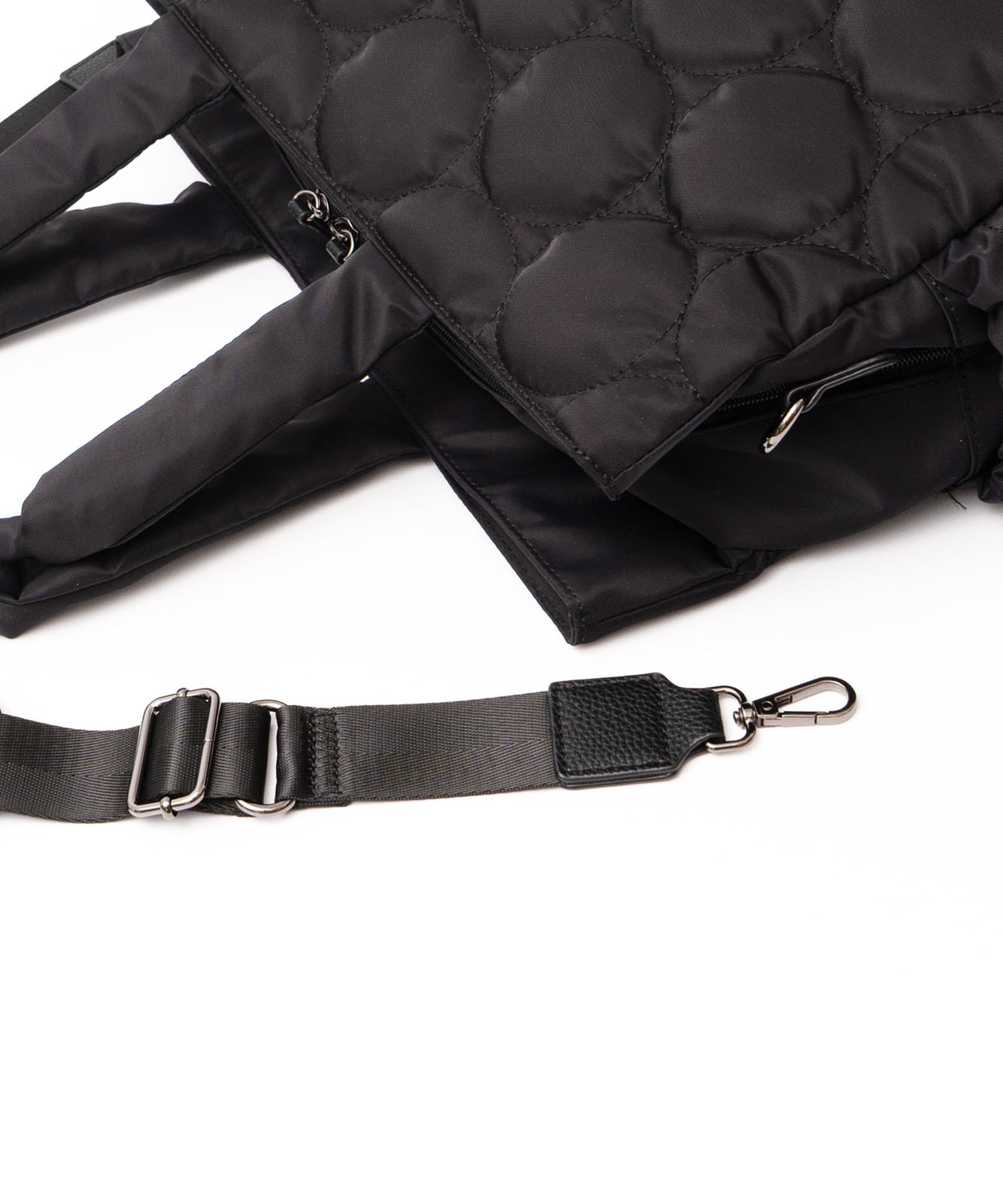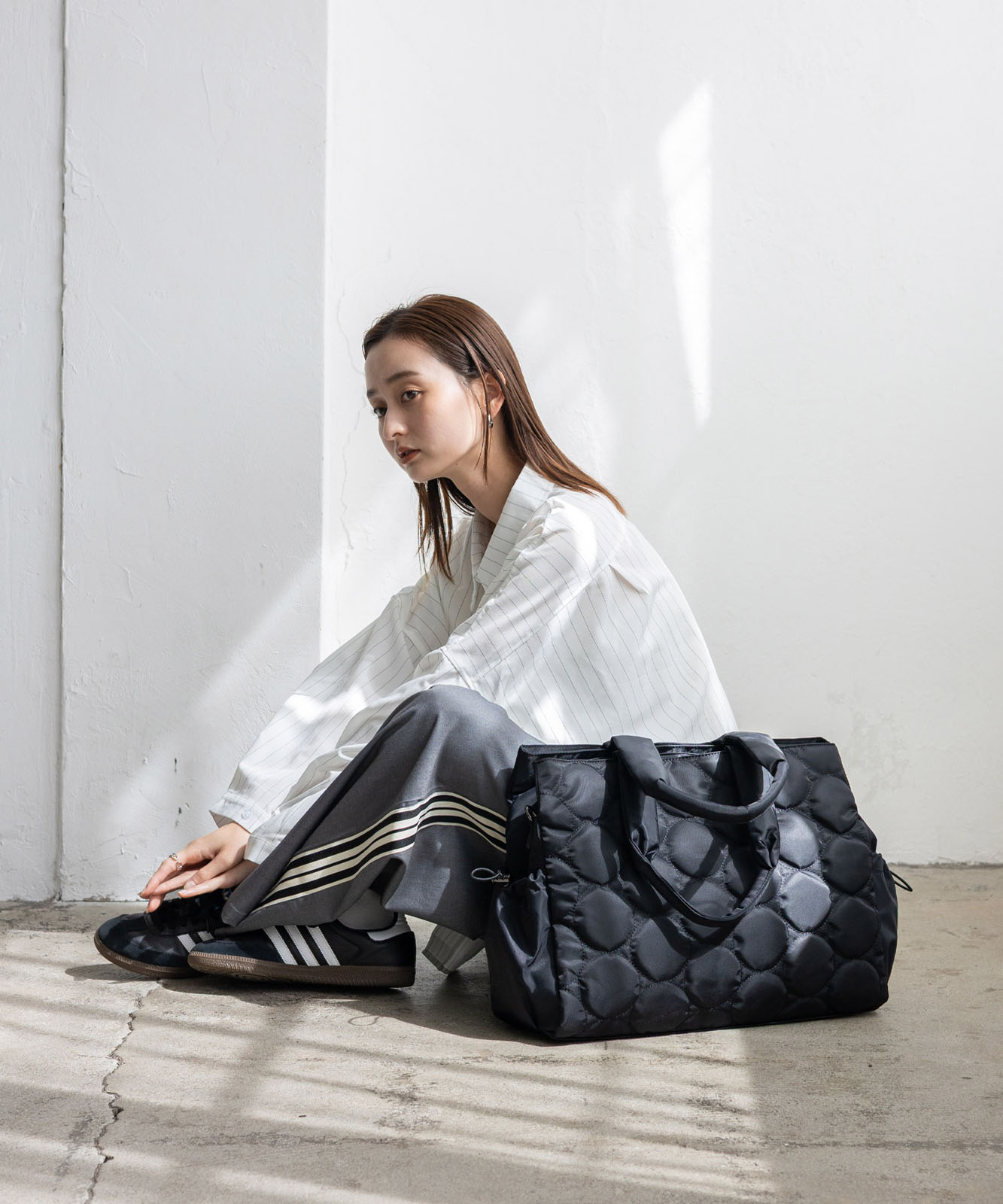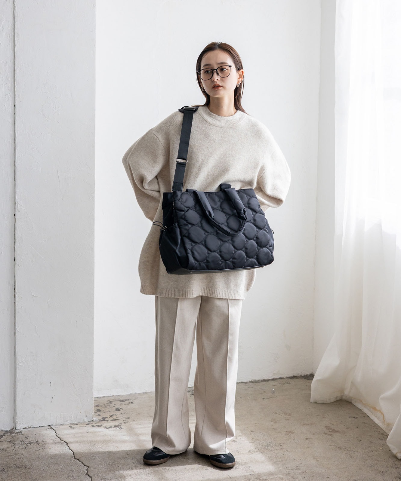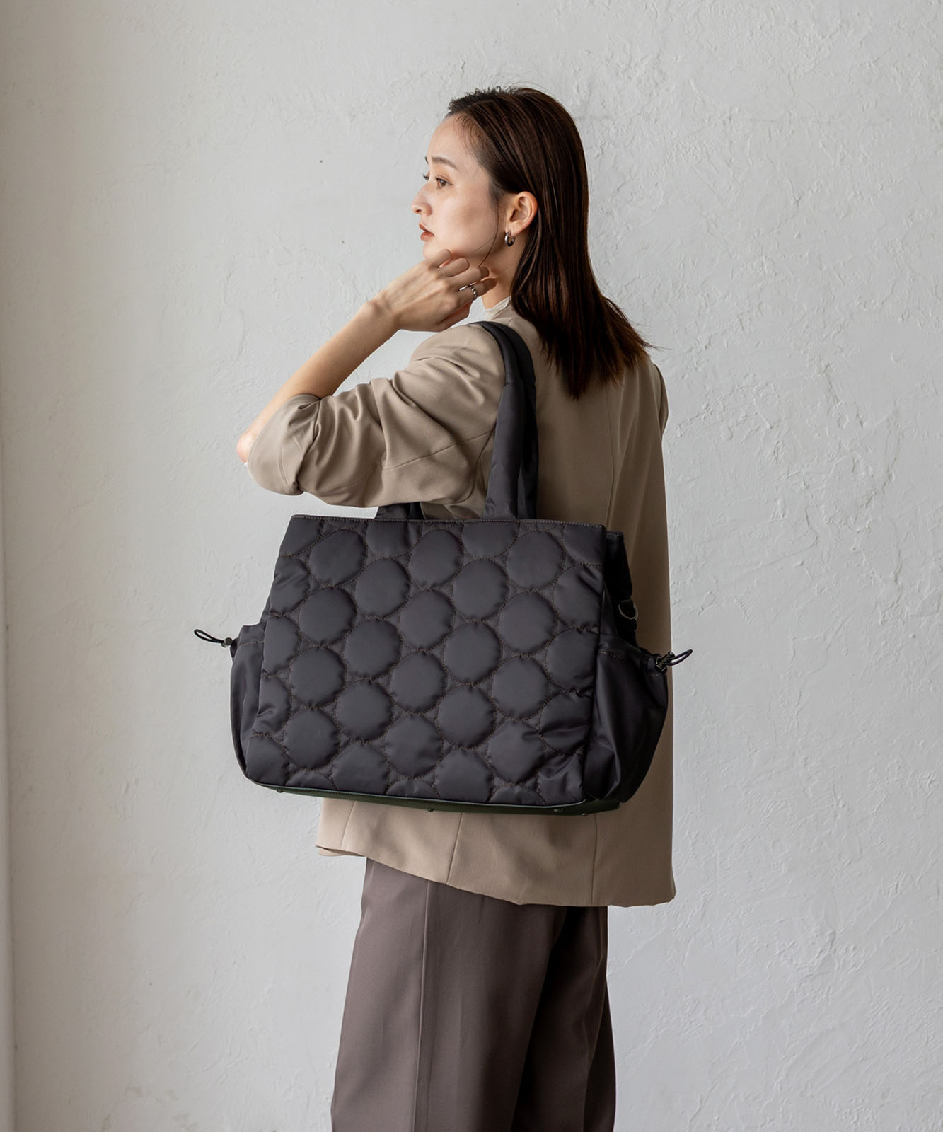 アウターの上からでも肩にかけやすい長めのハンドルで、通勤時の持ち運びもスムーズ。