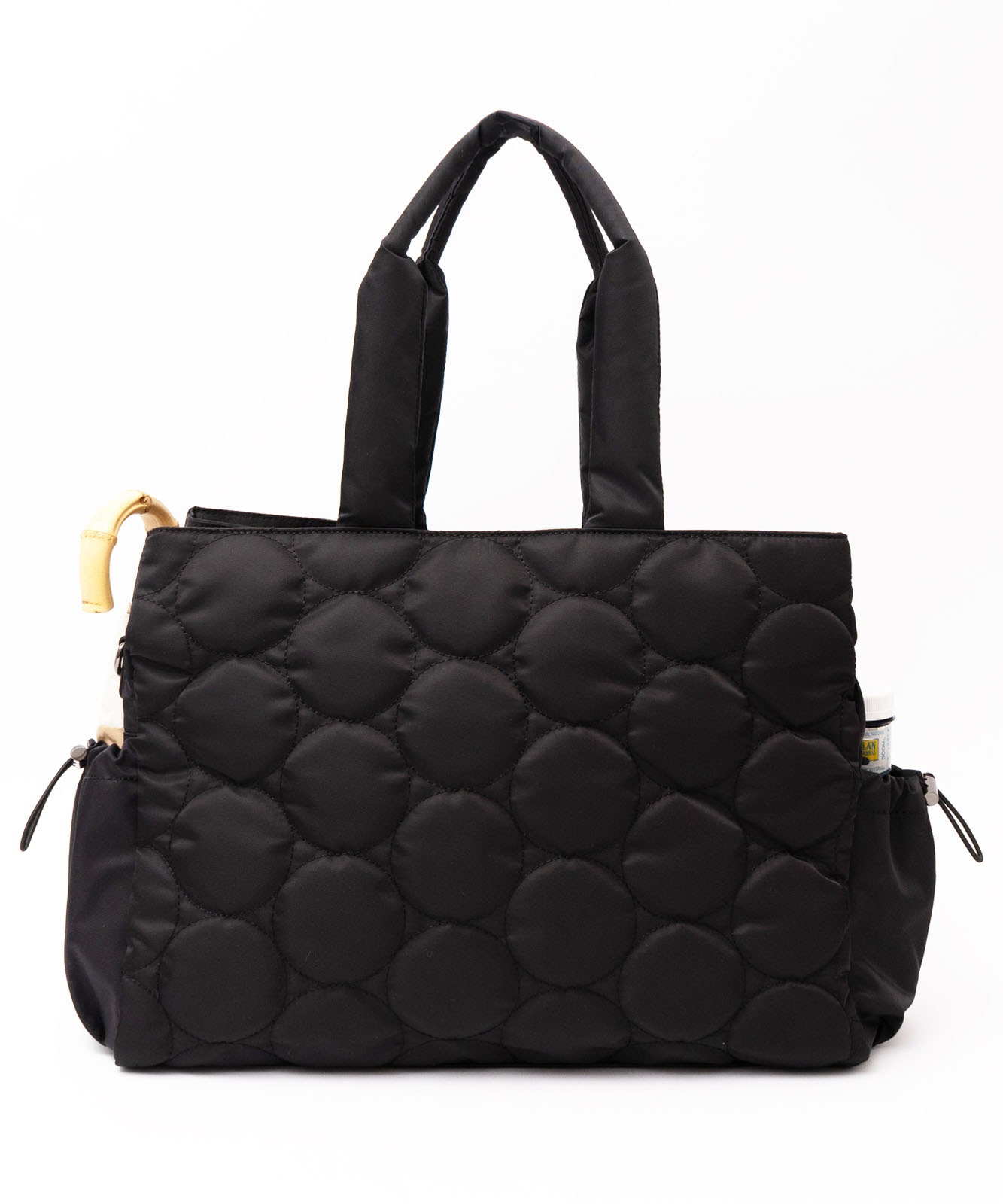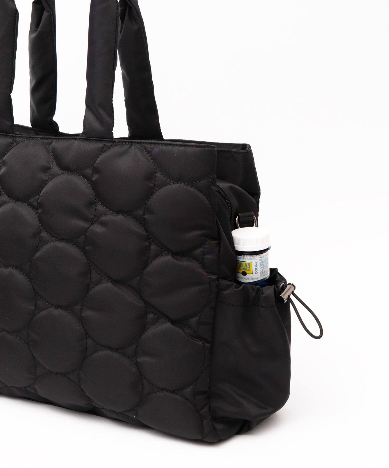 バッグ内にペットボトルホルダーを備え、ドリンクを安定して収納できます。