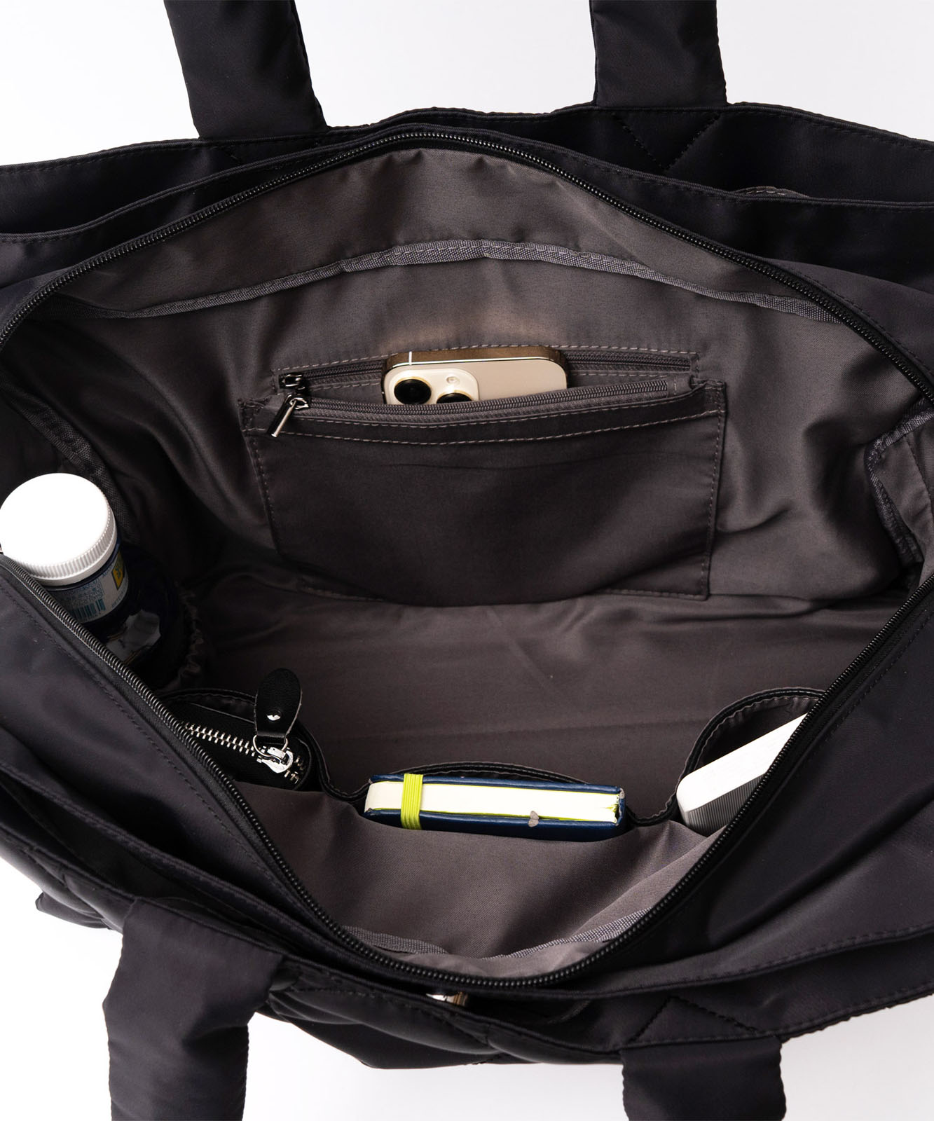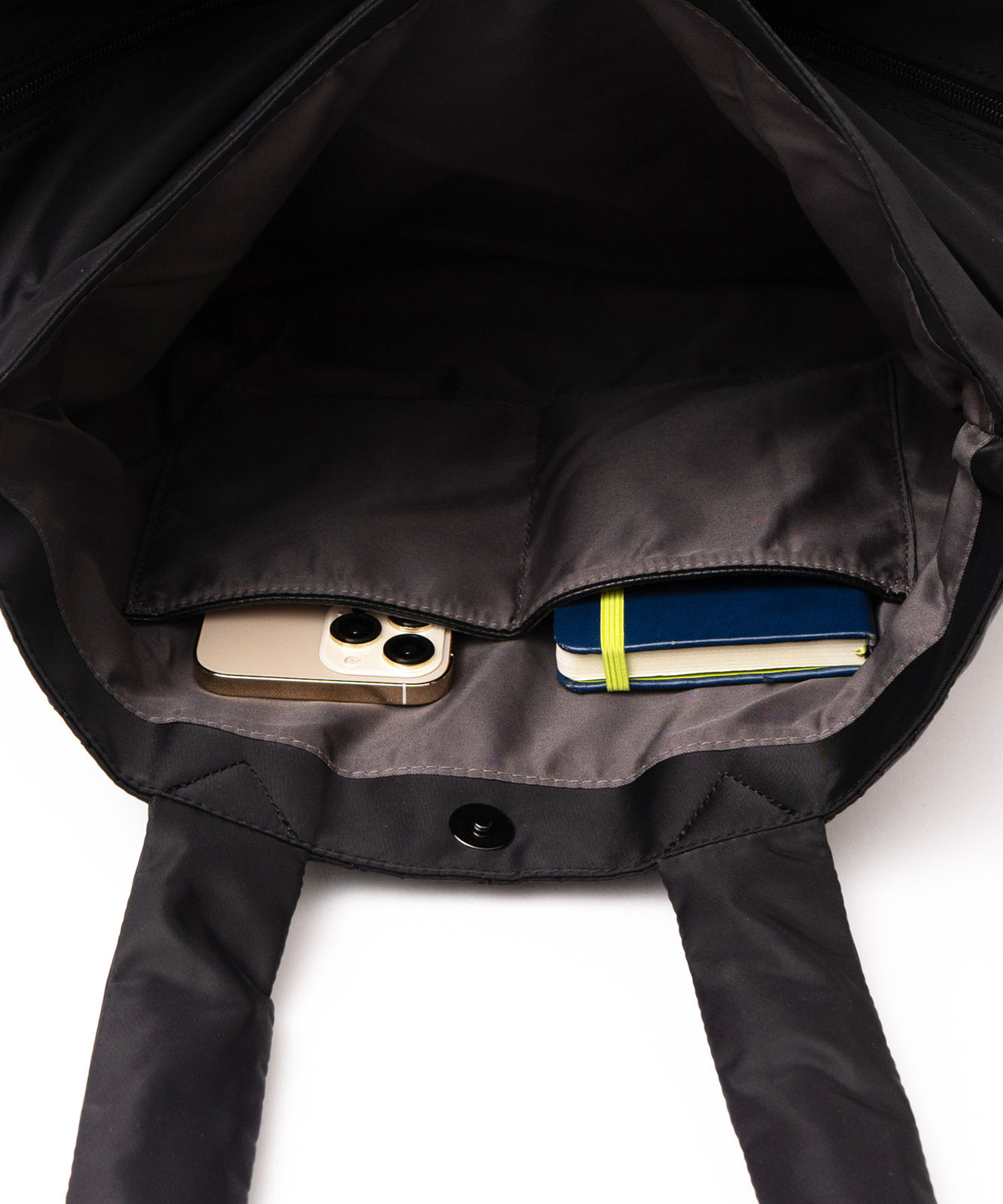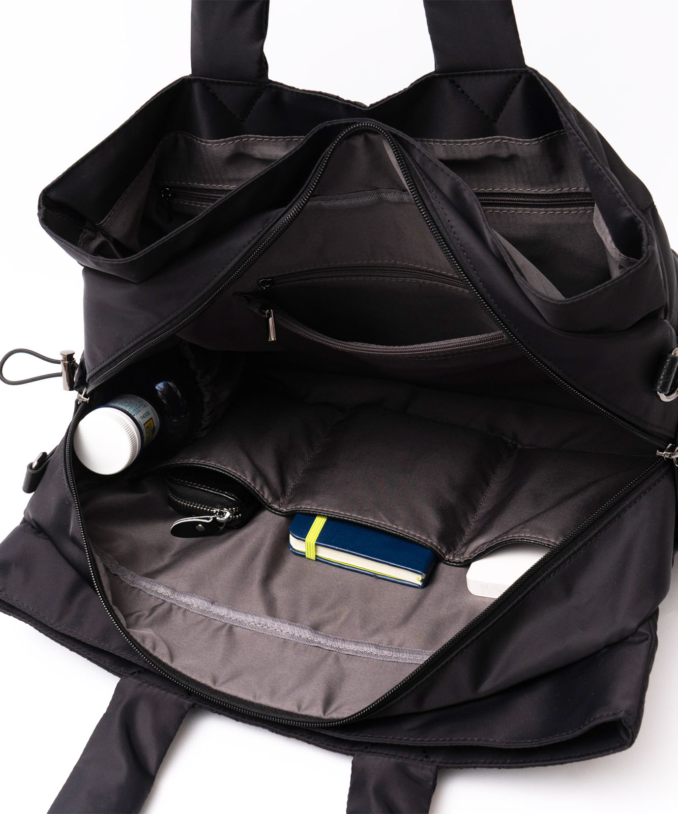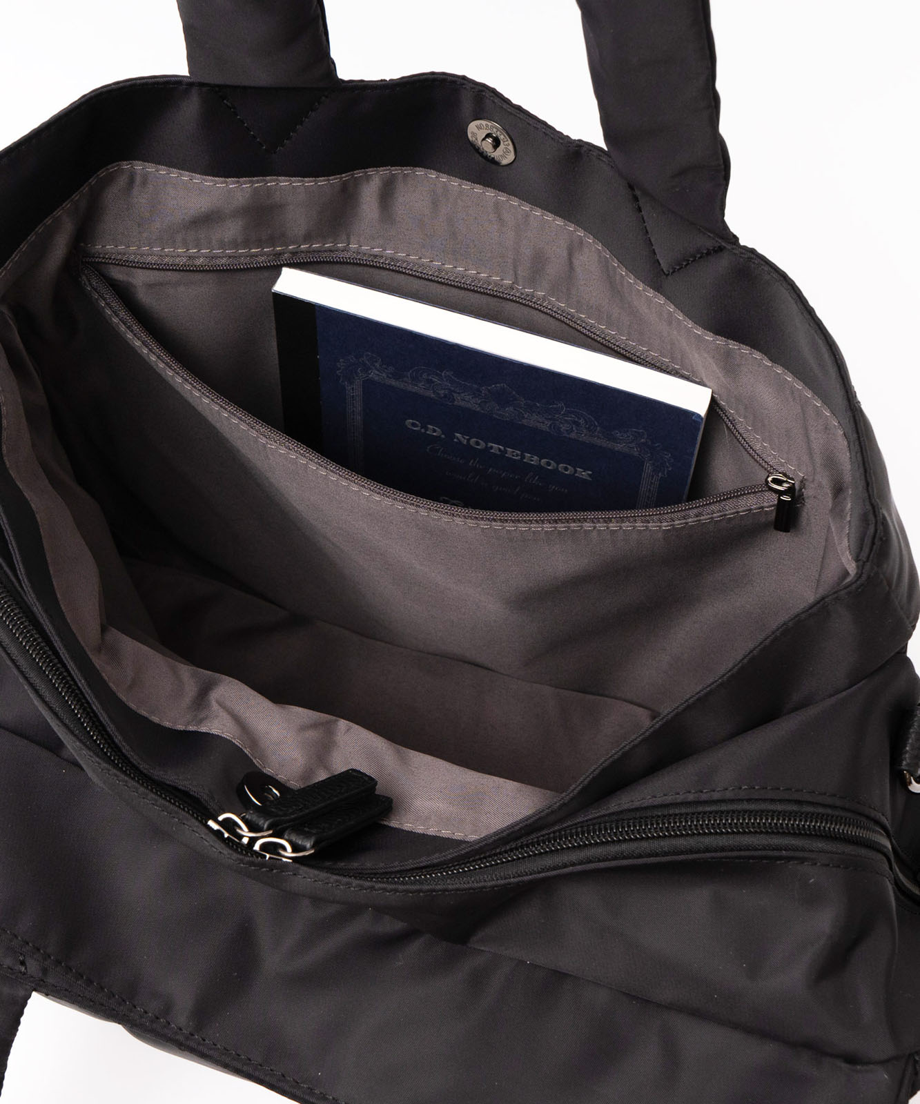 メインルームは大容量で、前後の収納にはマグネット付き。用途に合わせてスマートに仕分けできます。