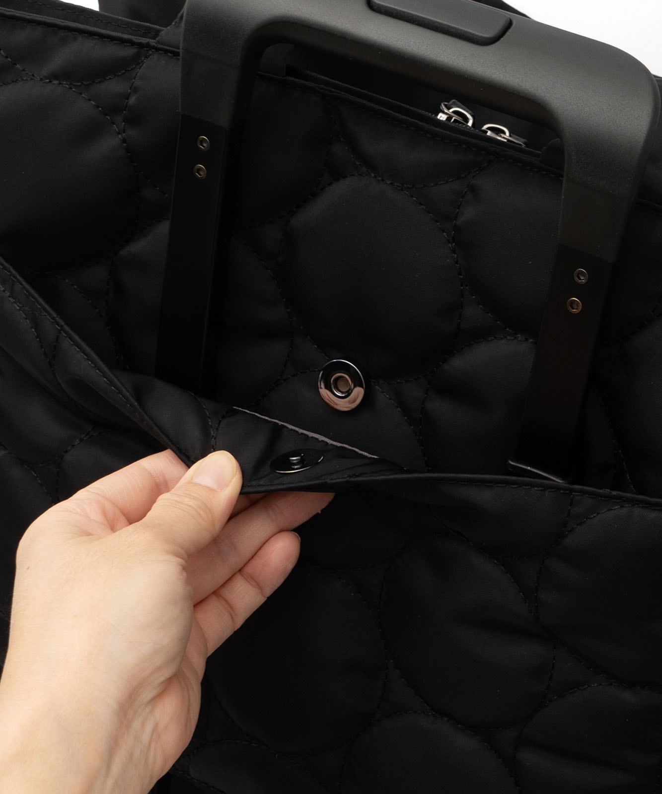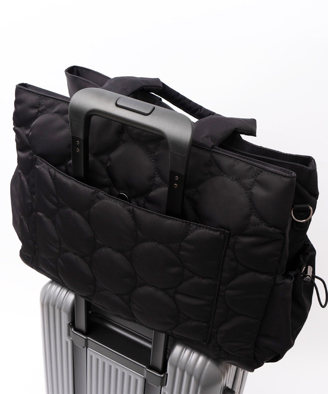 背面にはキャリーバー通しを装備。スーツケースのハンドルに通せるので、旅行時の持ち運びもスムーズです。