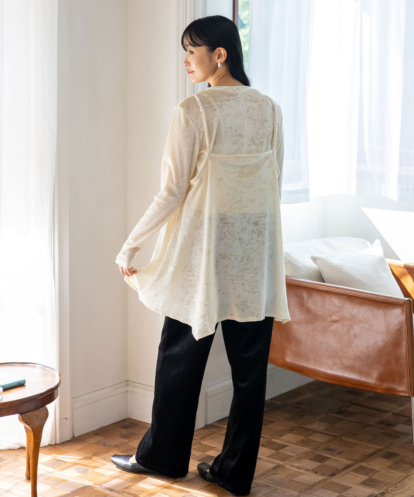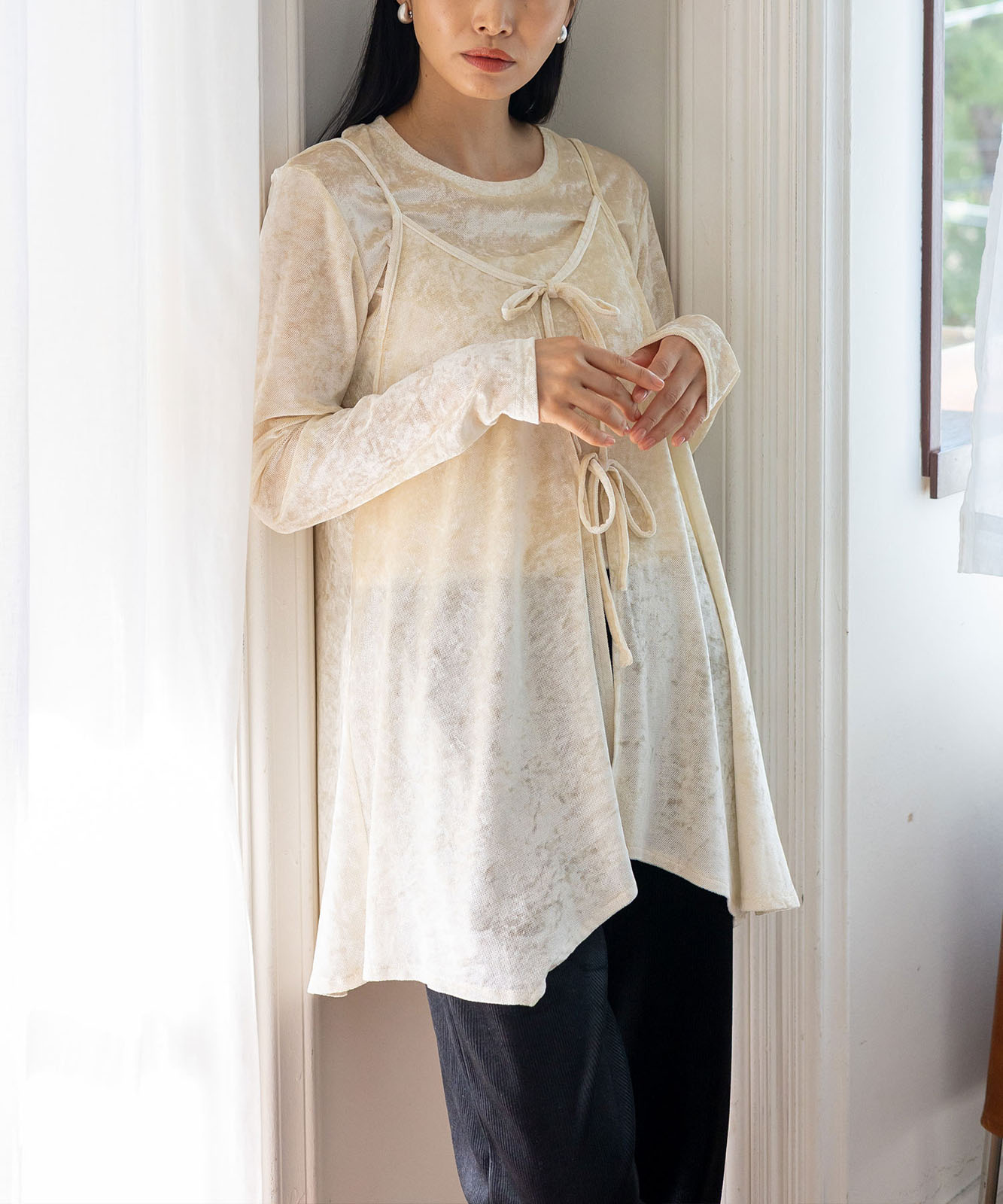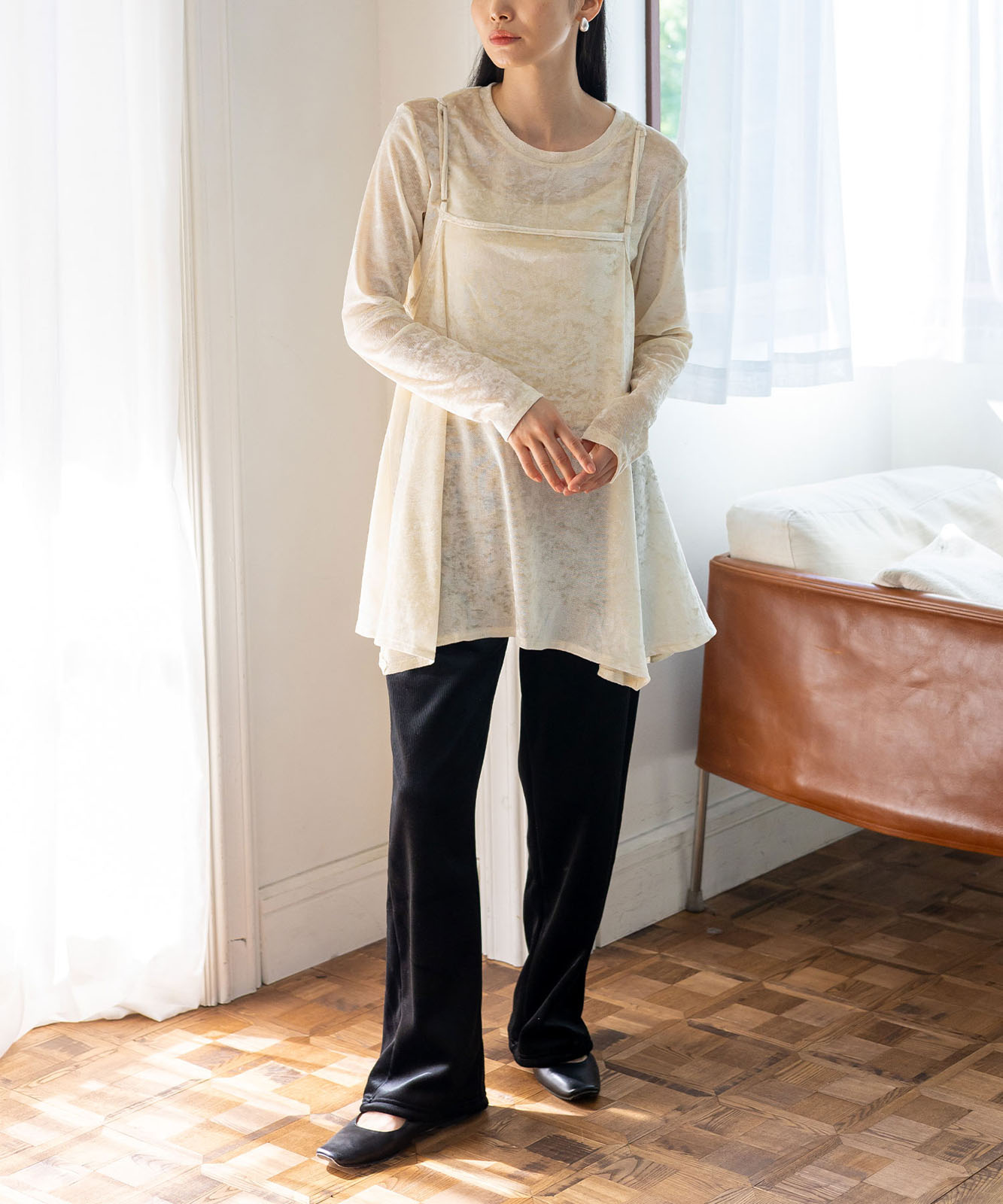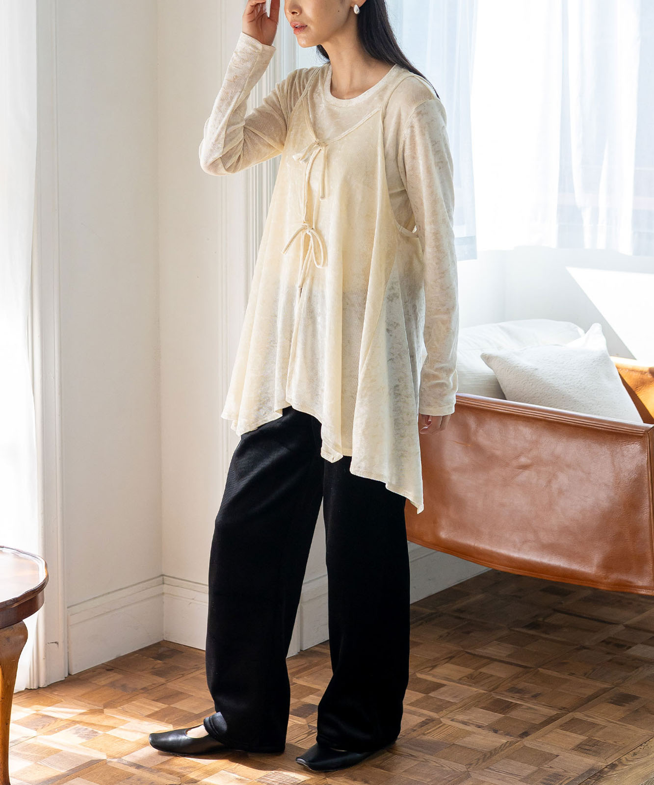 カットソーやシアートップスとのレイヤードで、旬のスタイルが完成。