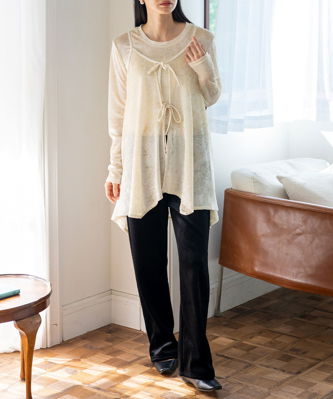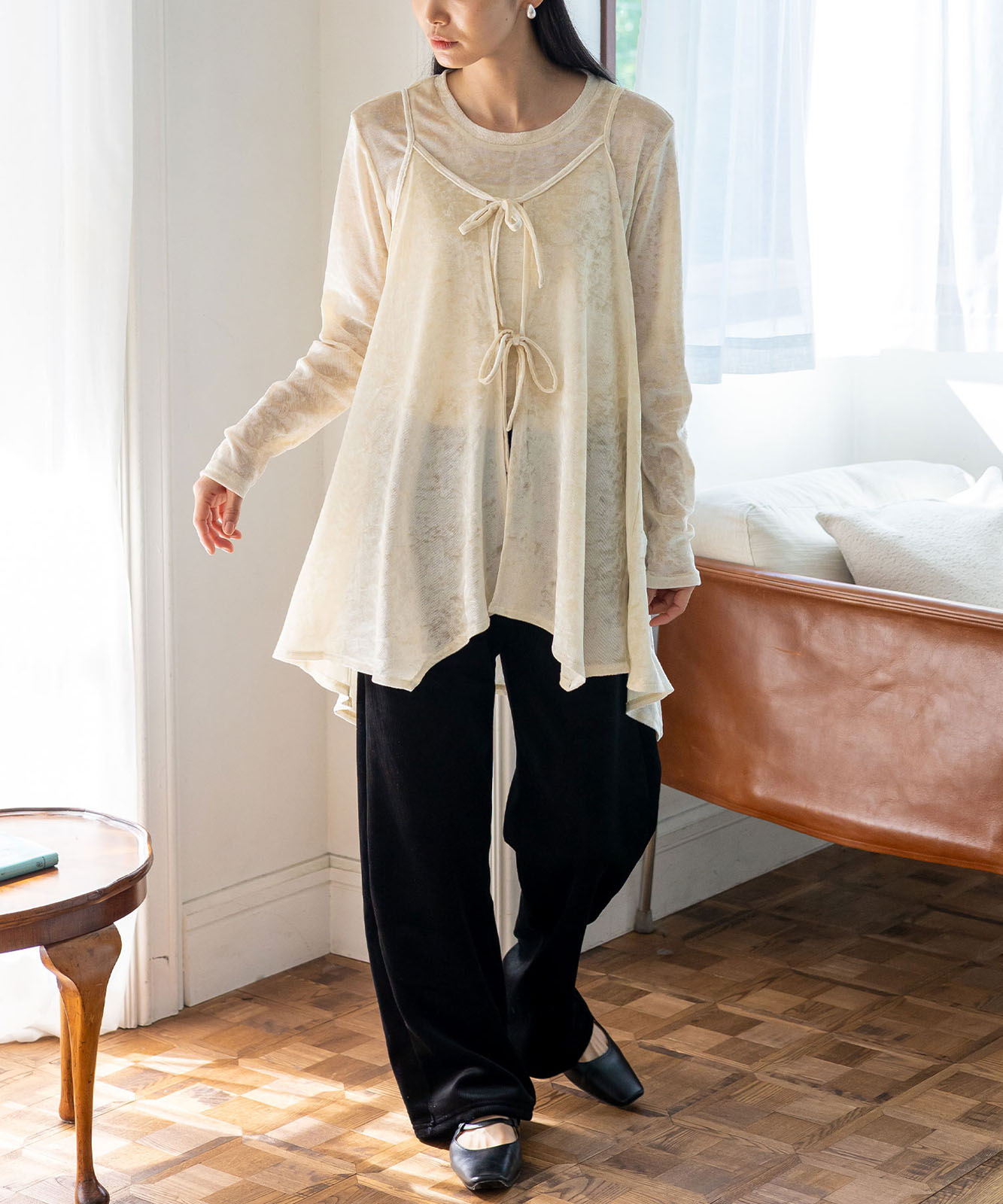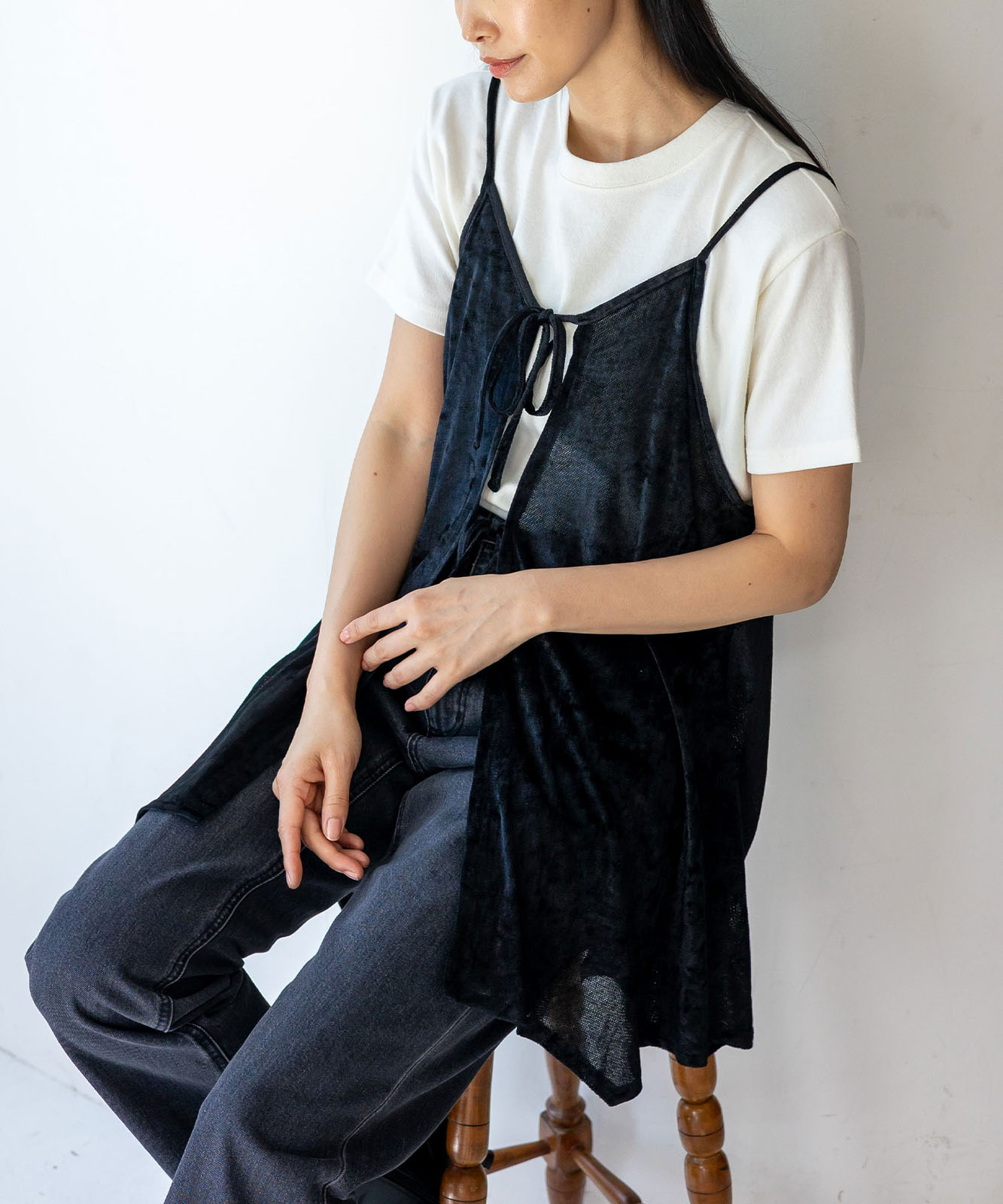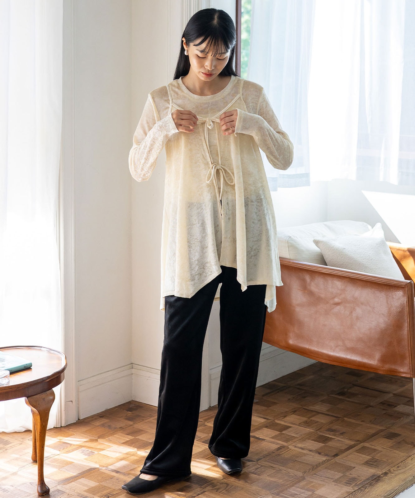 カットソーやシアートップスとのレイヤードで、旬のスタイルが完成。