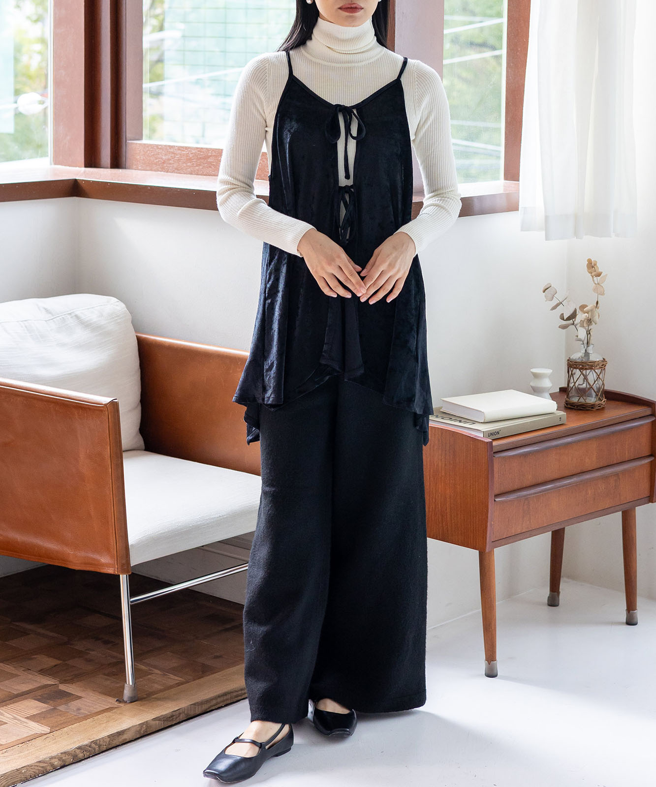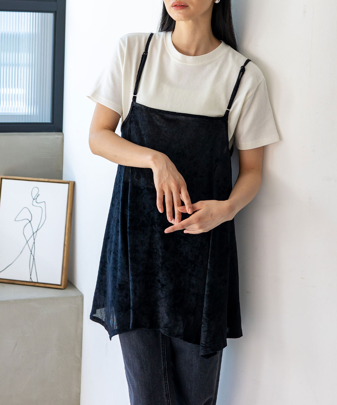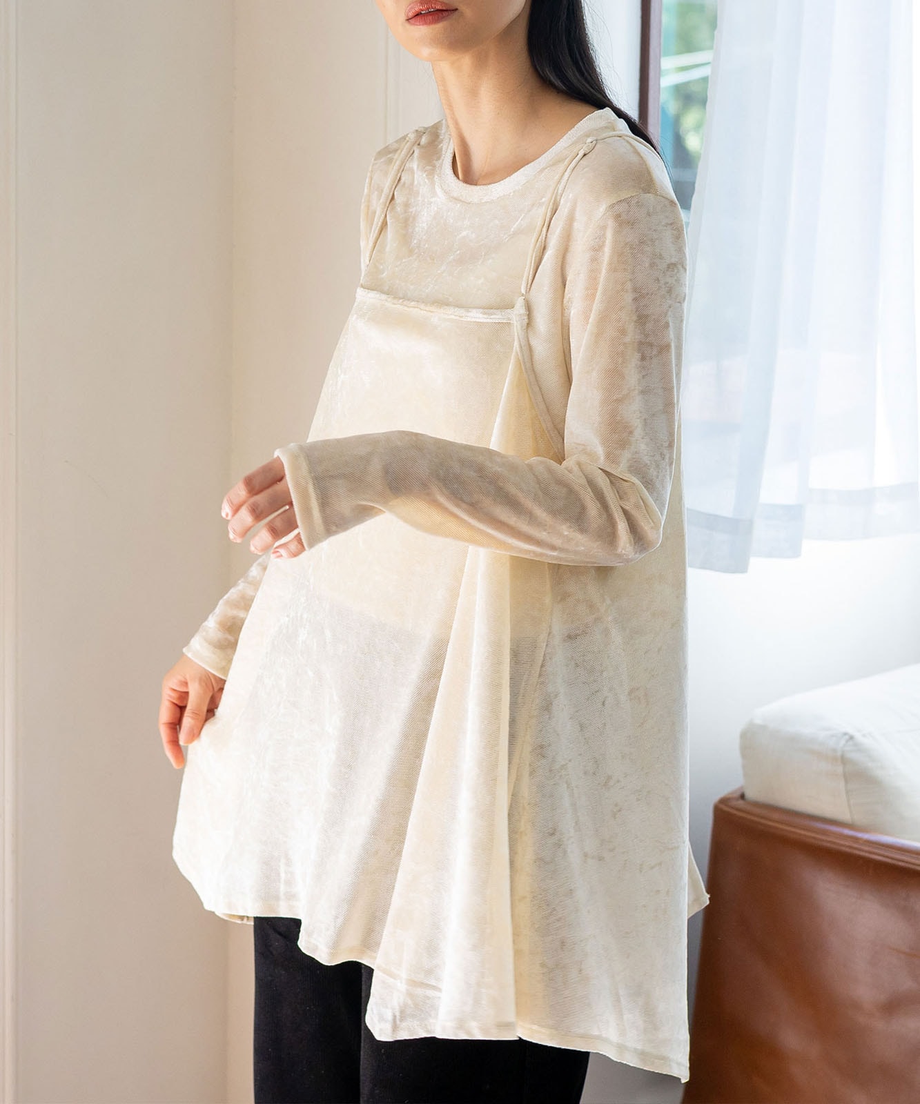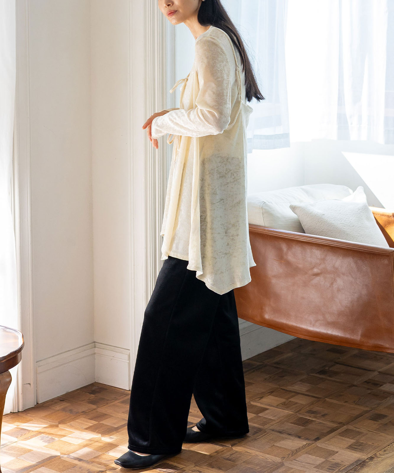 カットソーやシアートップスとのレイヤードで、旬のスタイルが完成。