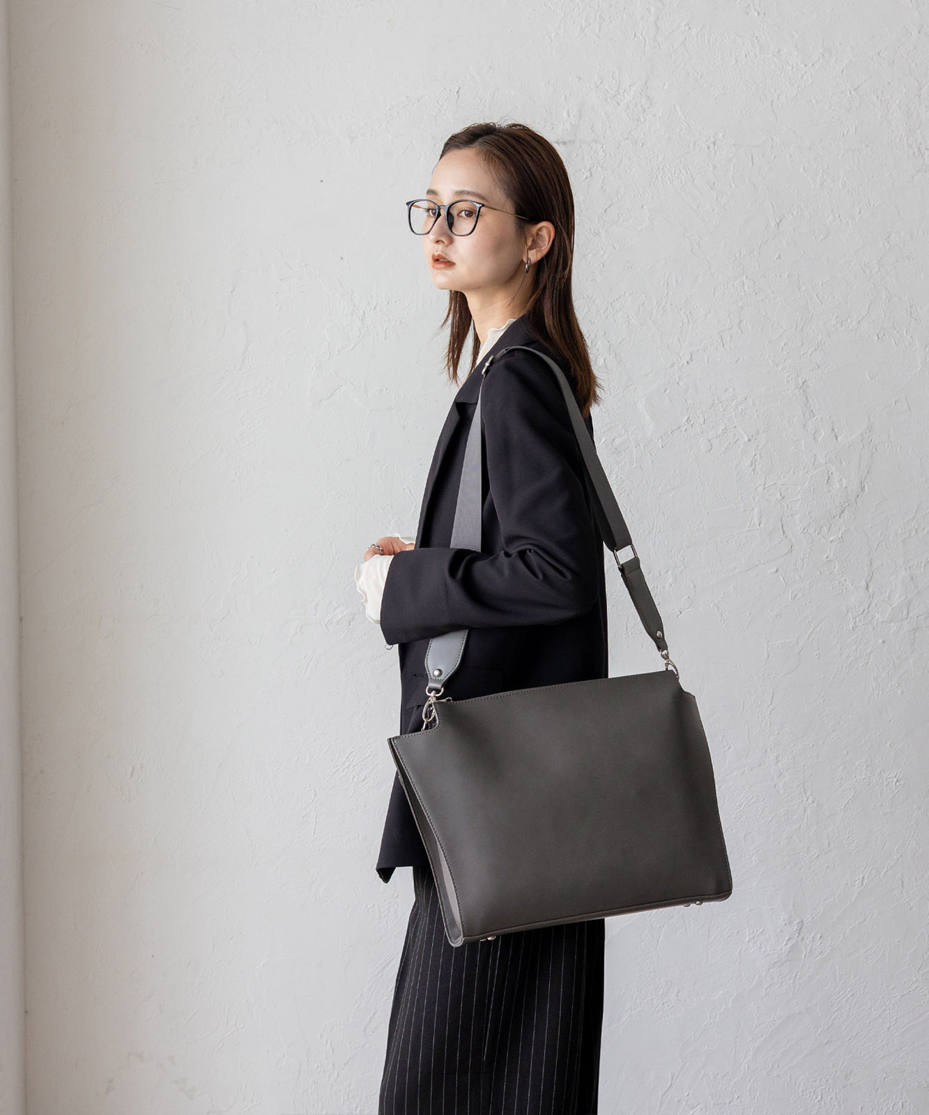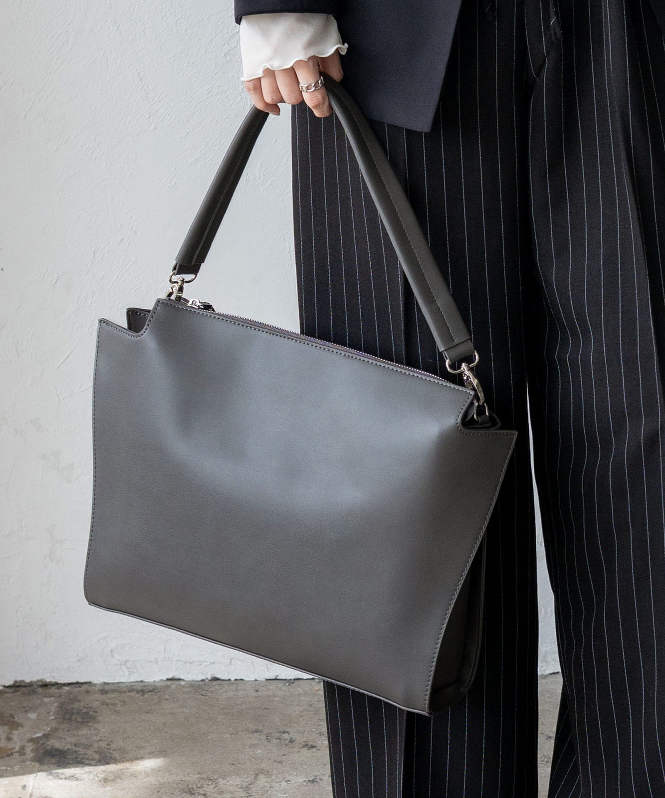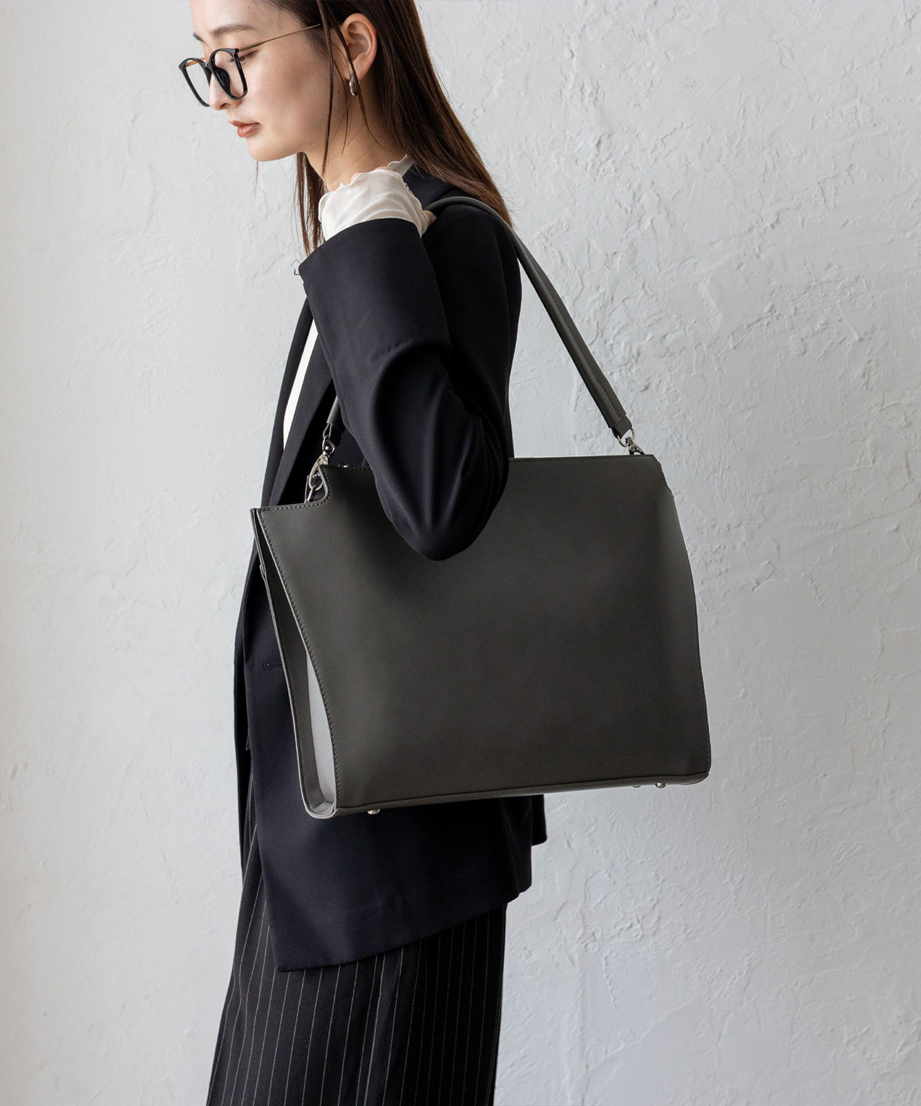 シルバー色の金具を採用し、クールな印象。凛とした佇まいのバッグです。