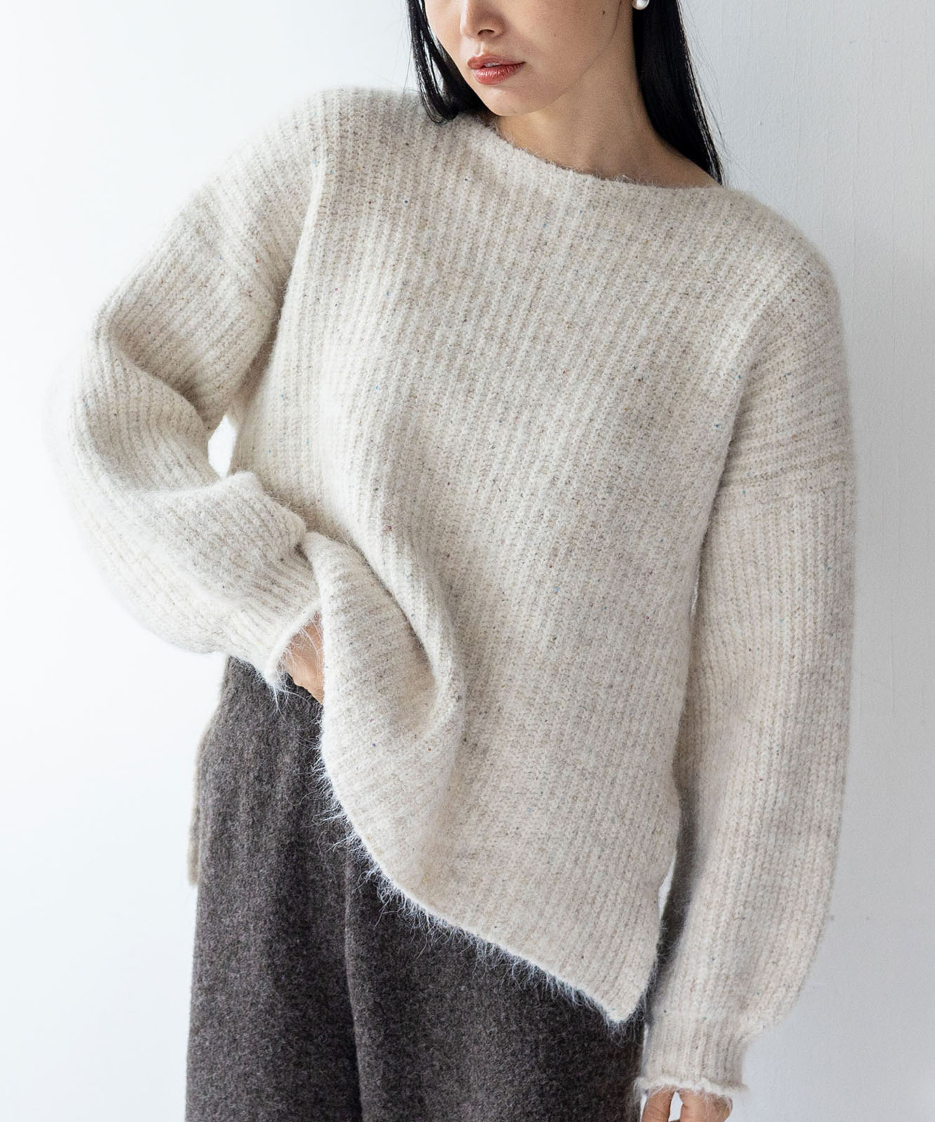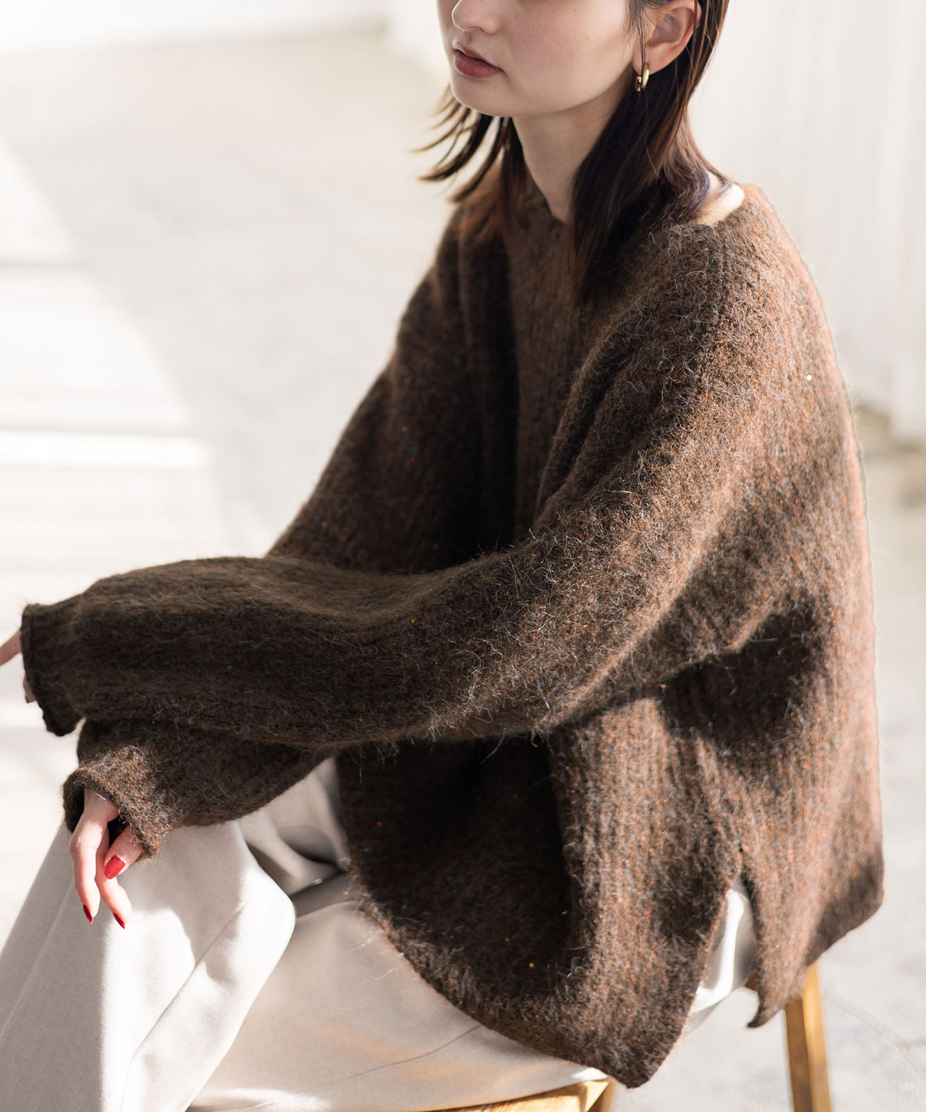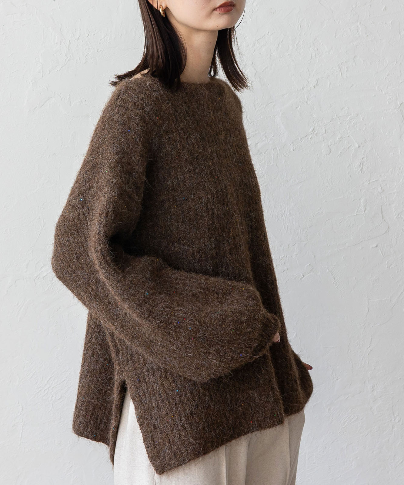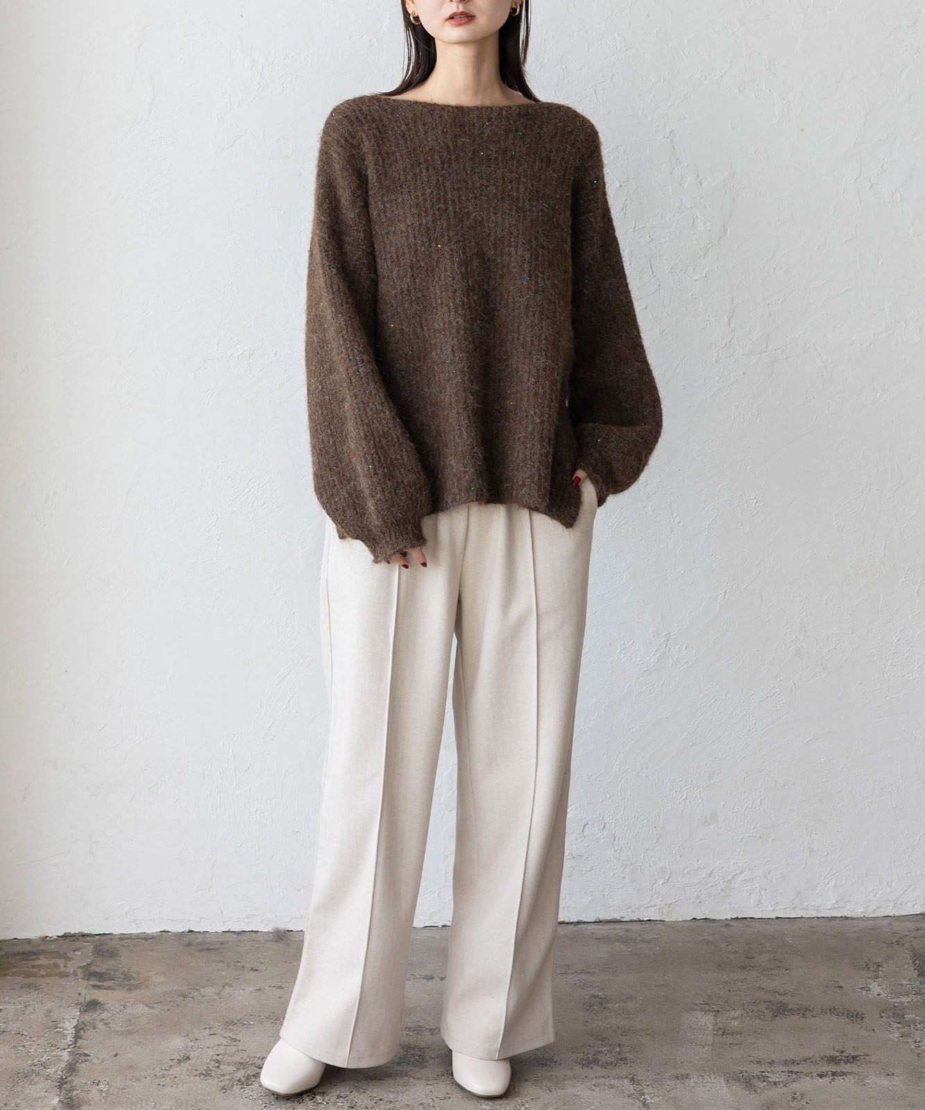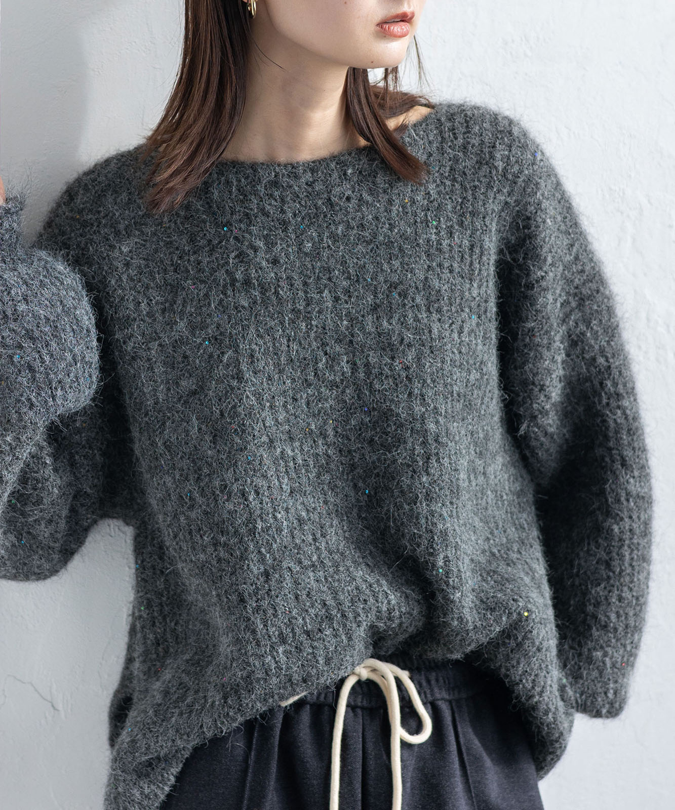 柔らかな起毛感がやさしい表情を生み、着るだけでシーズンムードを引き立てます。