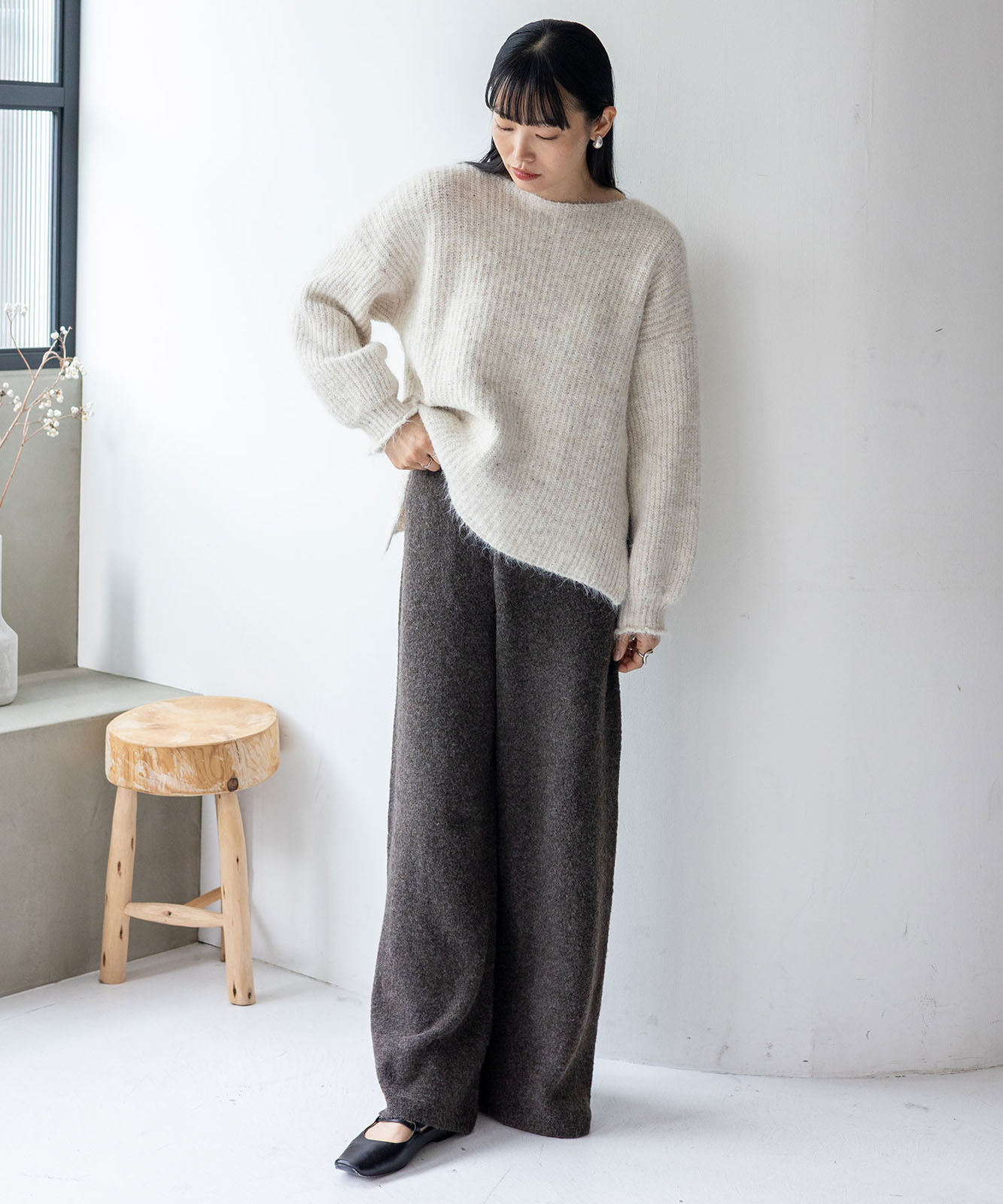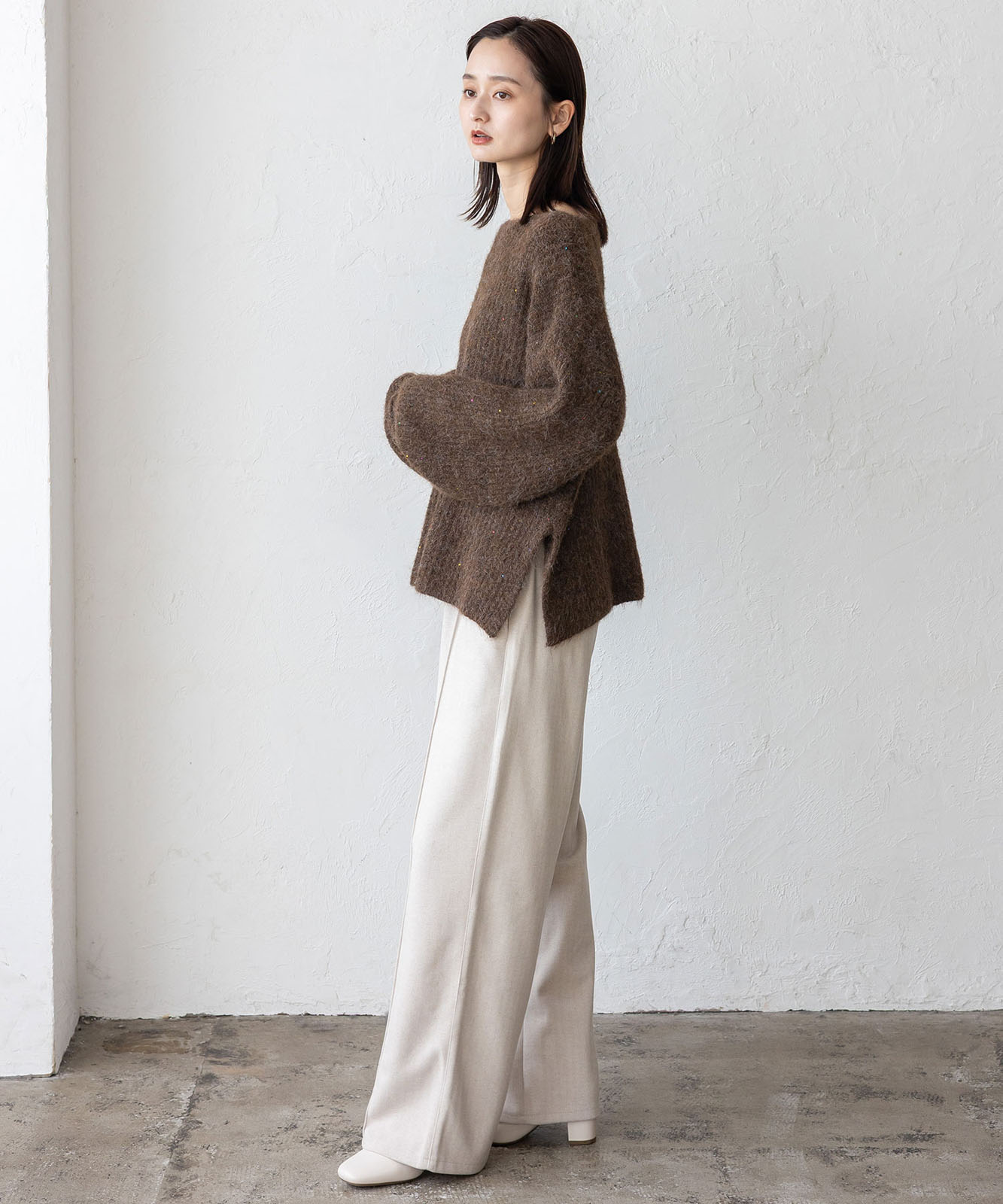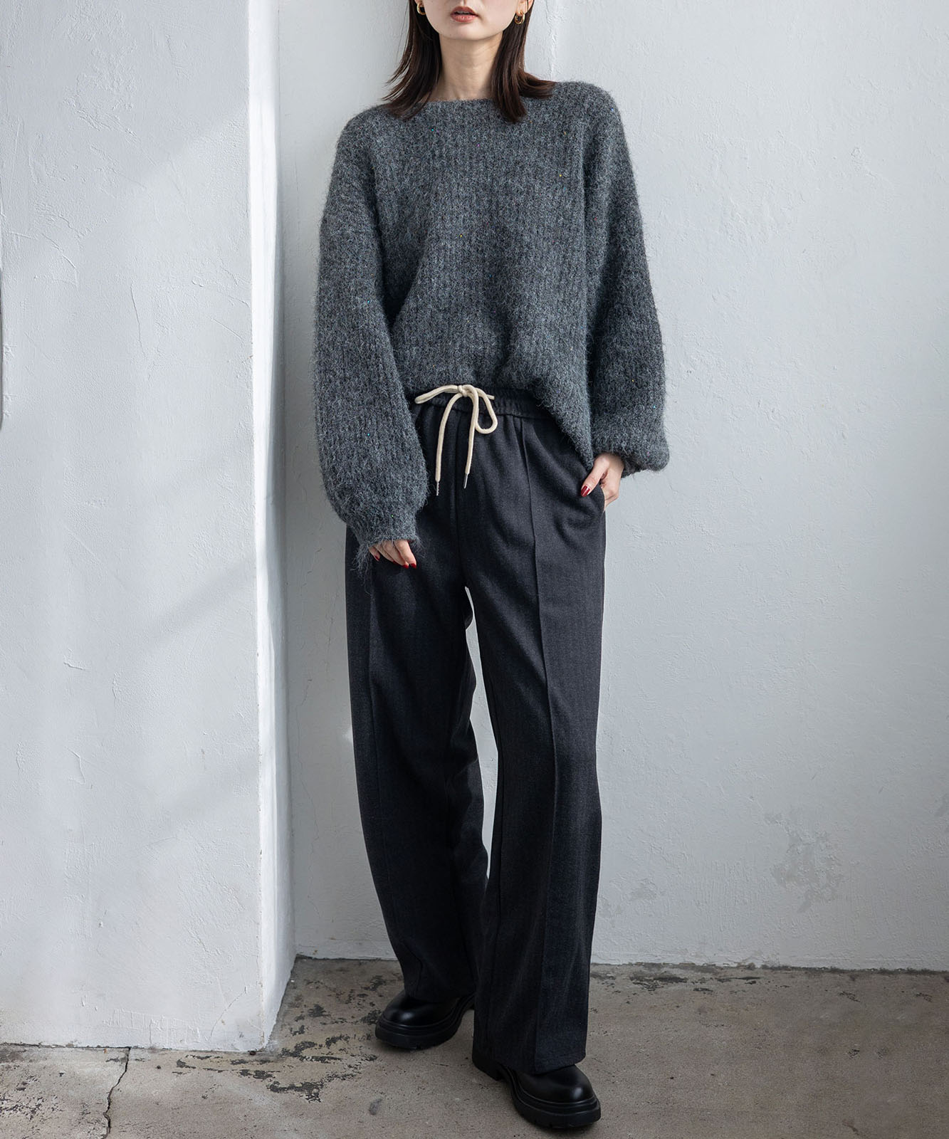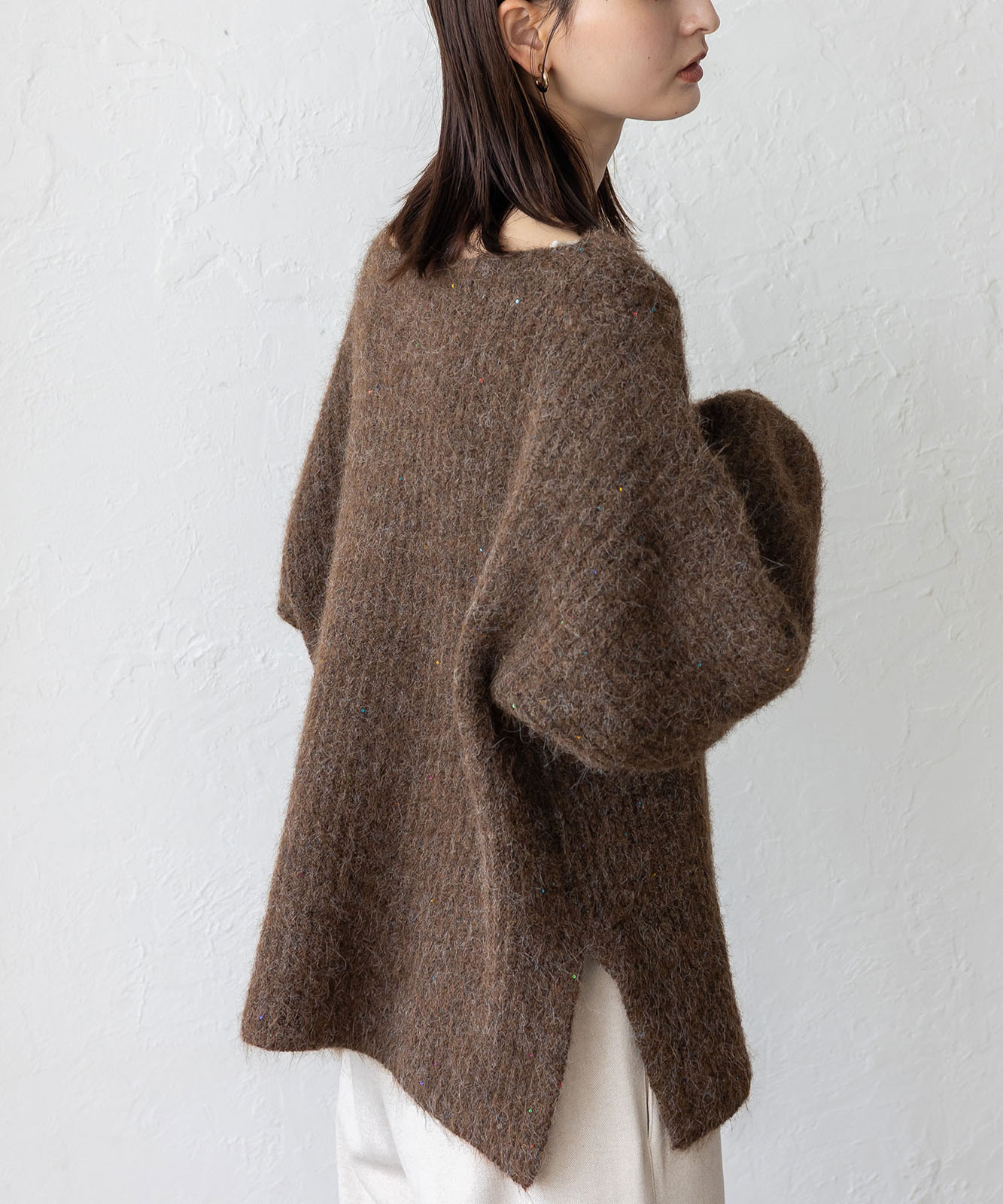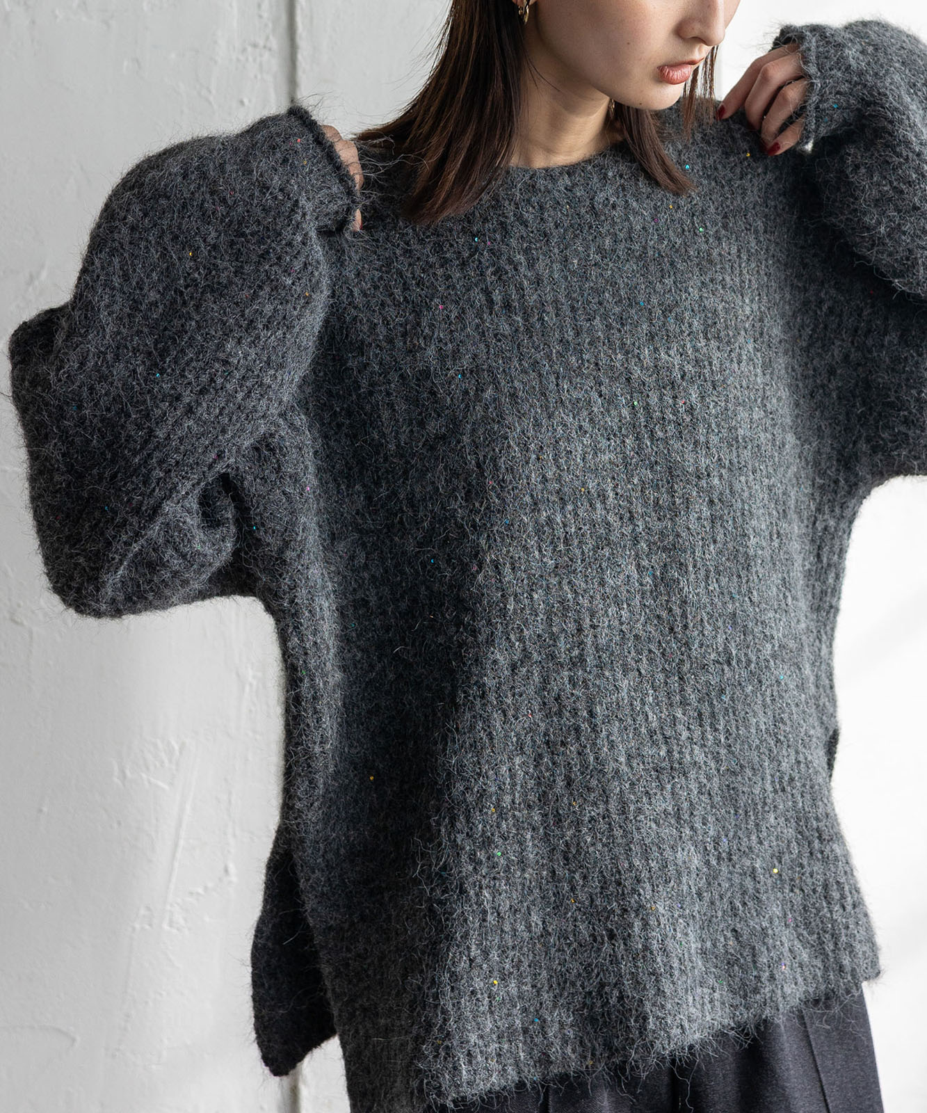 柔らかな起毛感がやさしい表情を生み、着るだけでシーズンムードを引き立てます。