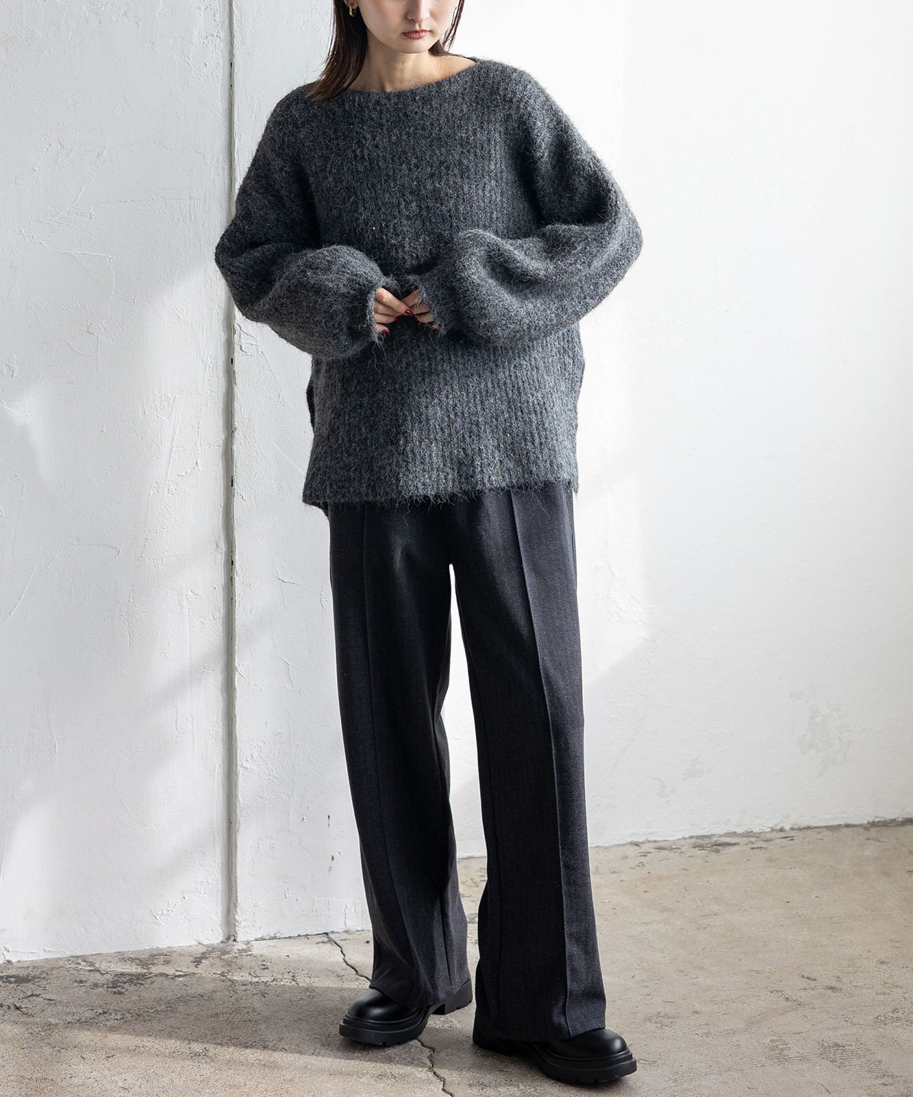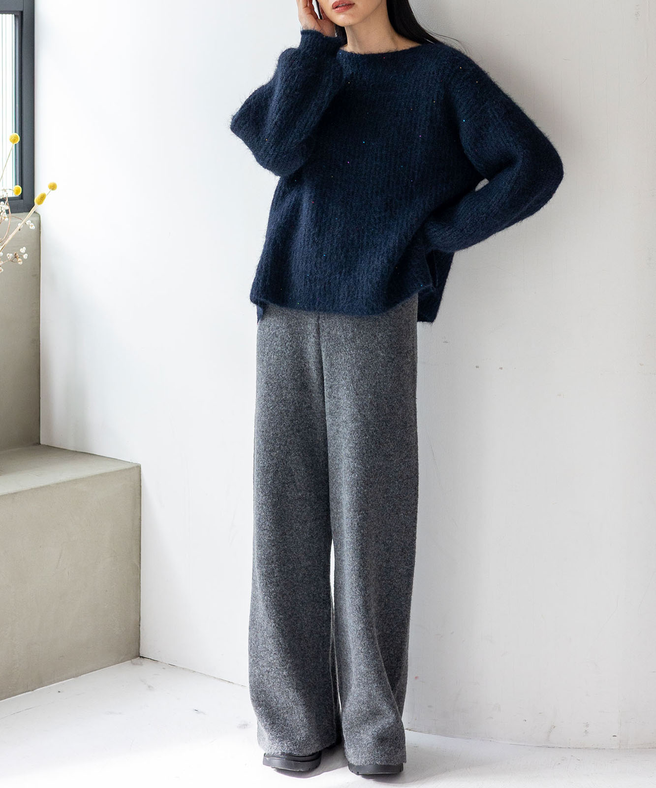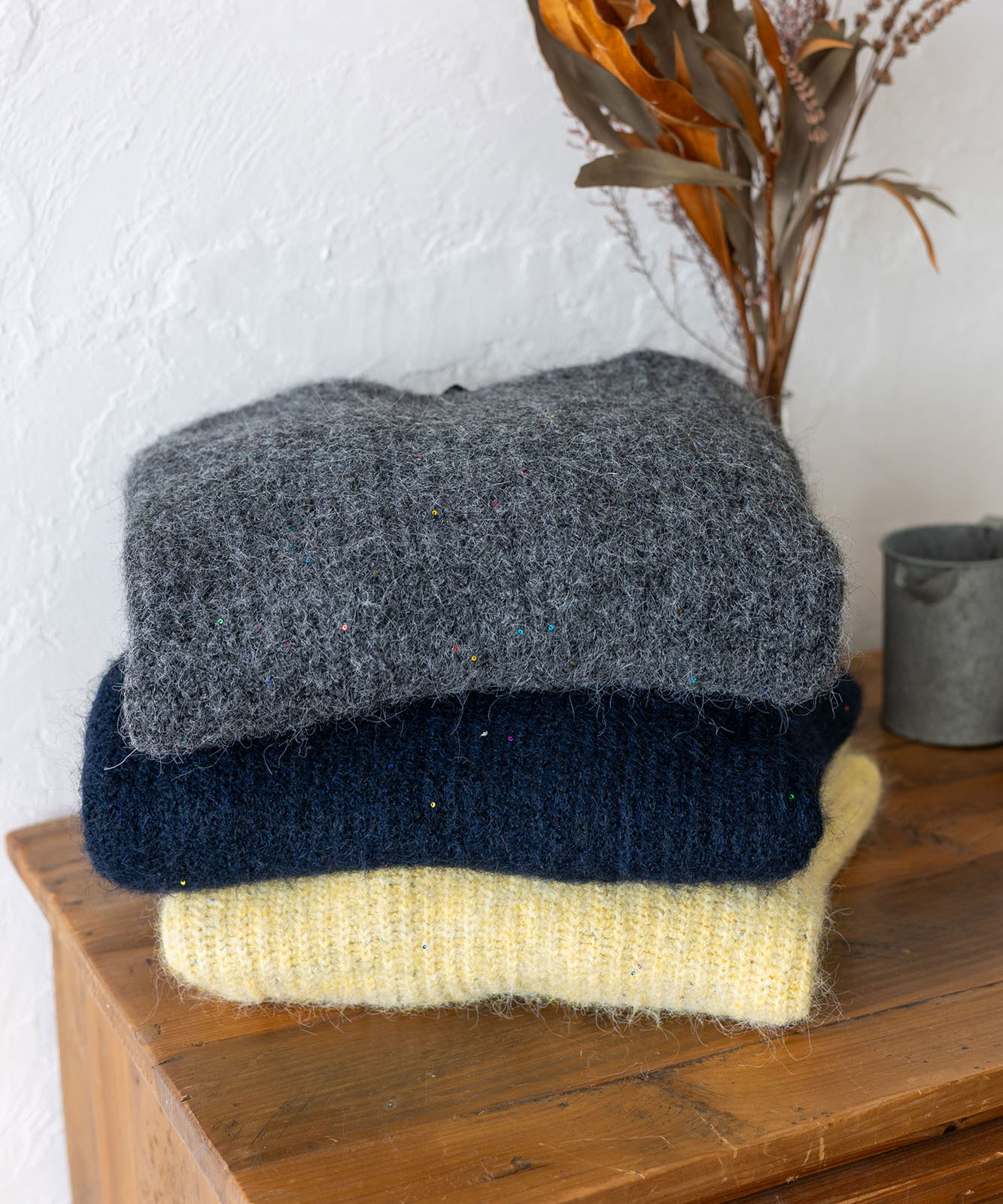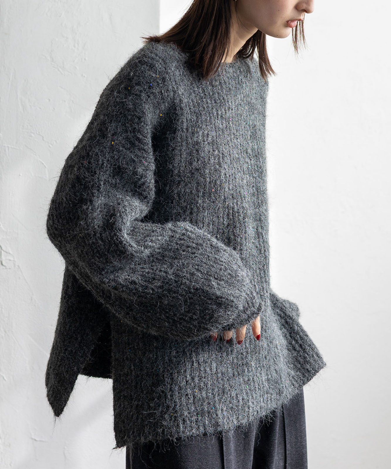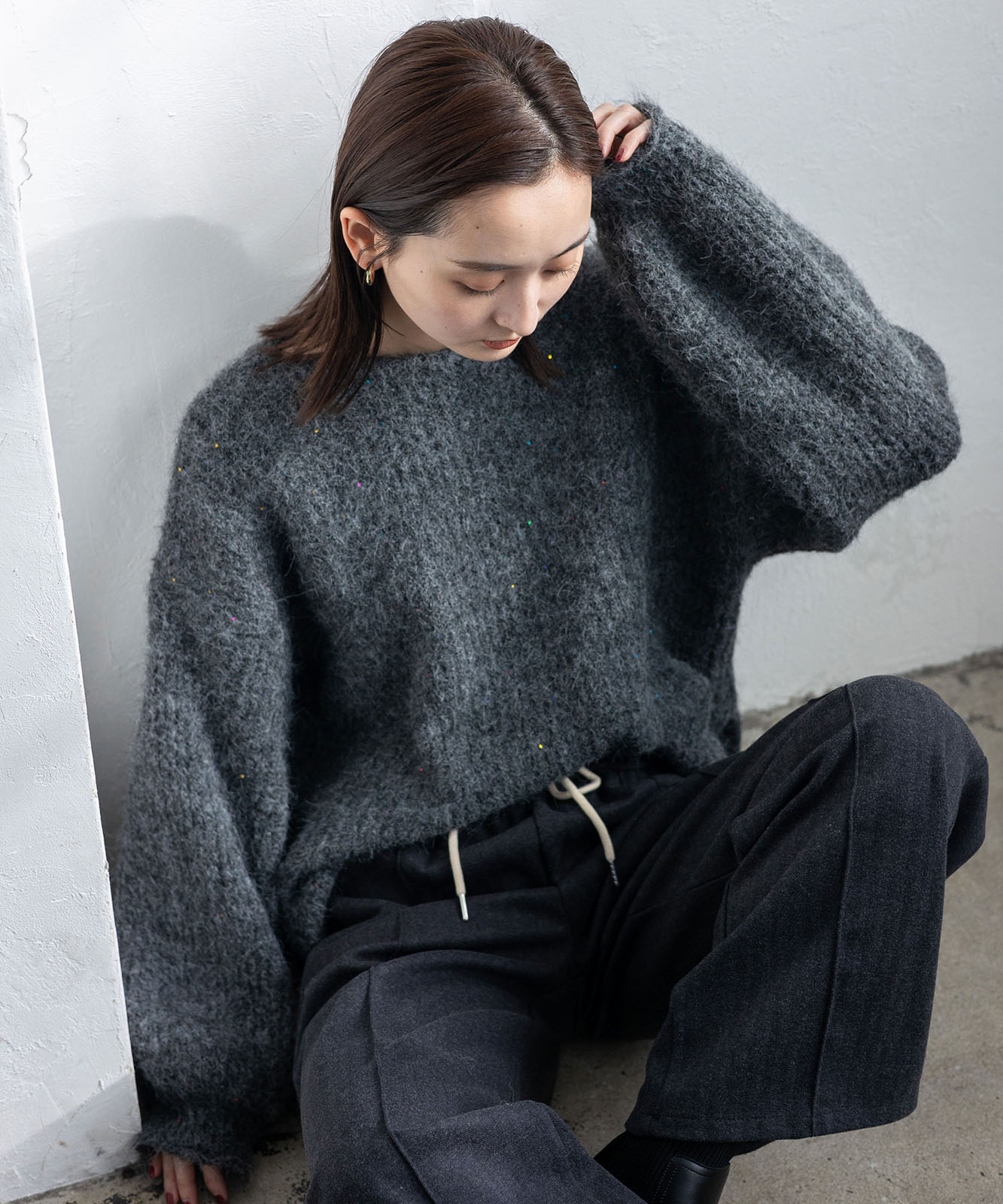 柔らかな起毛感がやさしい表情を生み、着るだけでシーズンムードを引き立てます。