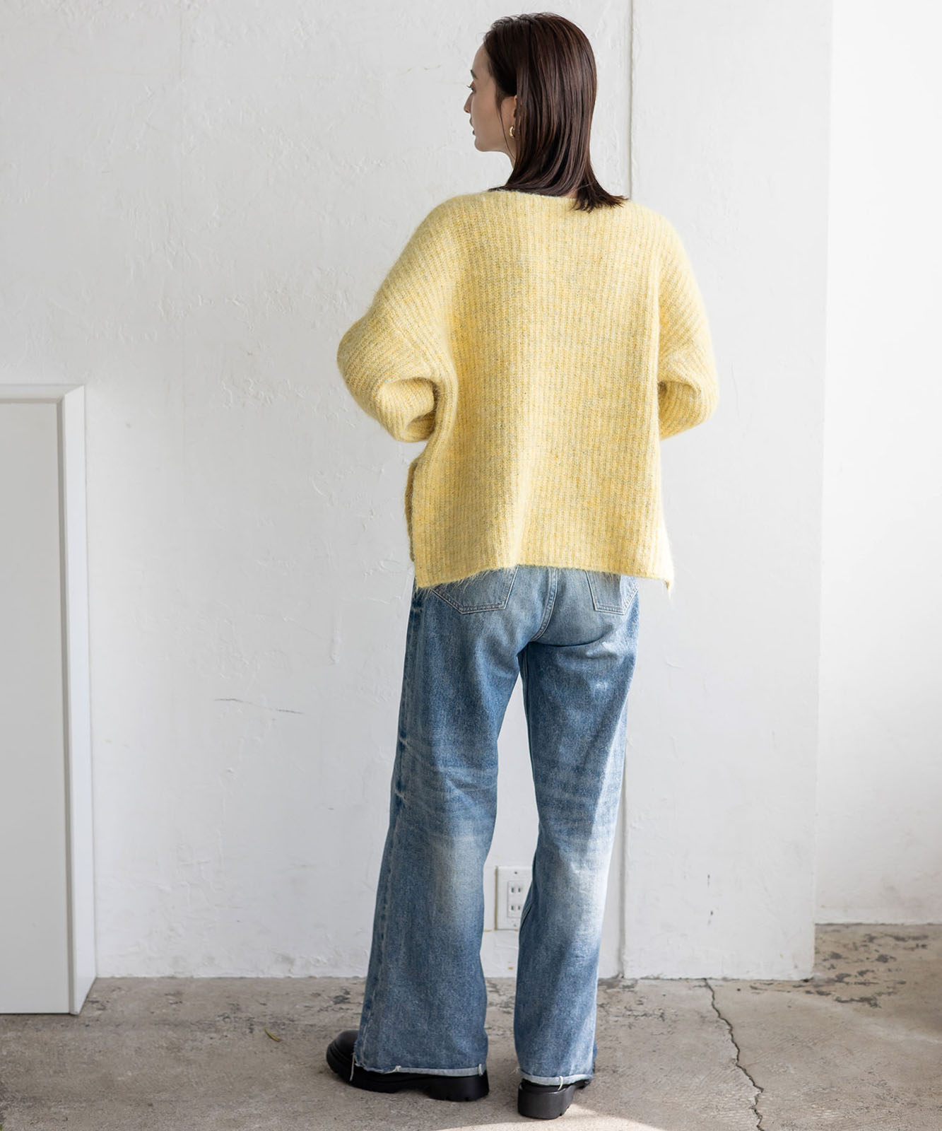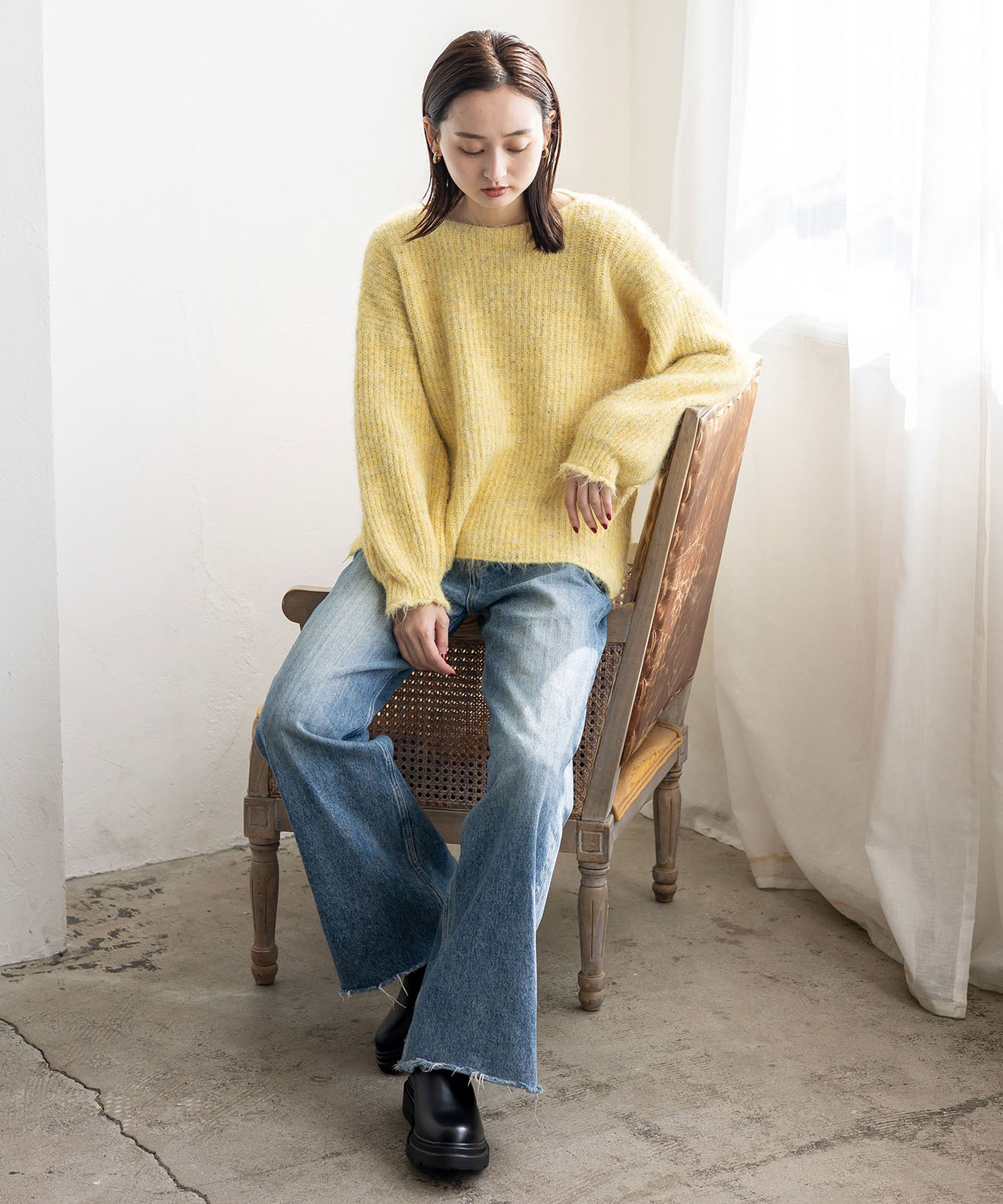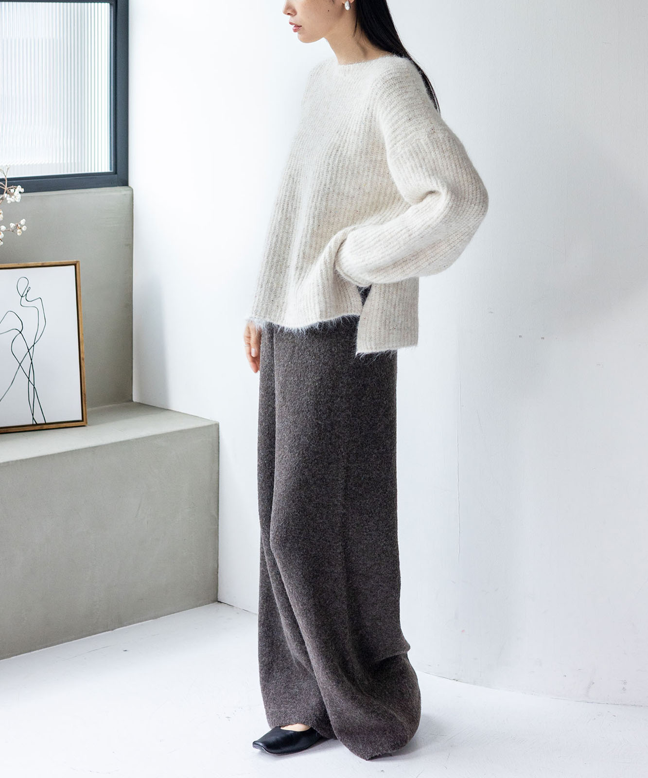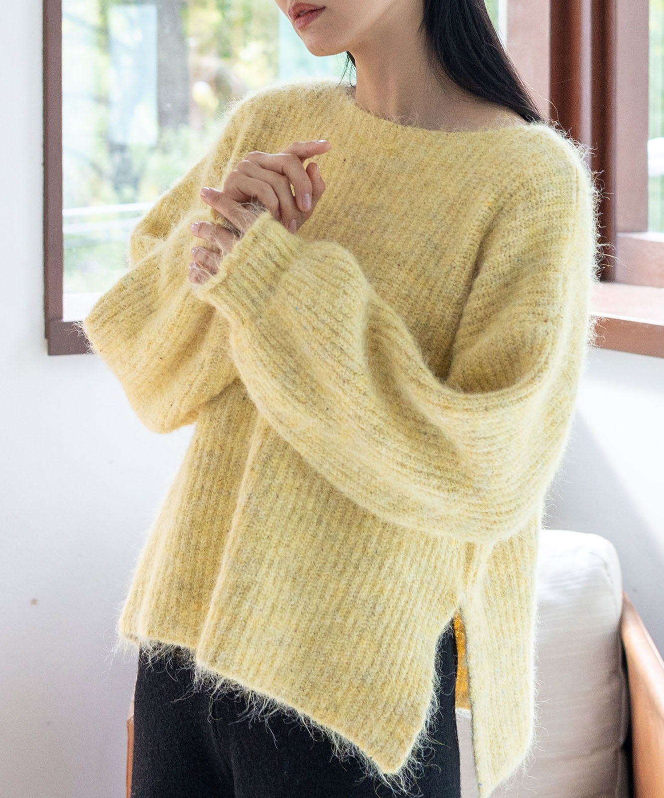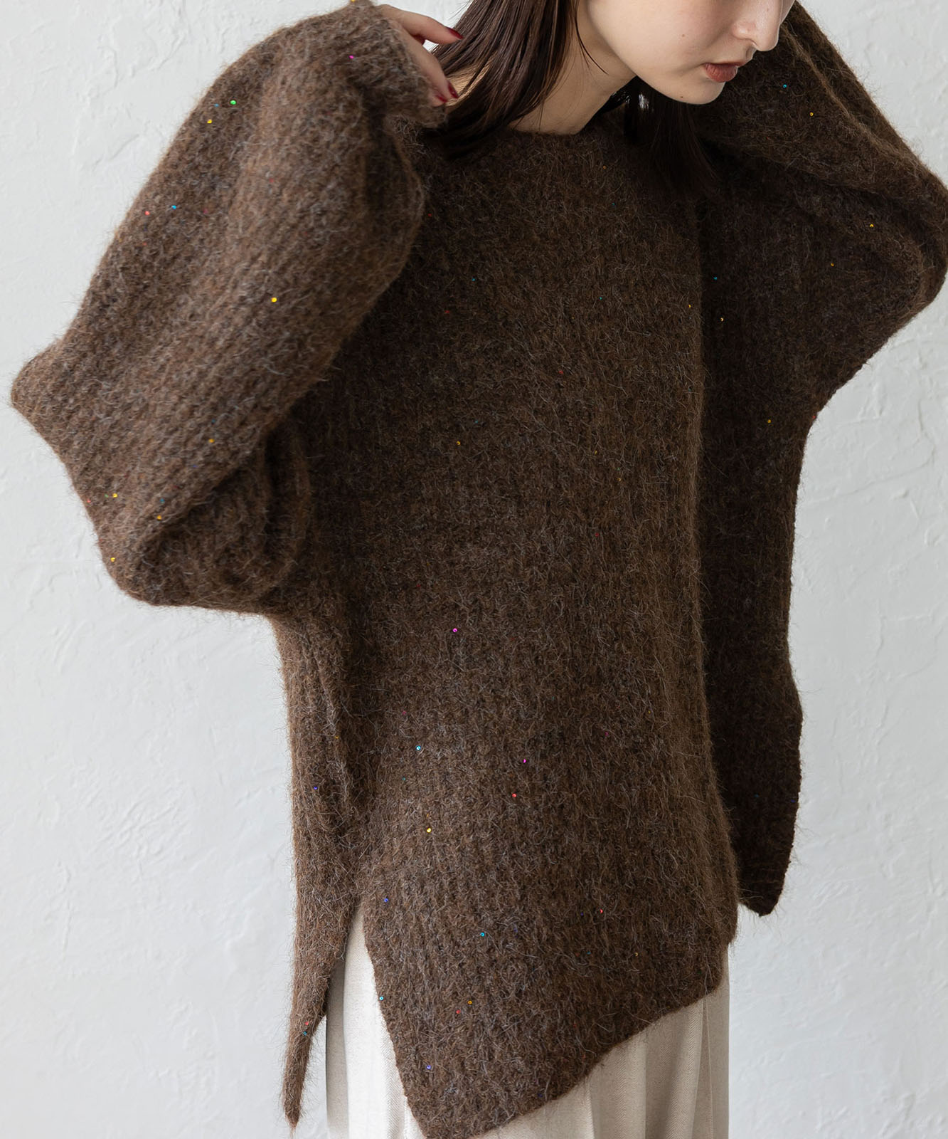 柔らかな起毛感がやさしい表情を生み、着るだけでシーズンムードを引き立てます。