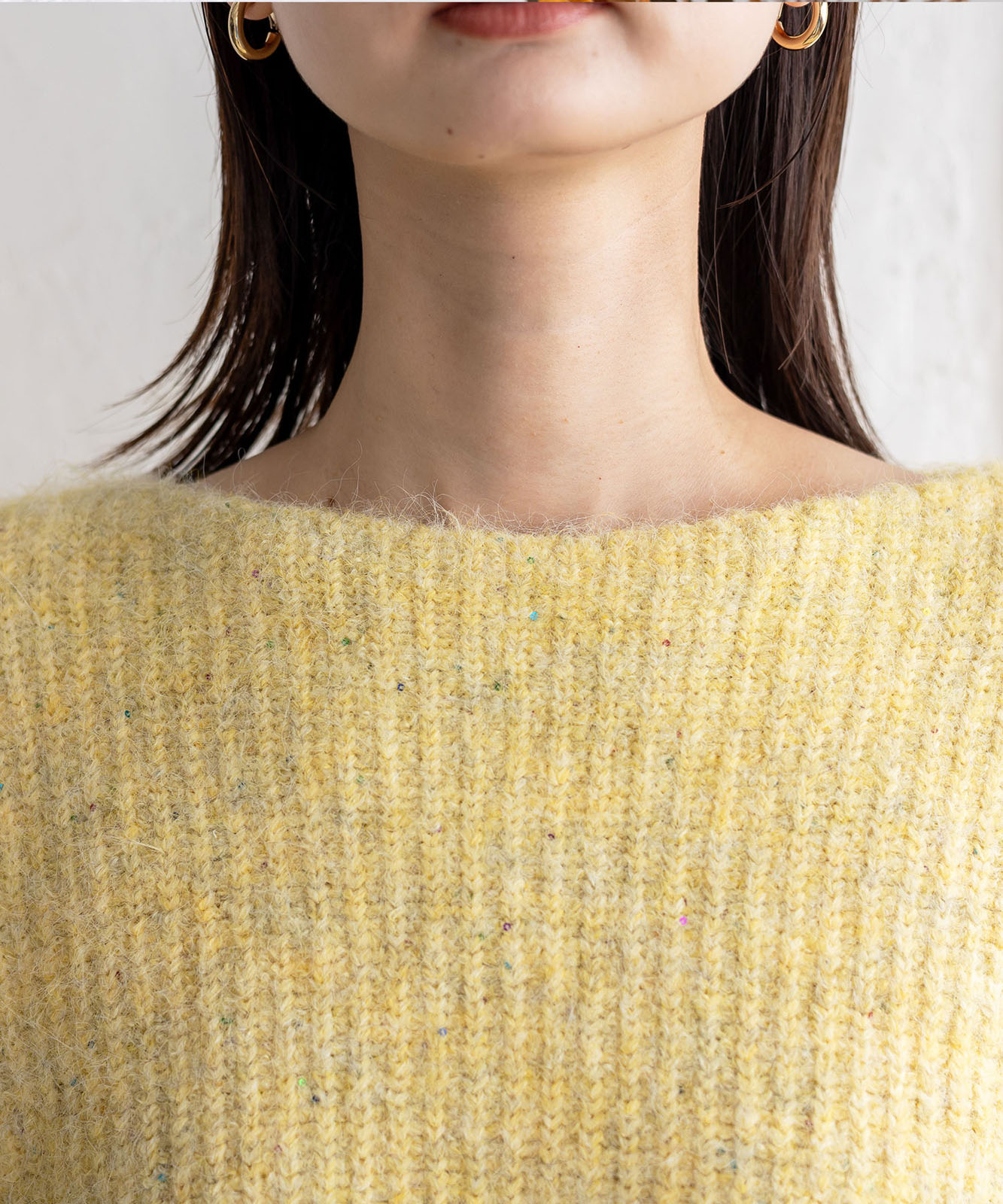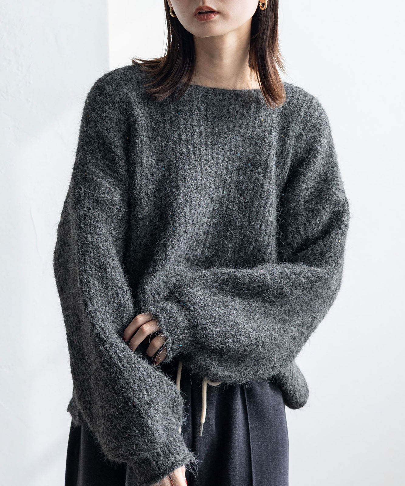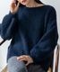 首元をすっきり見せるボートネック仕様。顔まわりをシャープに見せつつ、女性らしい抜け感を演出。