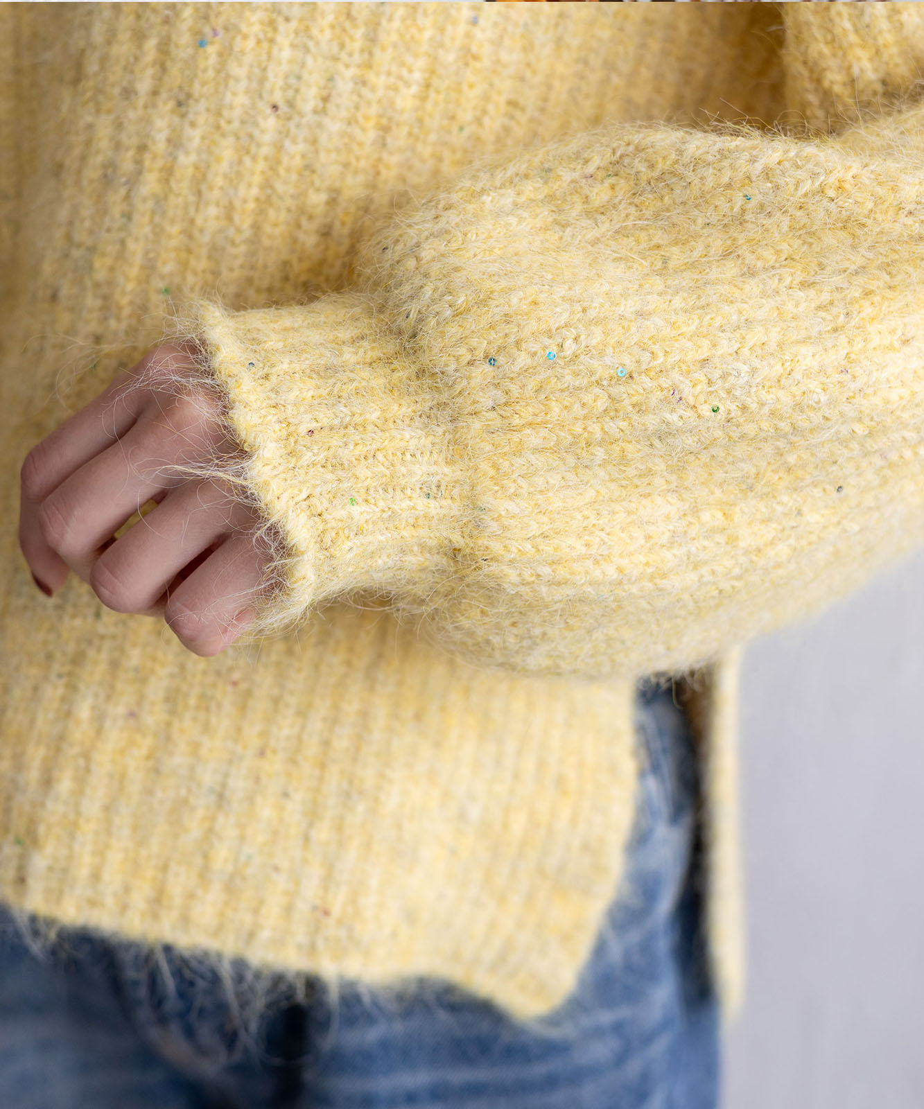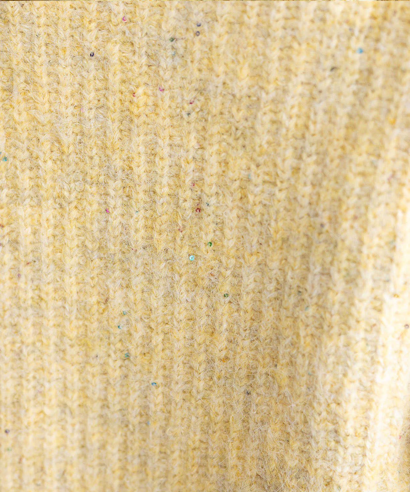 カラフルで繊細なスパンコールを編み込み、冬の装いに華やぎとあたたかみをプラスするラメニットトップス。