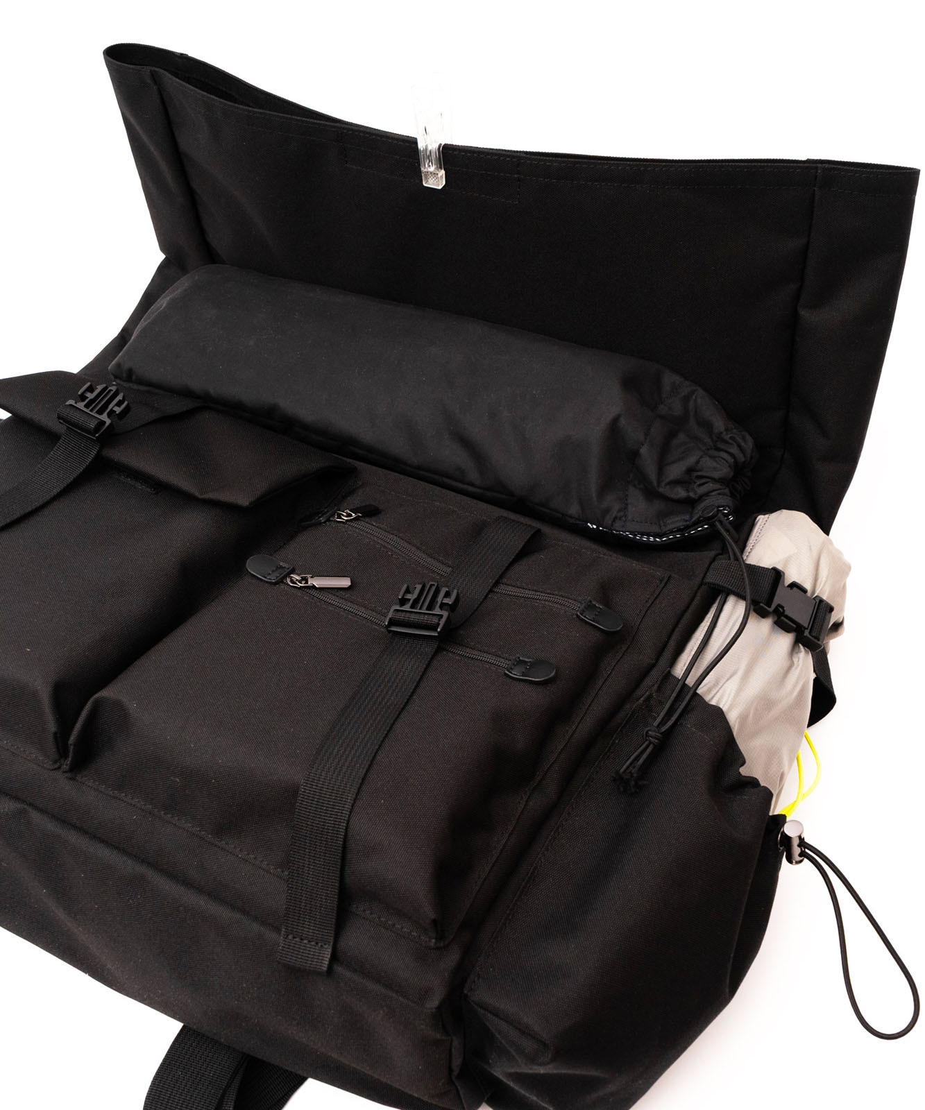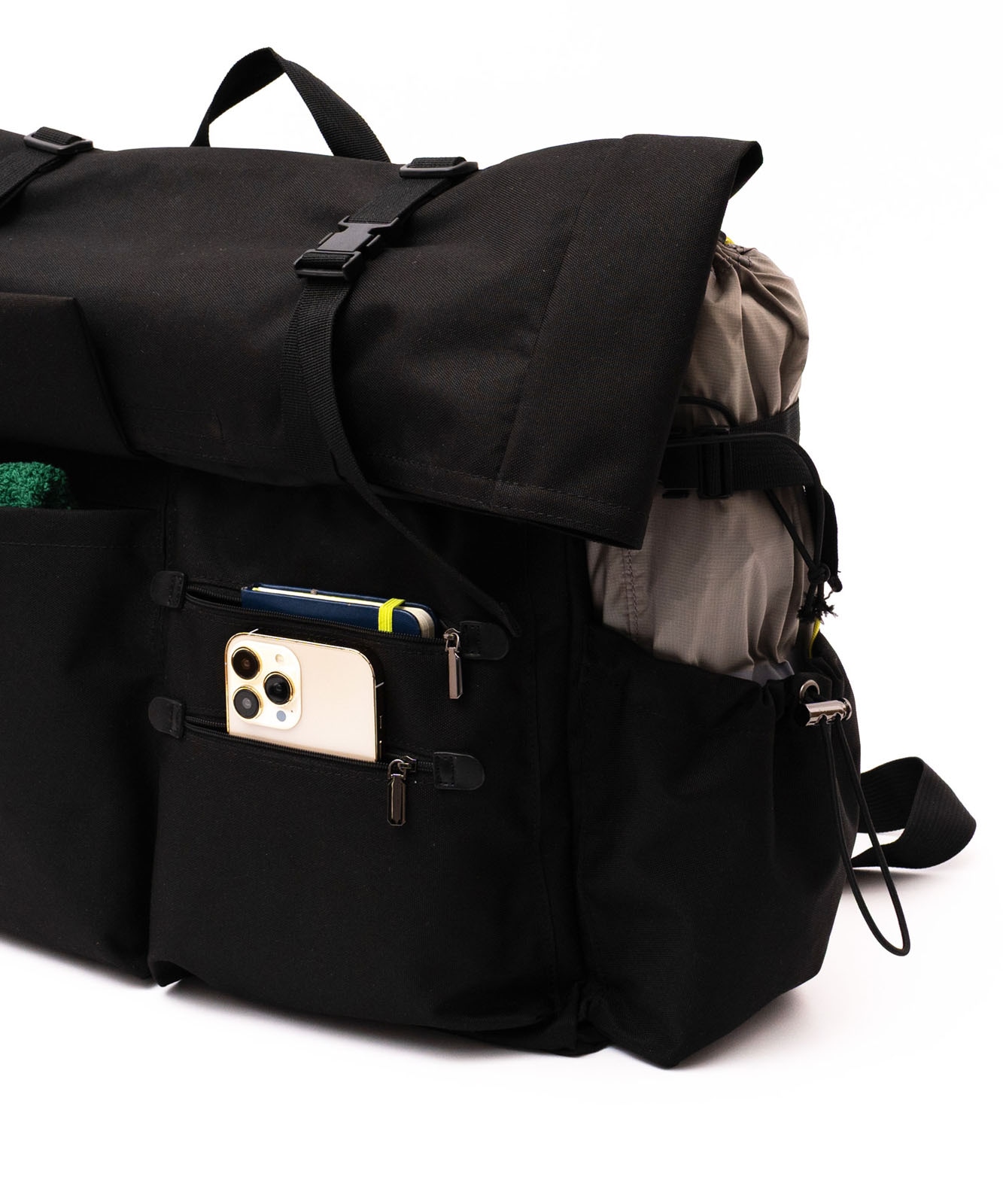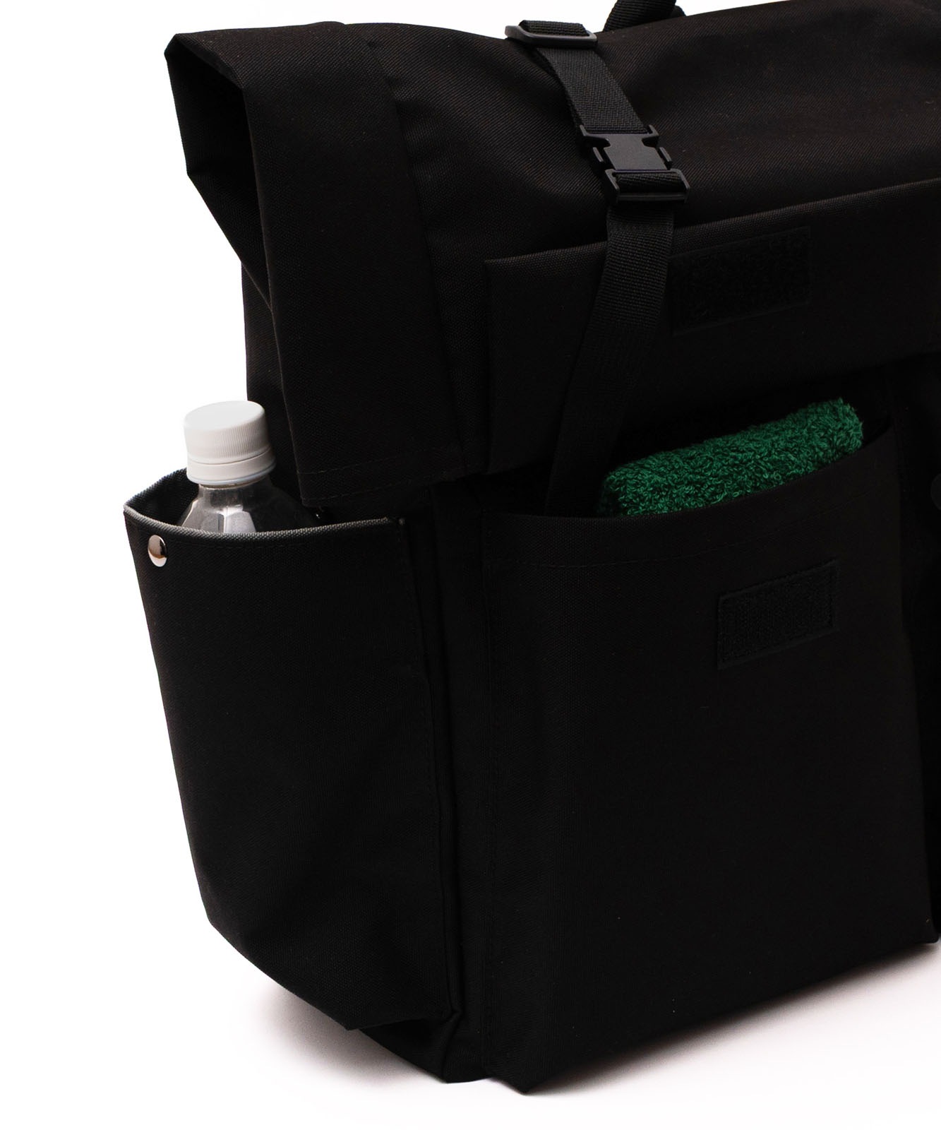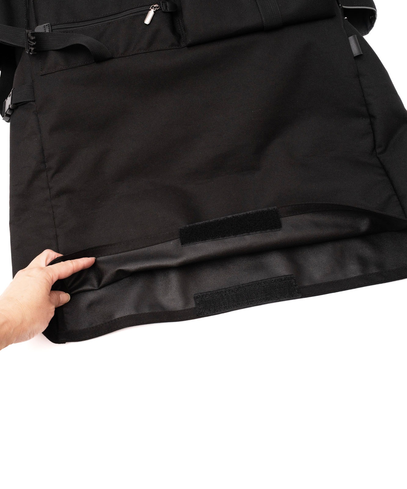 マチポケットの片方はゴム紐と調整可能な固定用のベルト付き、もう片方はマグホック仕様です。