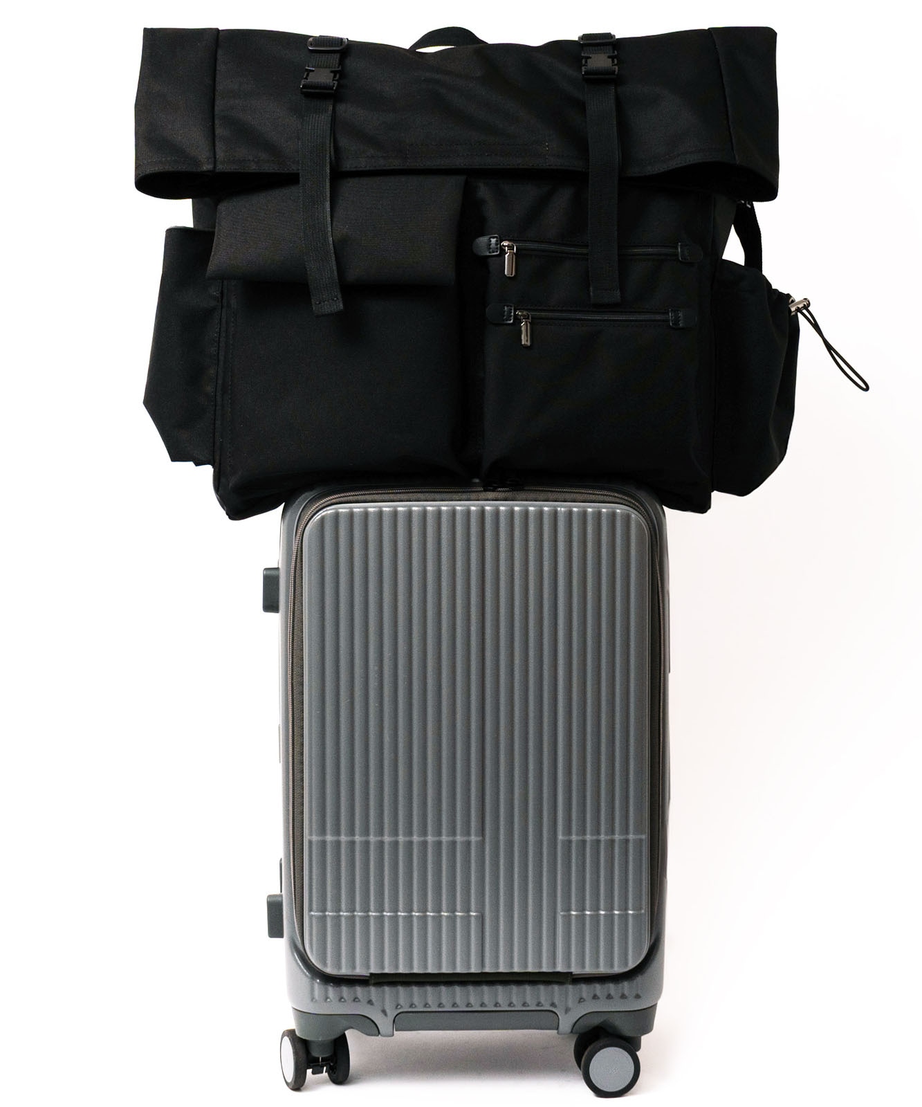 背面にキャリバー通しが付いているのでスーツケースのハンドルに差し込みが可能です。