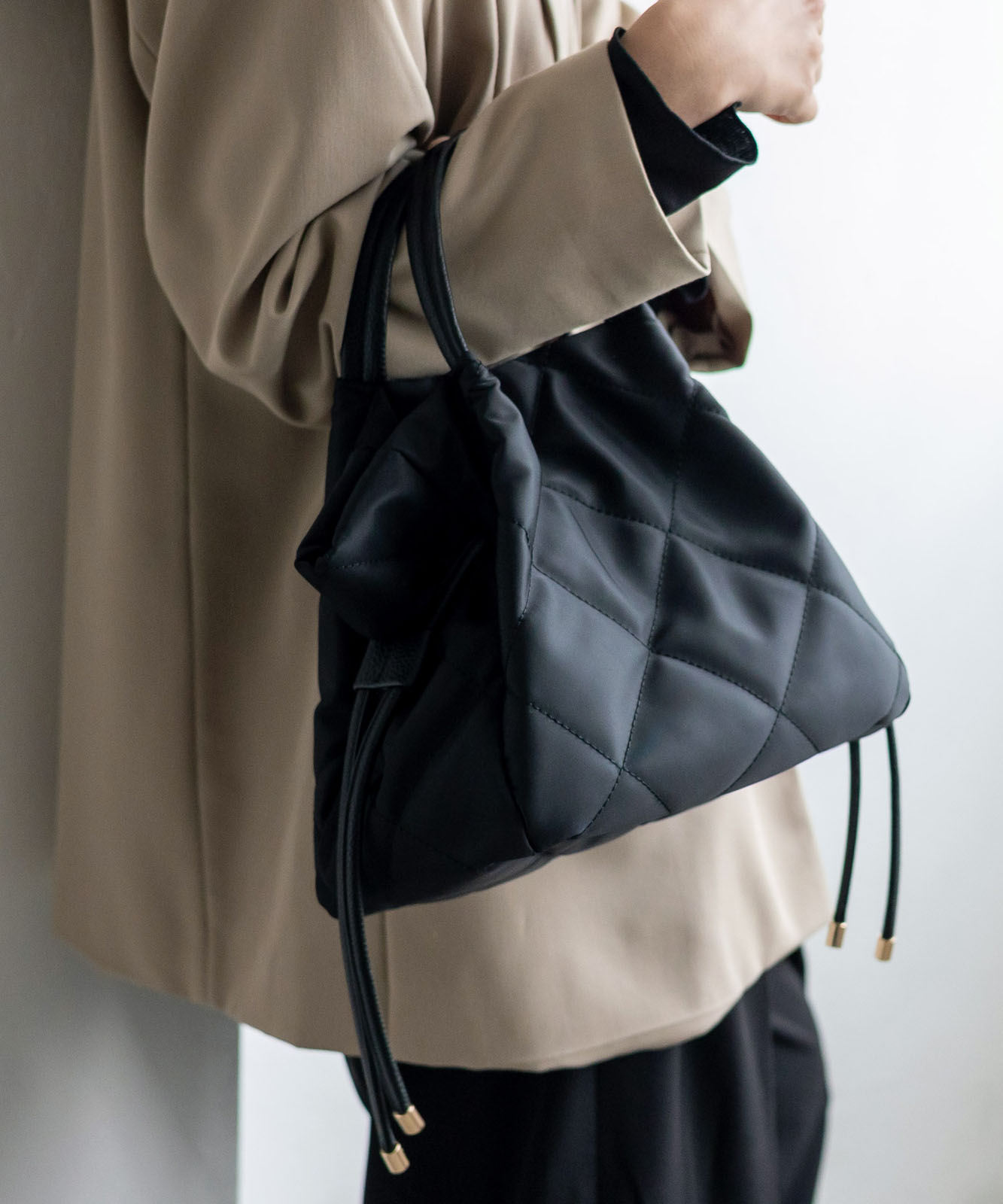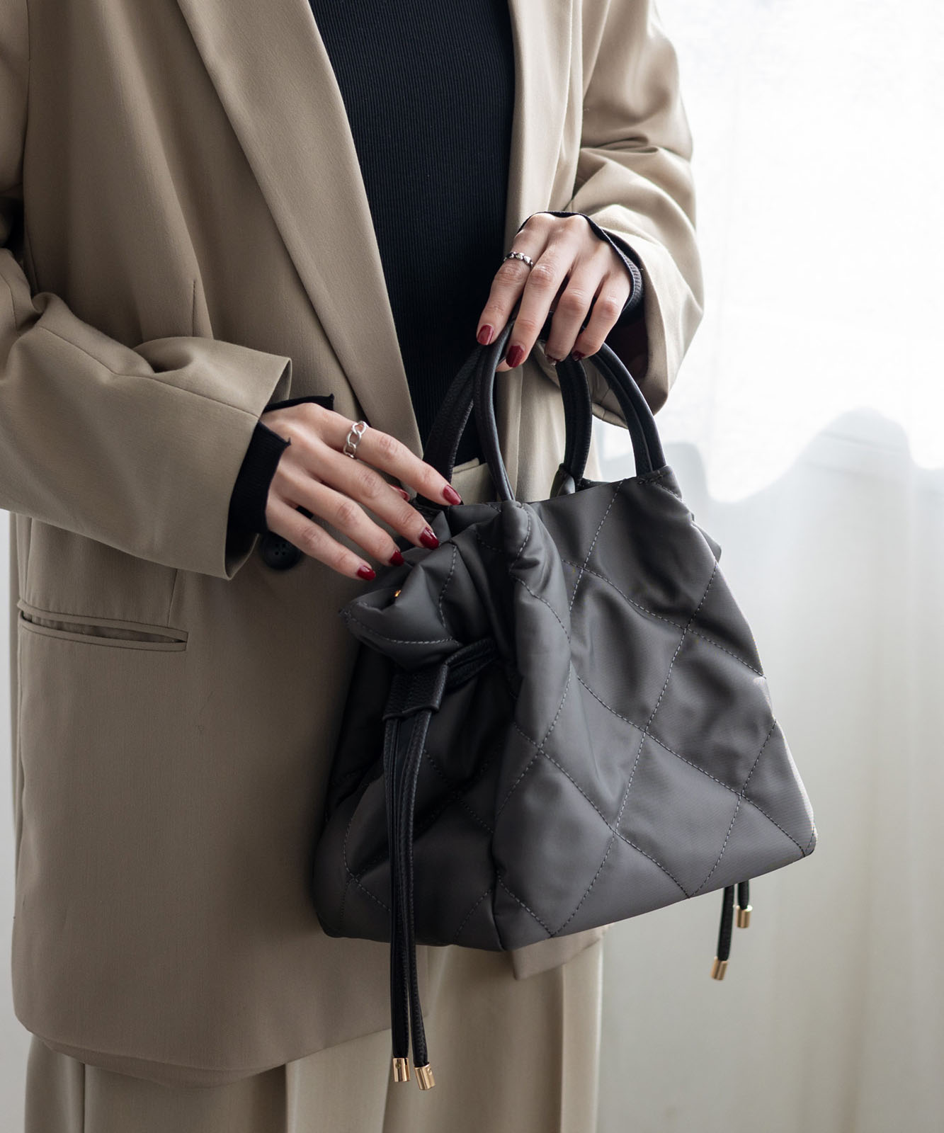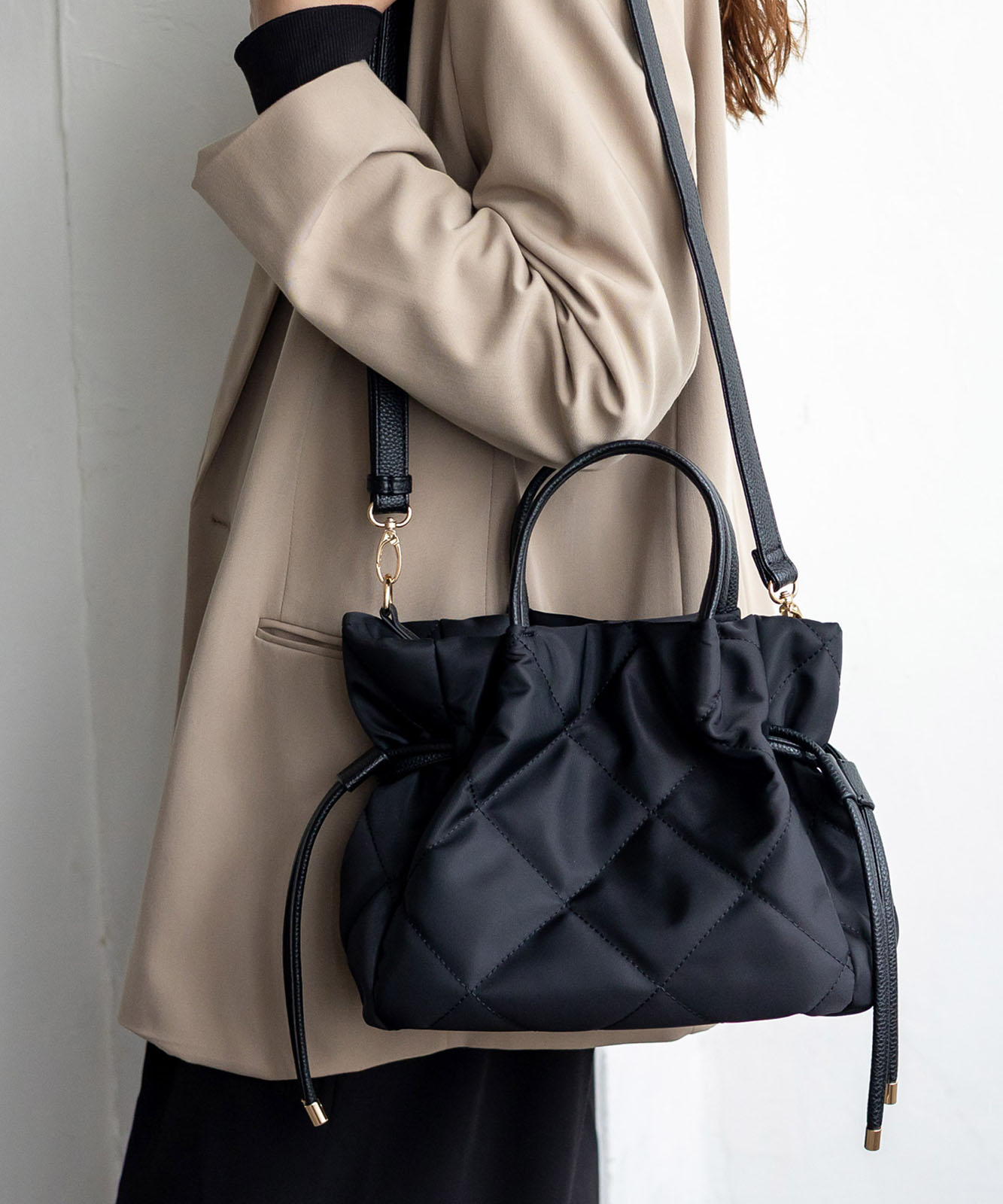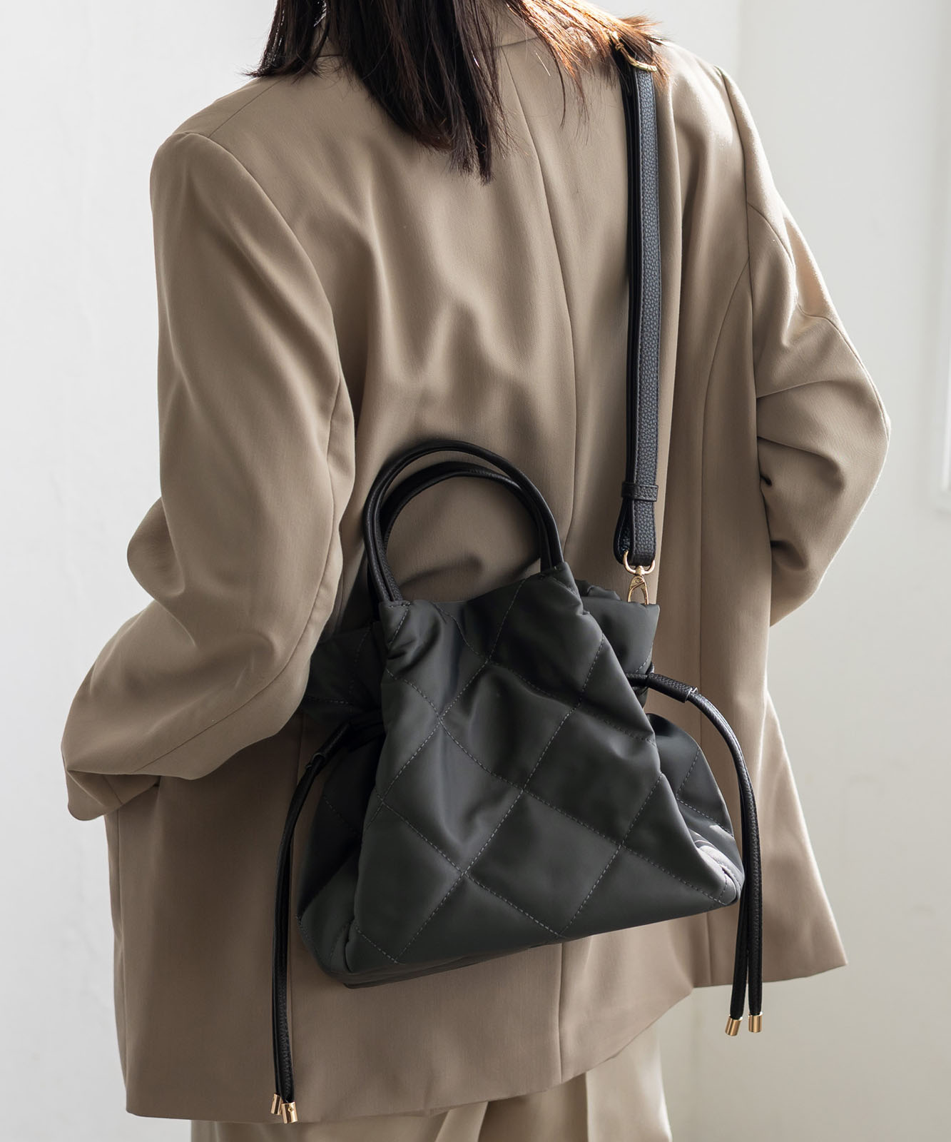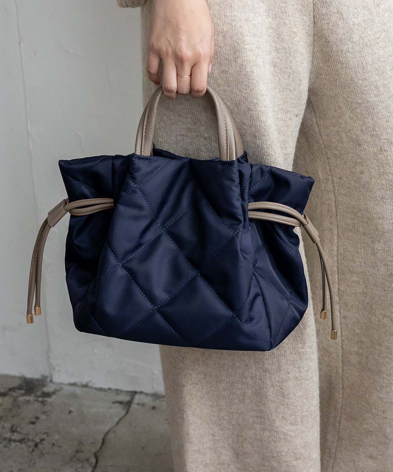 ●高密度ナイロン使用キルティング加工を施した丈夫な高密度ナイロンを使用し、上品で優しい雰囲気のバッグに仕上げました。