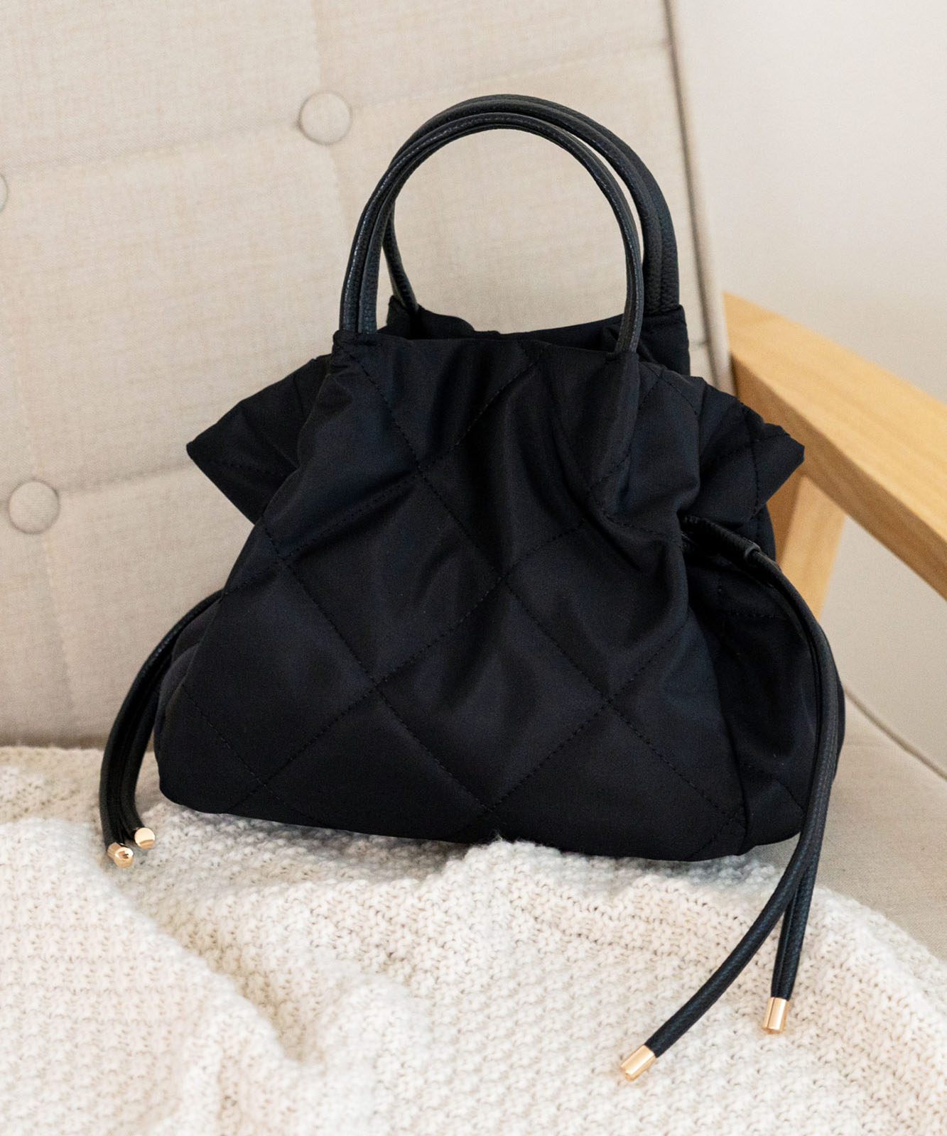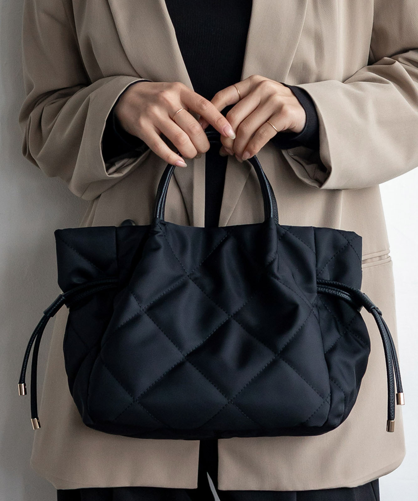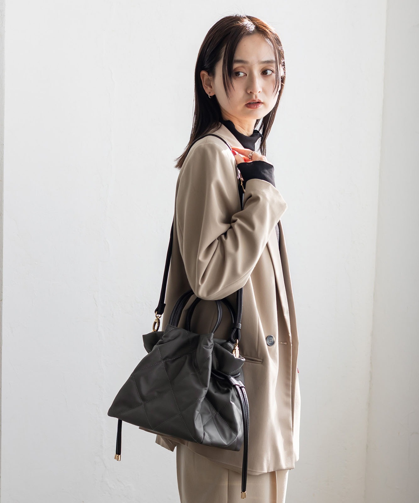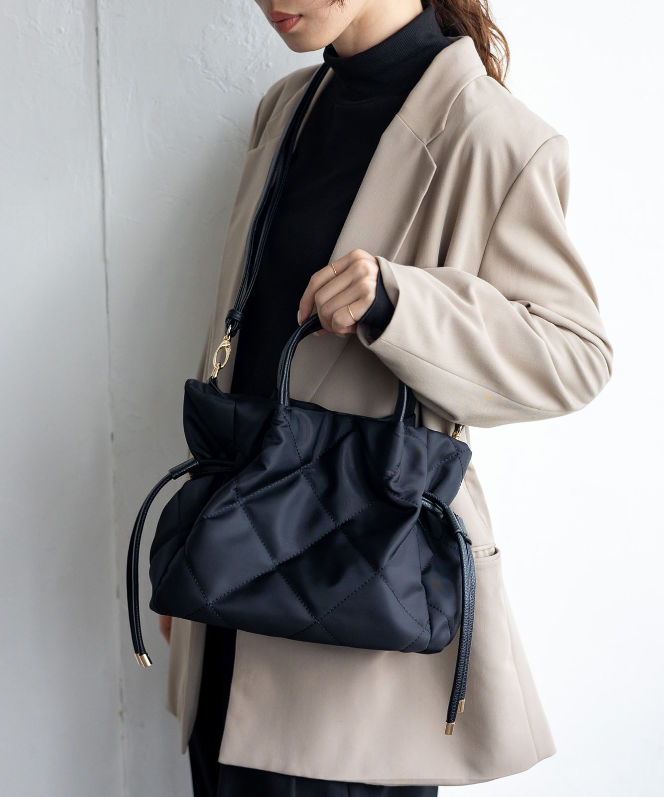 ●高密度ナイロン使用キルティング加工を施した丈夫な高密度ナイロンを使用し、上品で優しい雰囲気のバッグに仕上げました。