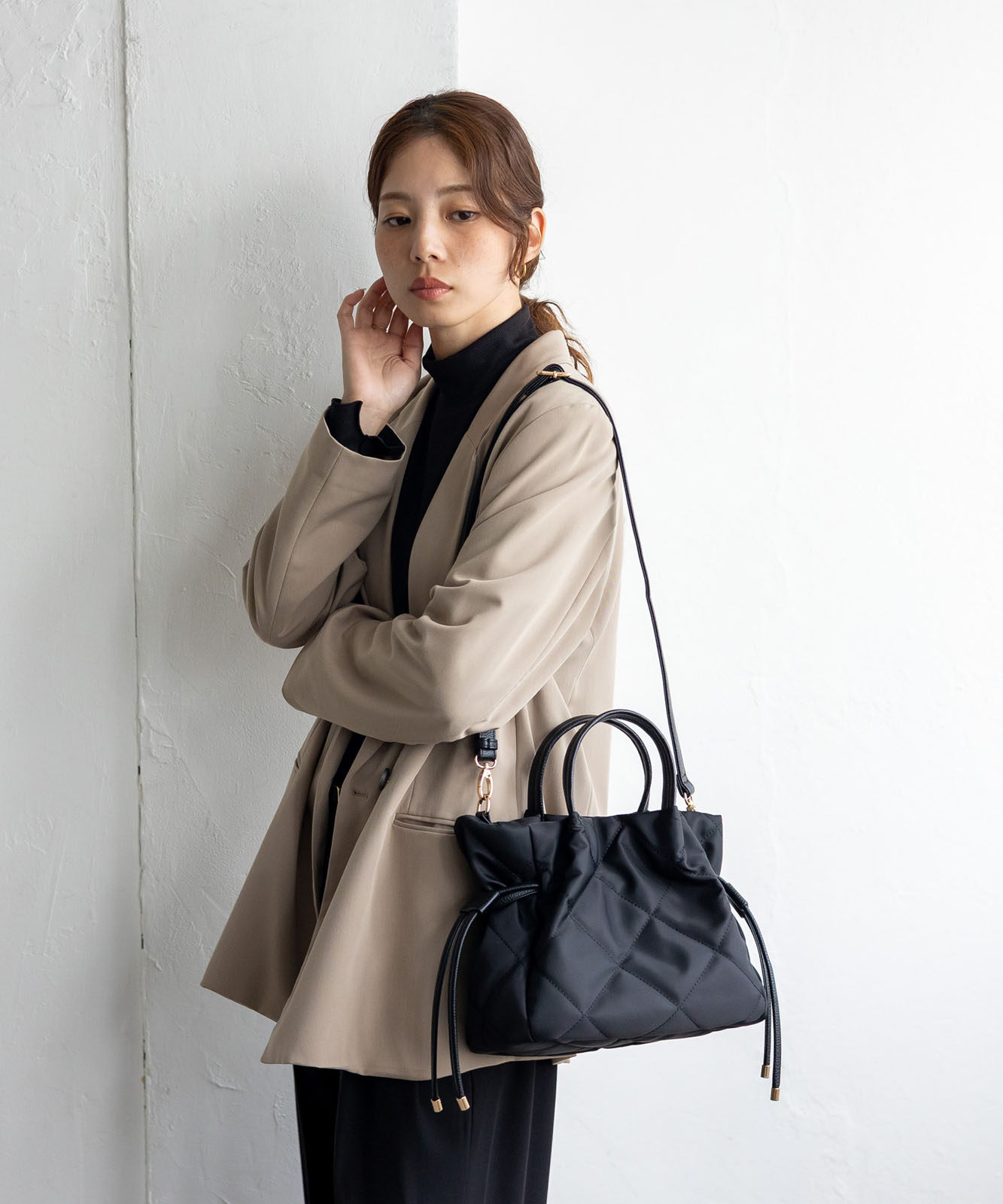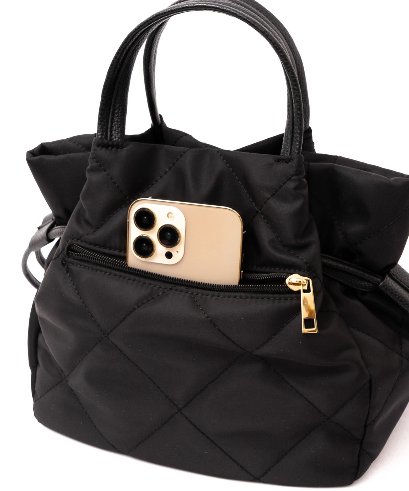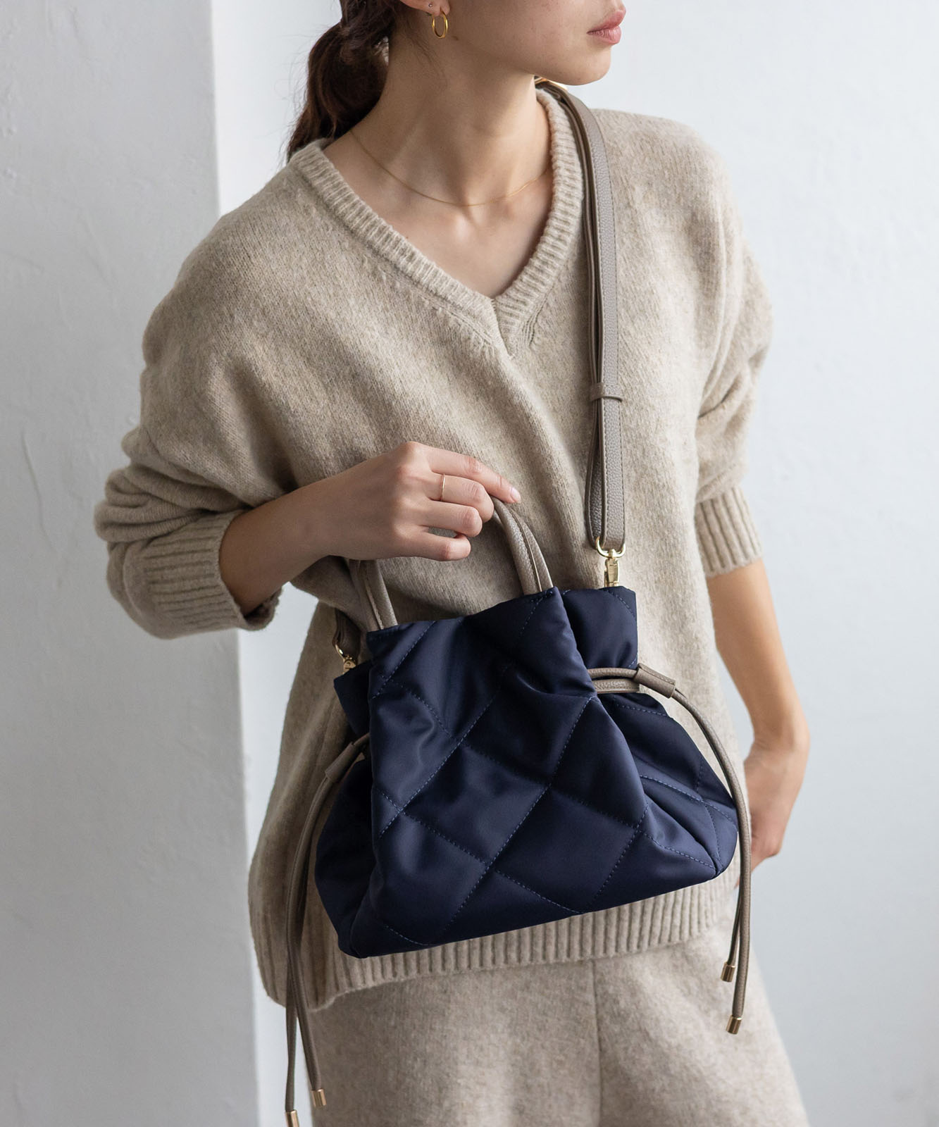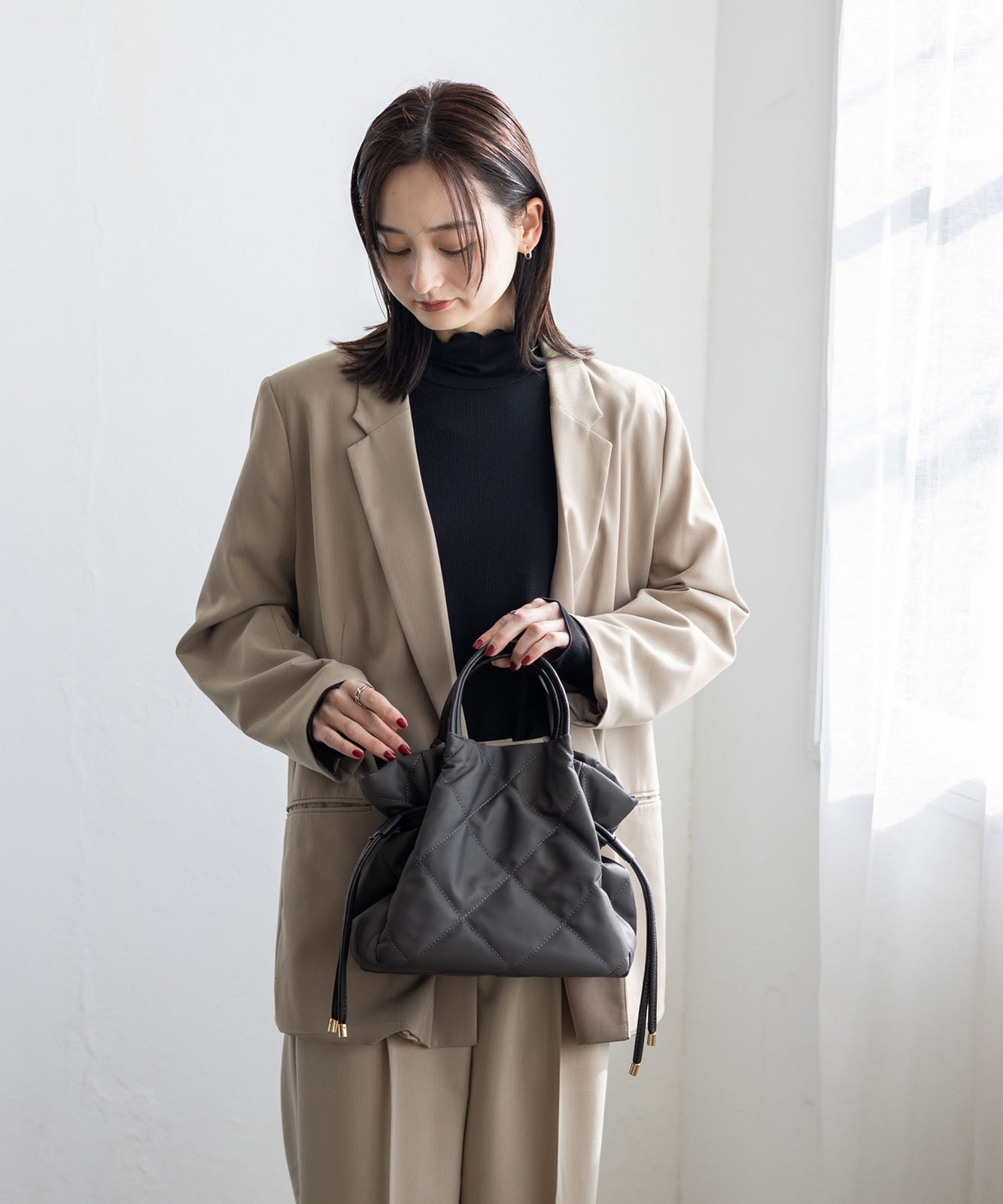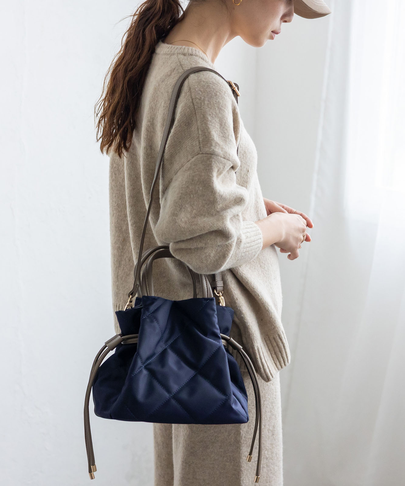 ●高密度ナイロン使用キルティング加工を施した丈夫な高密度ナイロンを使用し、上品で優しい雰囲気のバッグに仕上げました。