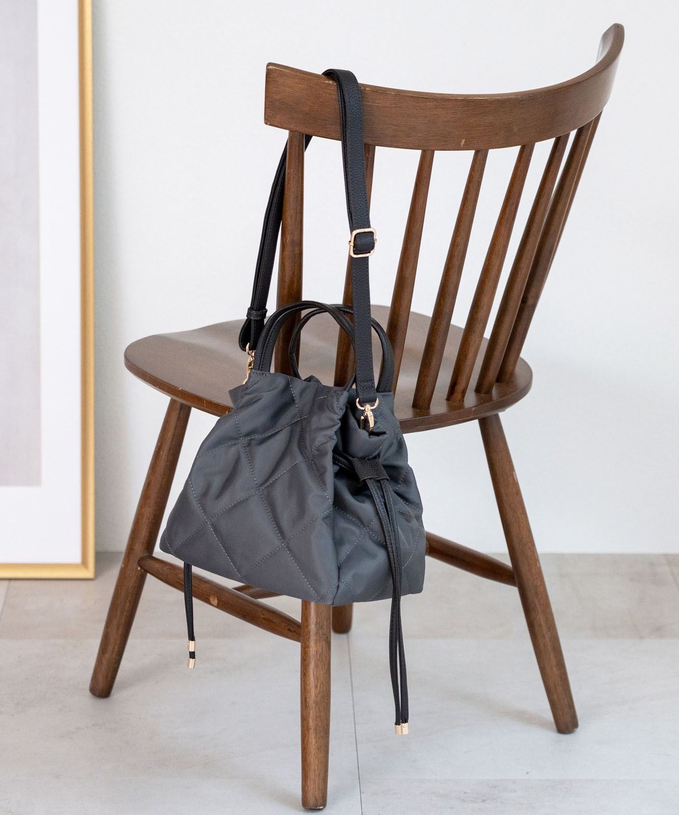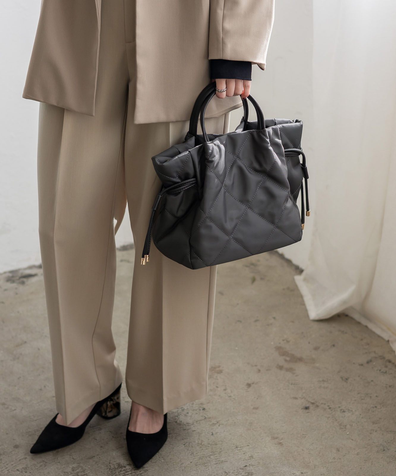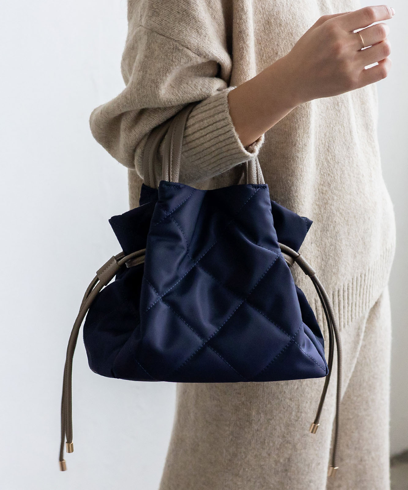 大人の遊び心を演出する巾着バッグ。