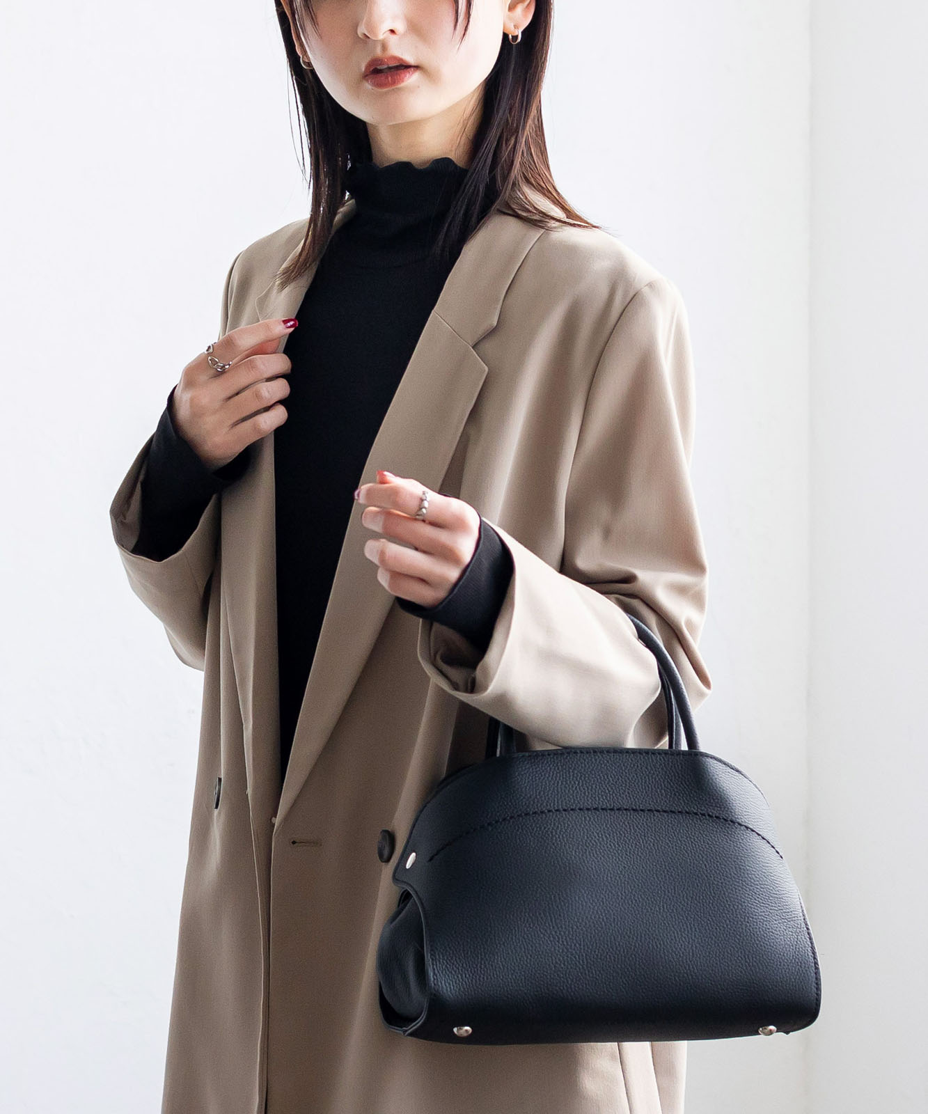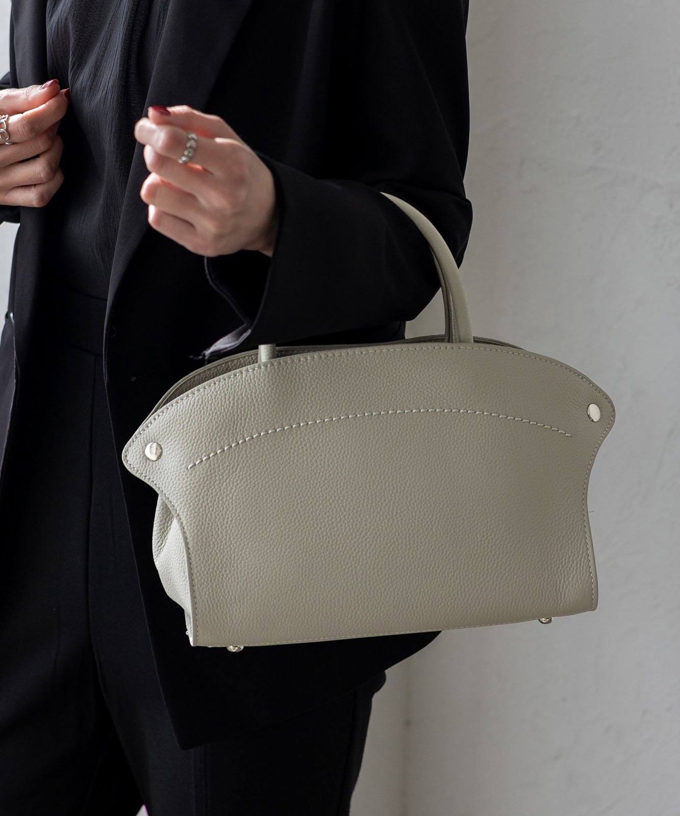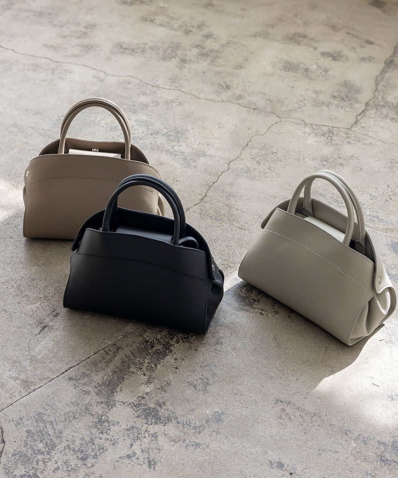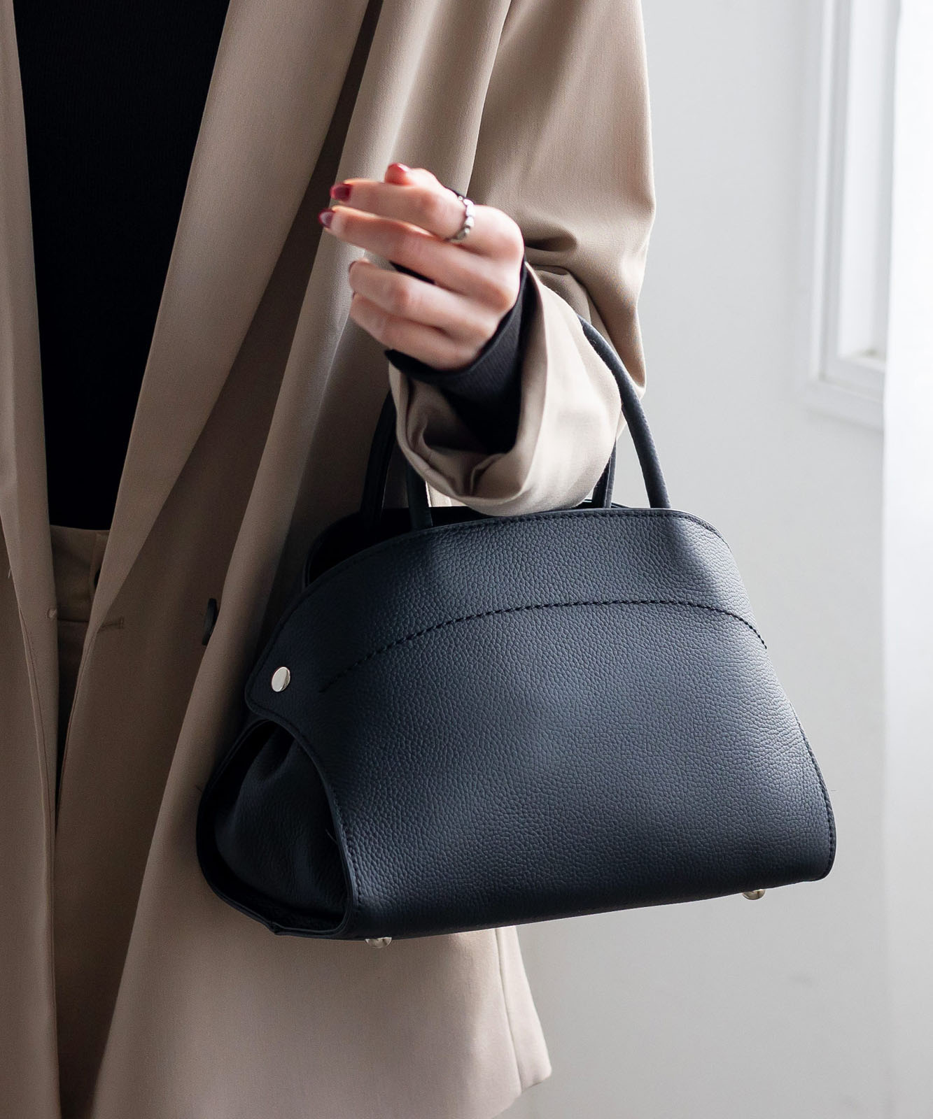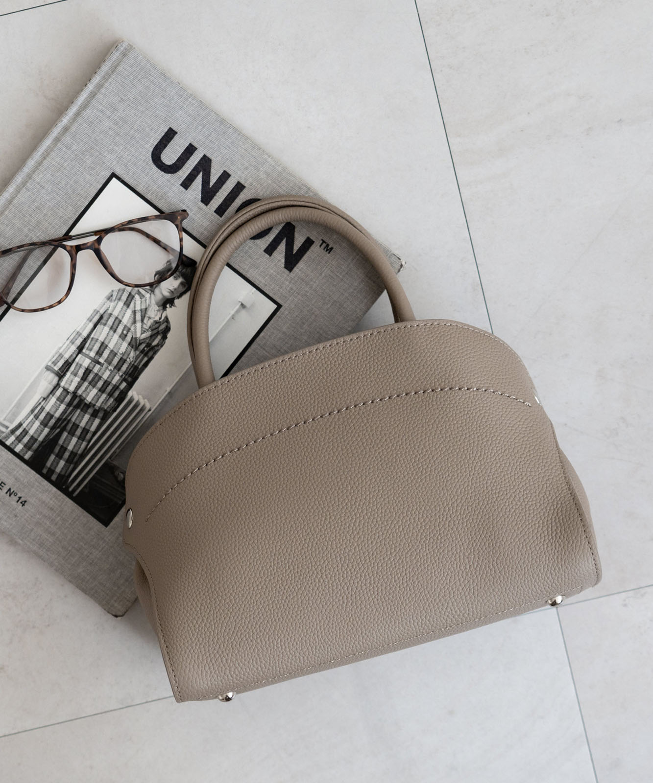 シンプルなラウンド型フォルムに、さりげないステッチがアクセントになった上品なハンドバッグ。