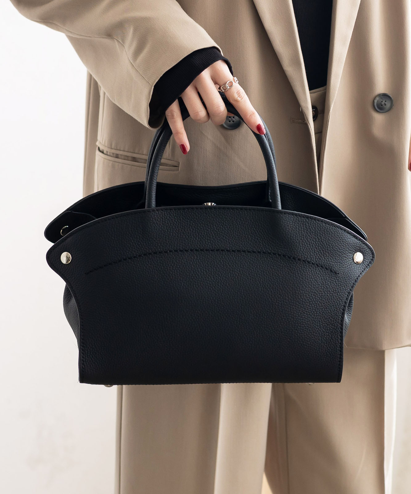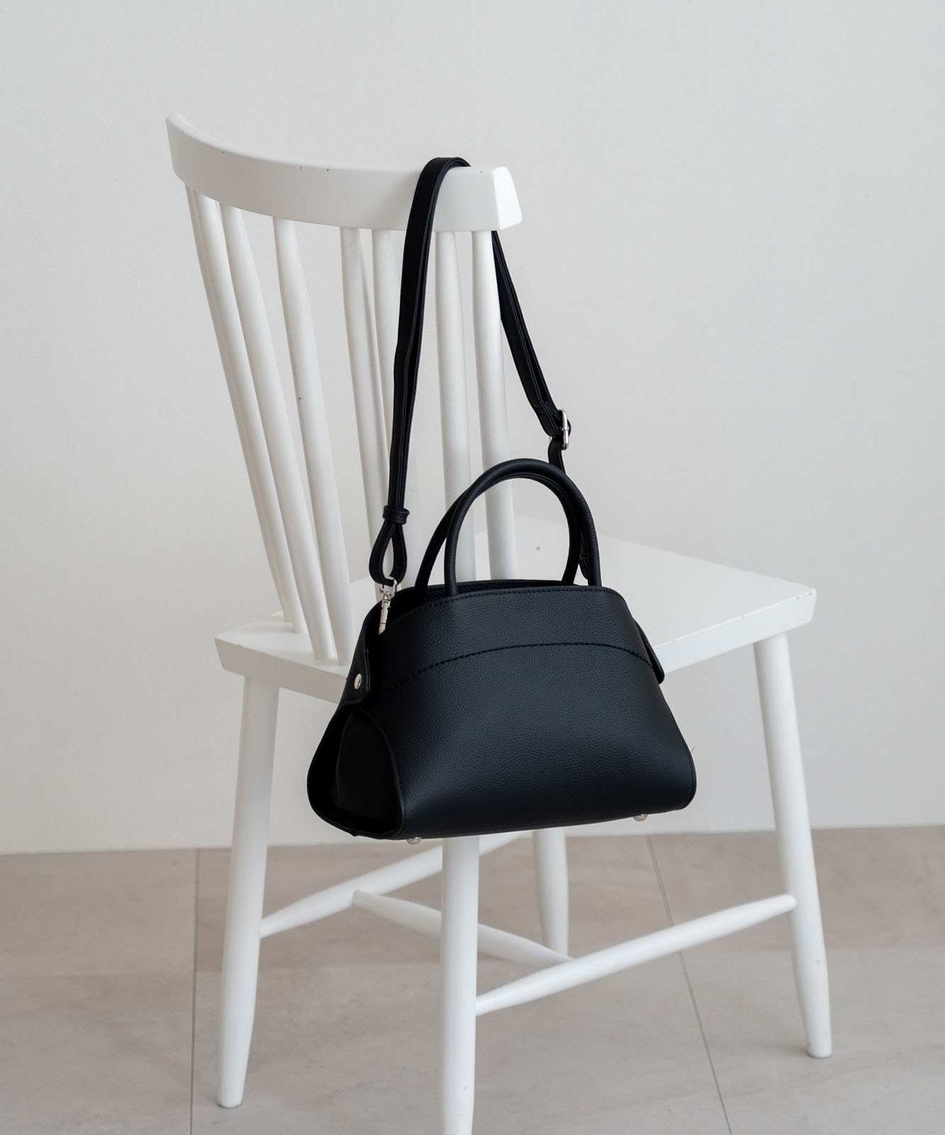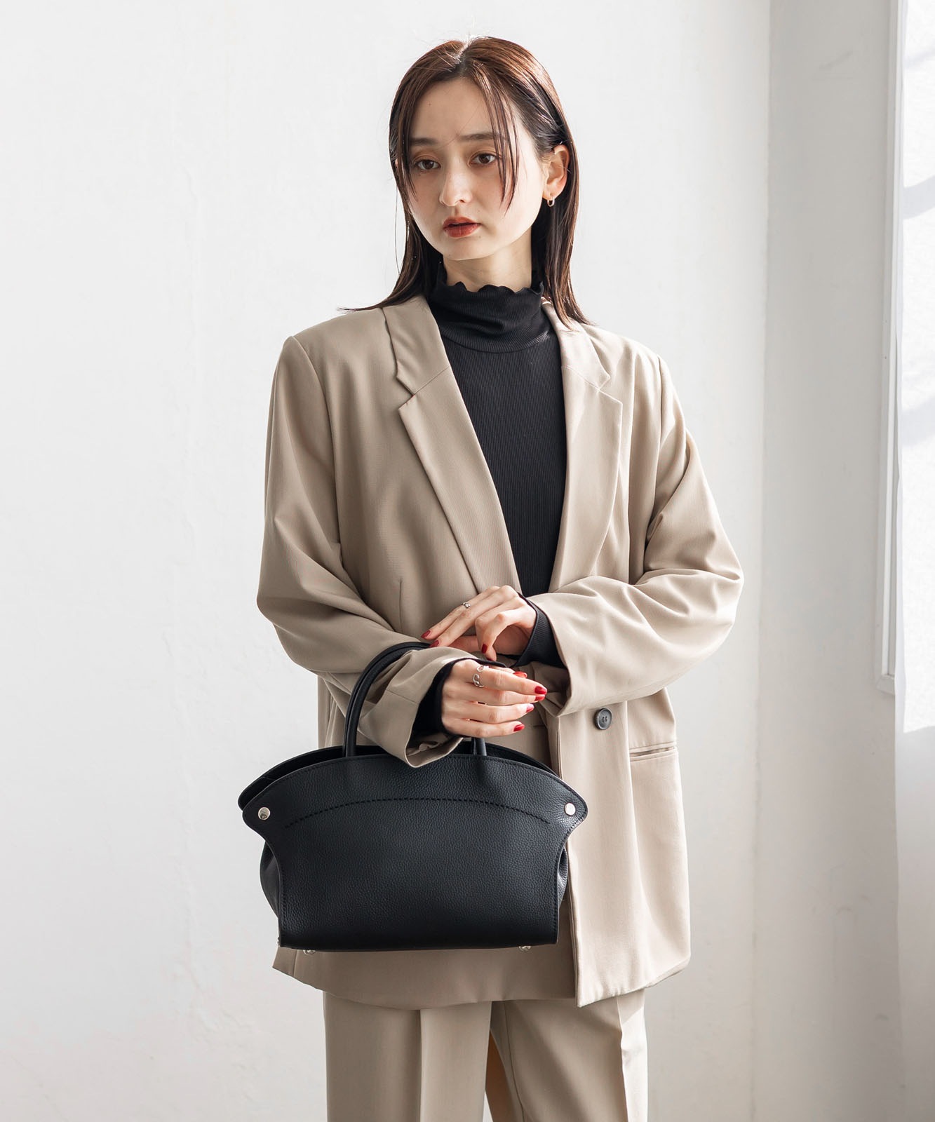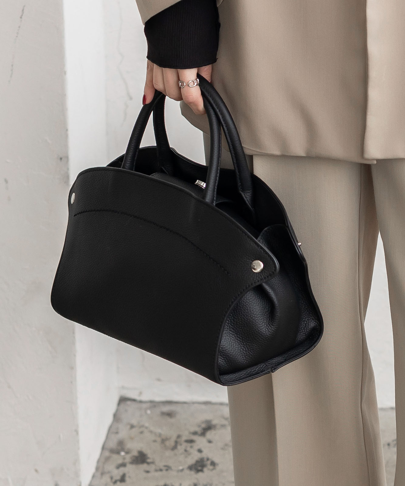 シンプルなラウンド型フォルムに、さりげないステッチがアクセントになった上品なハンドバッグ。