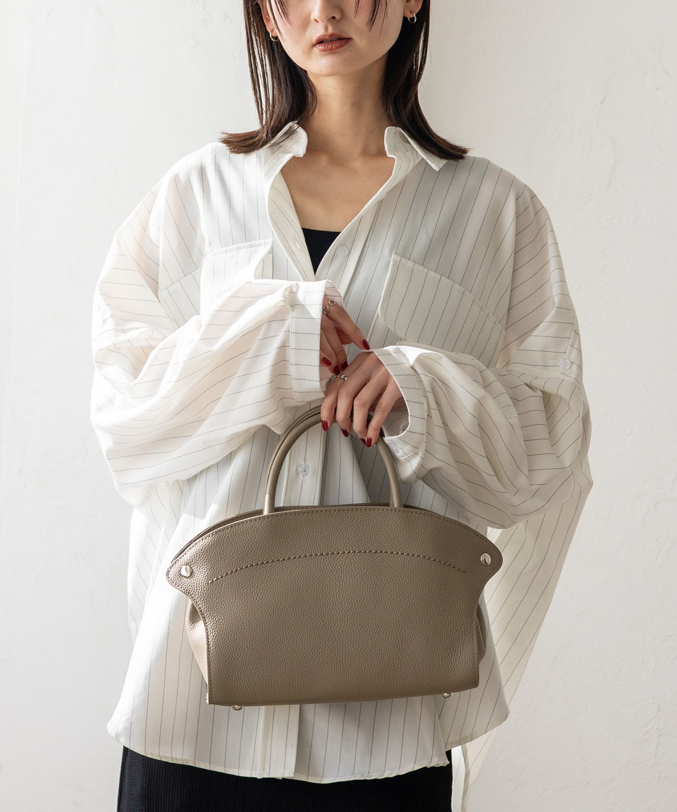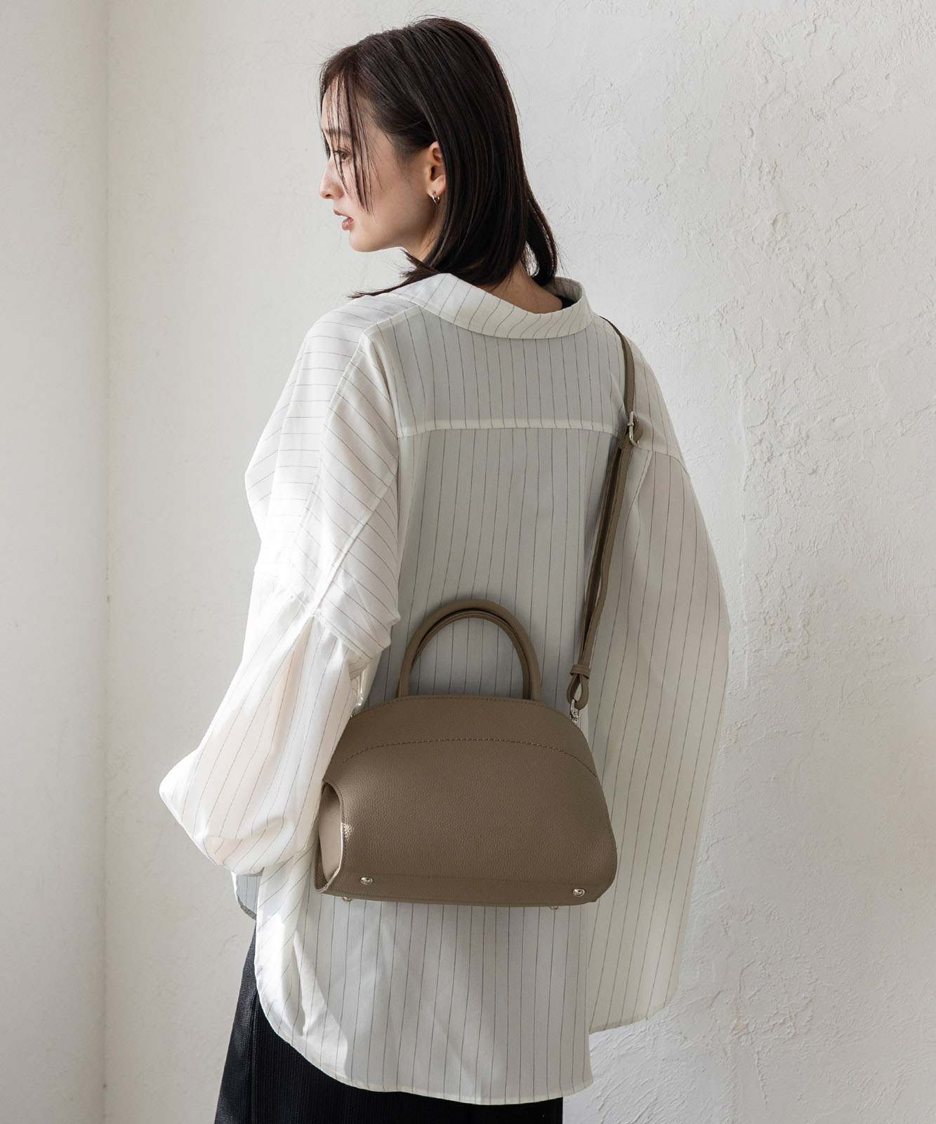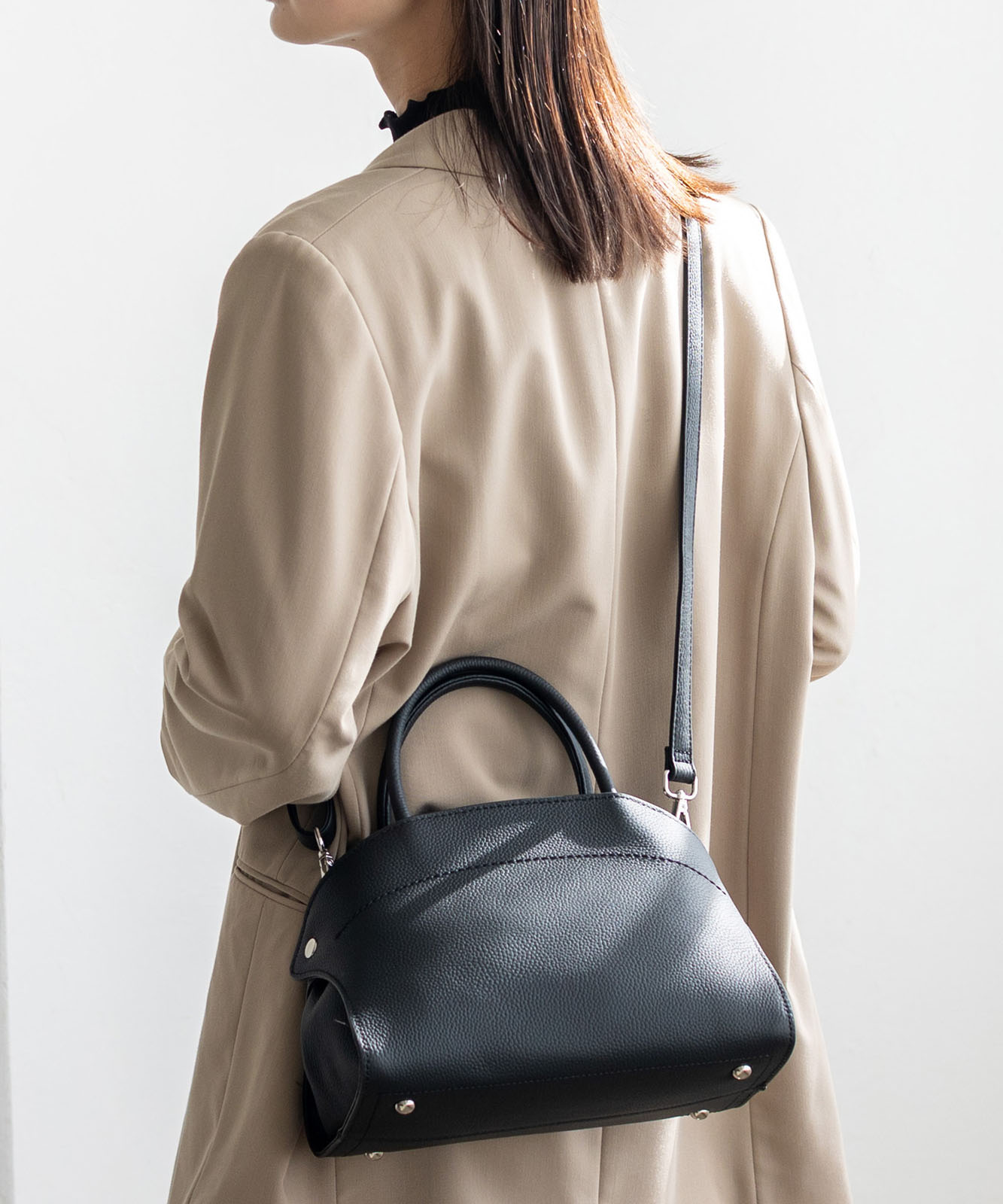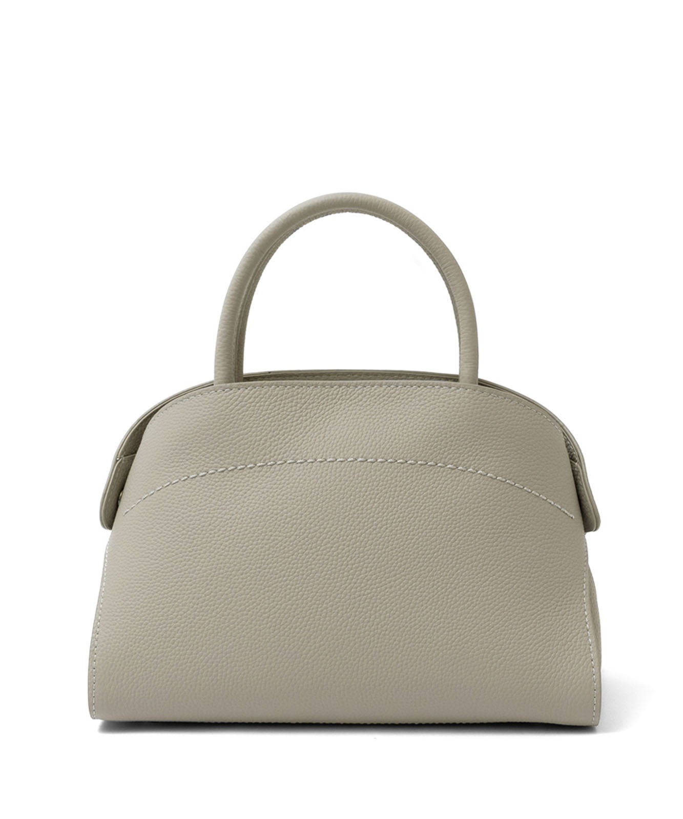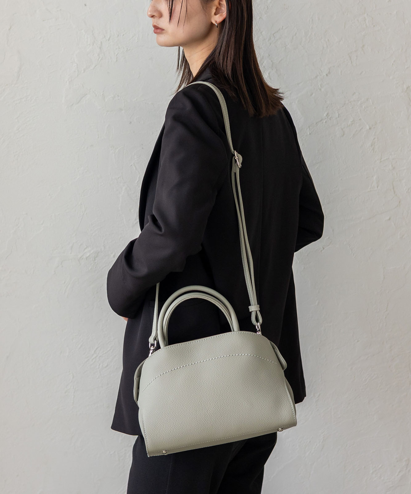 シンプルなラウンド型フォルムに、さりげないステッチがアクセントになった上品なハンドバッグ。