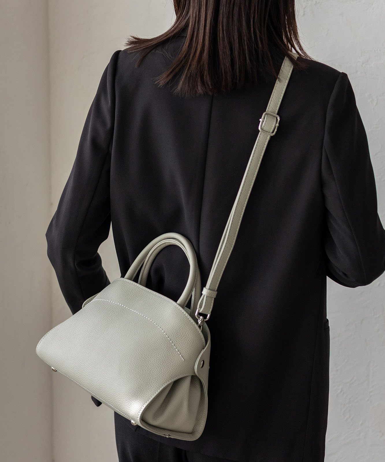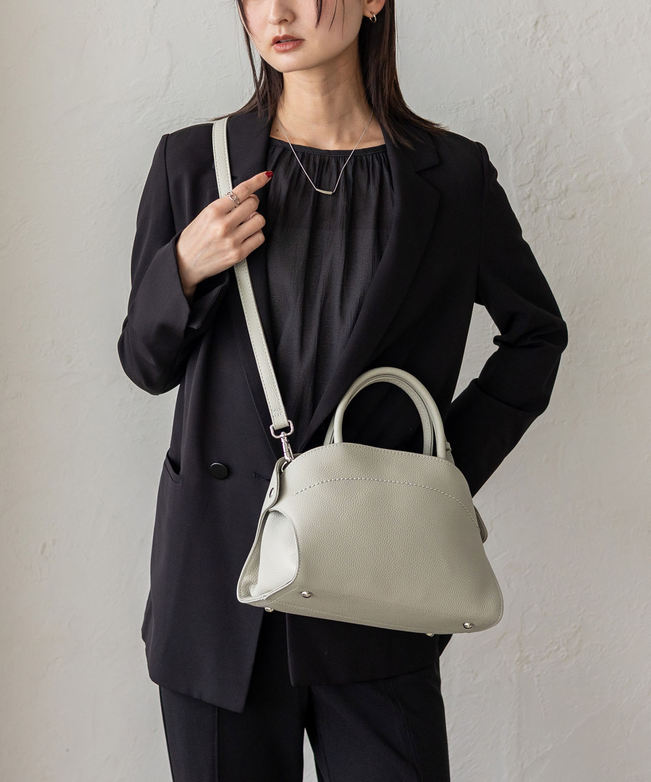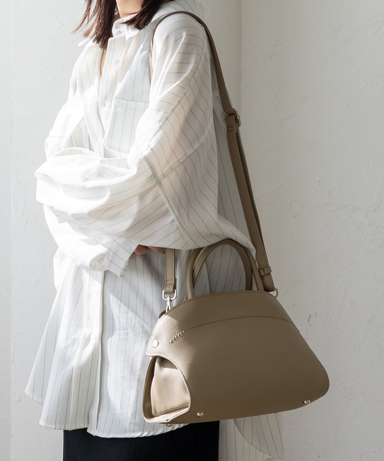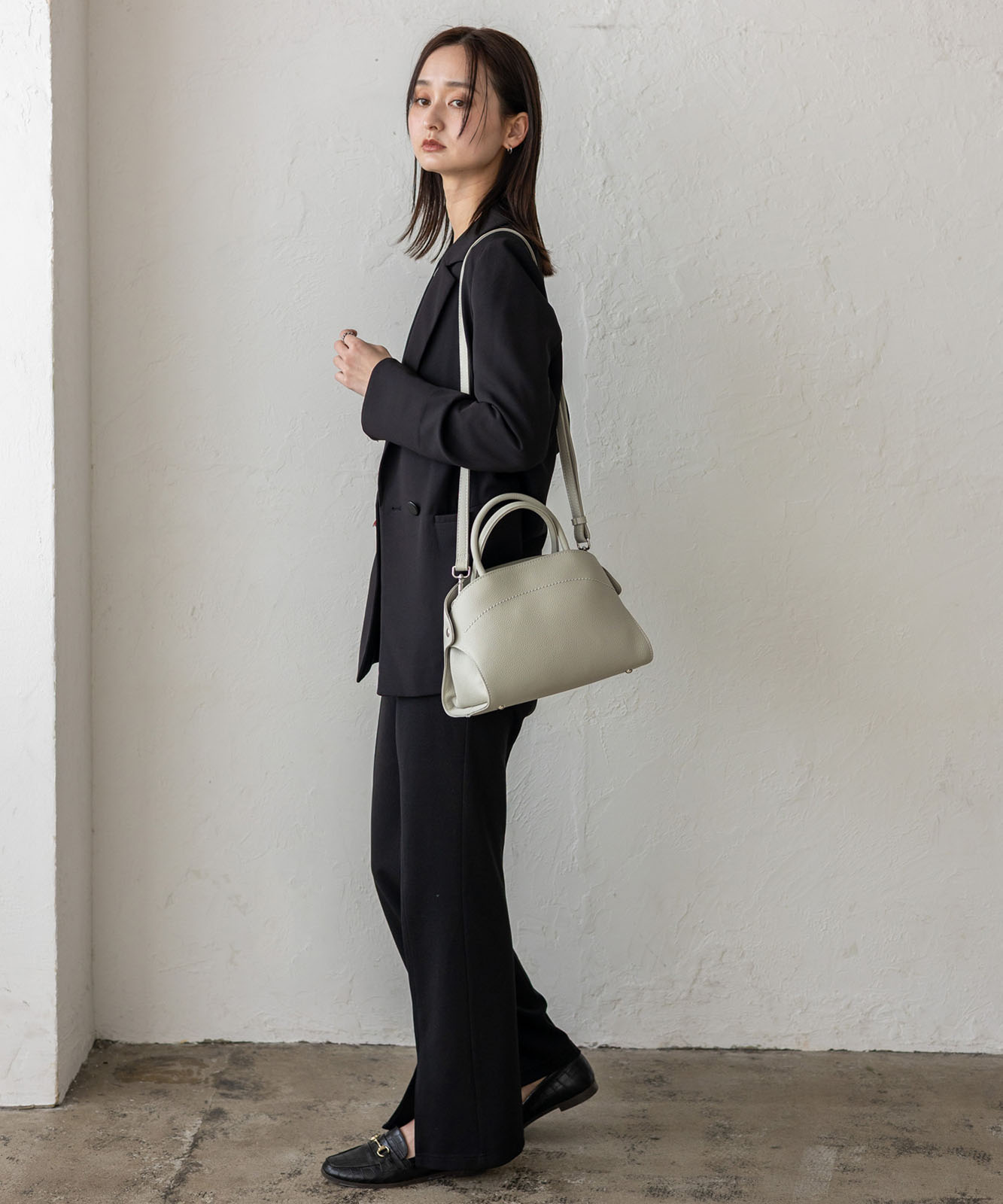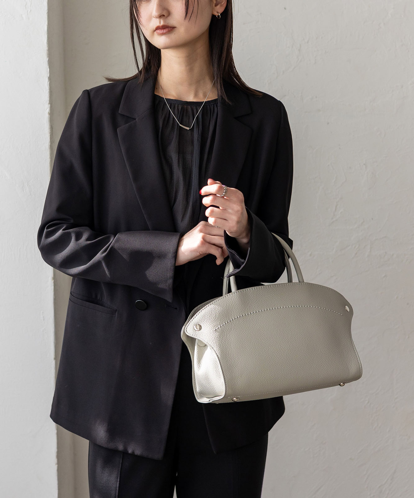 シンプルなラウンド型フォルムに、さりげないステッチがアクセントになった上品なハンドバッグ。