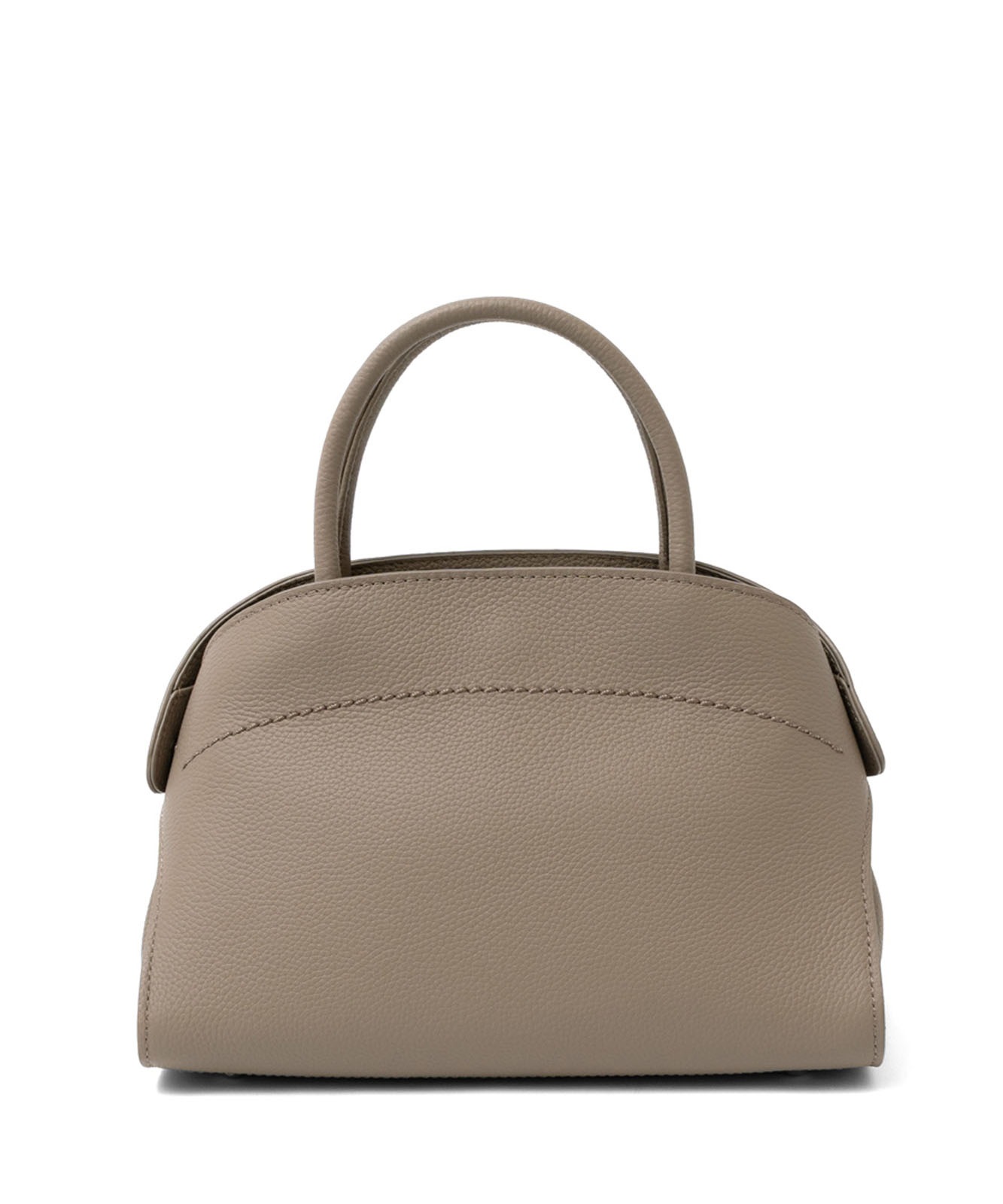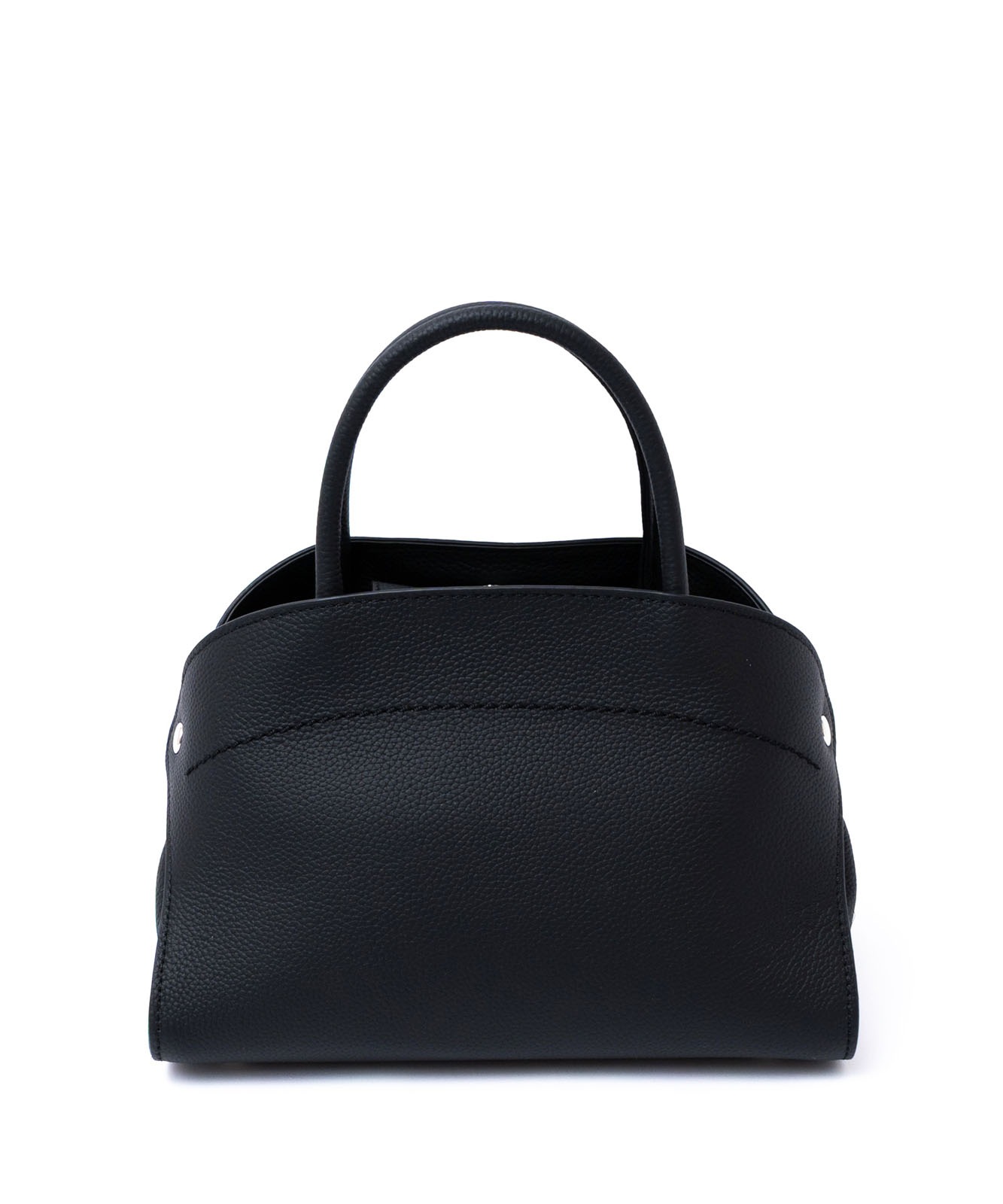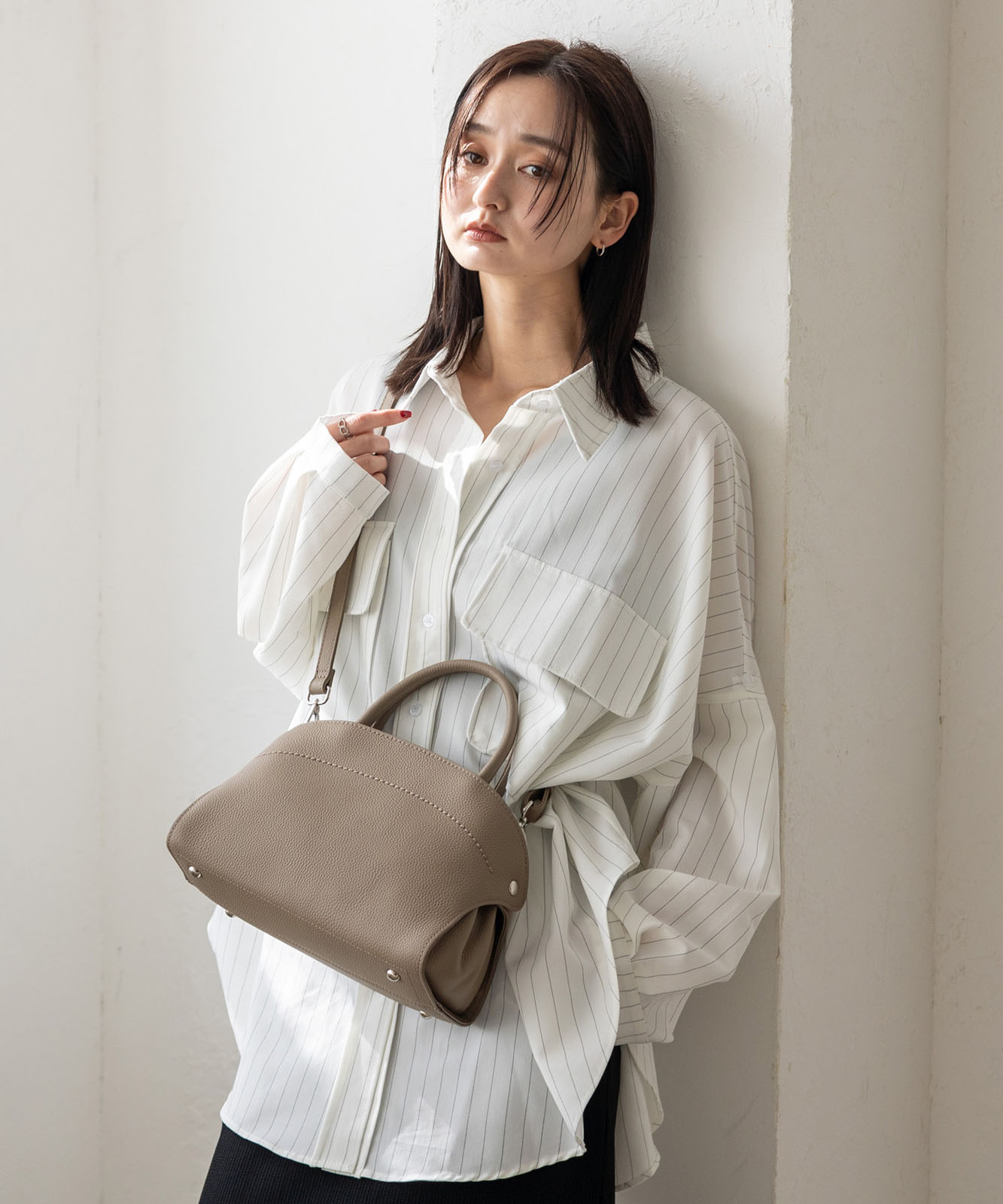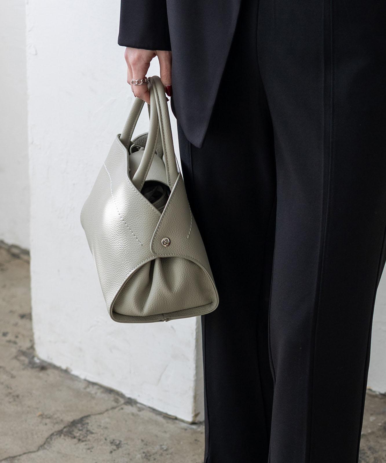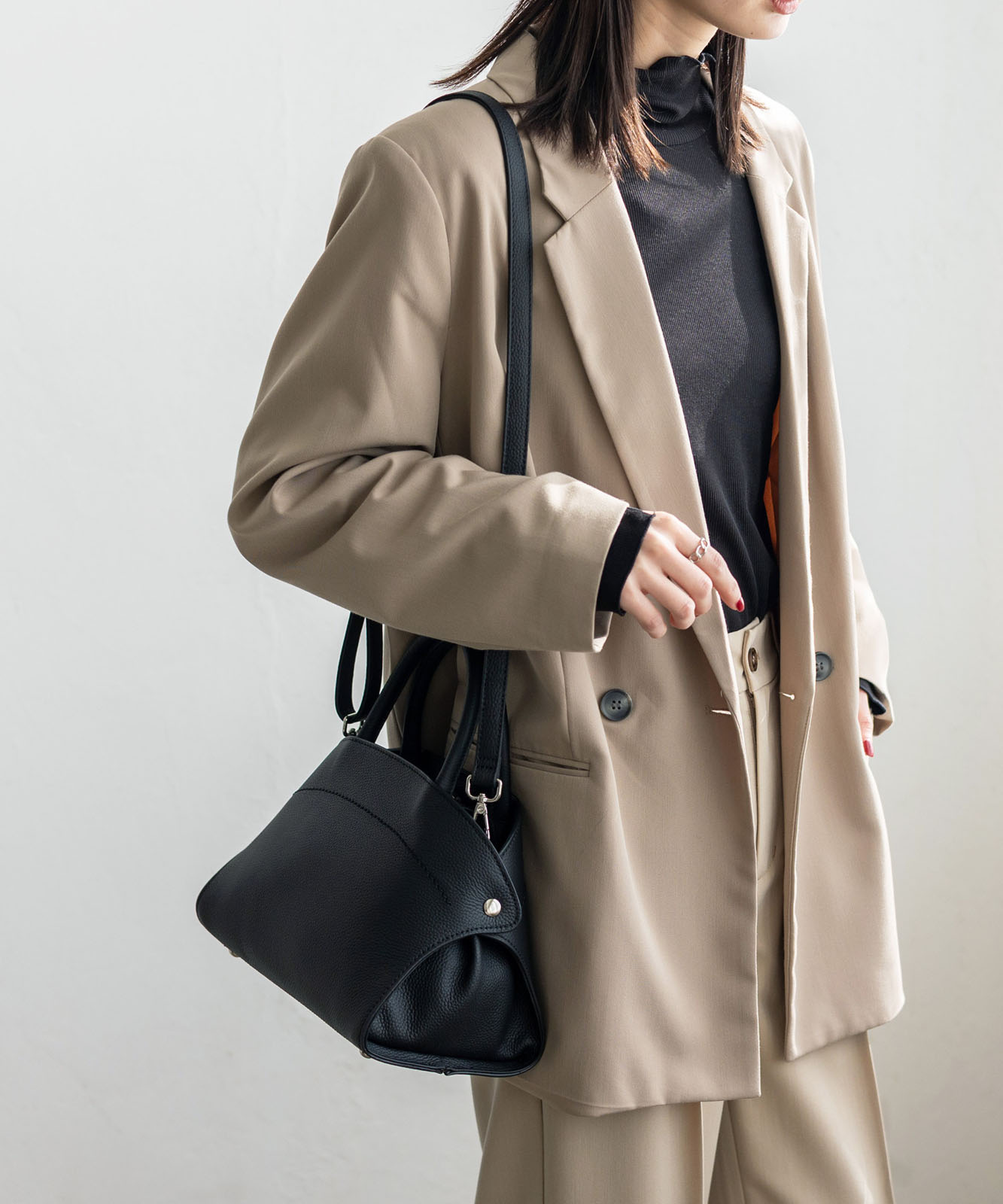 シンプルなラウンド型フォルムに、さりげないステッチがアクセントになった上品なハンドバッグ。