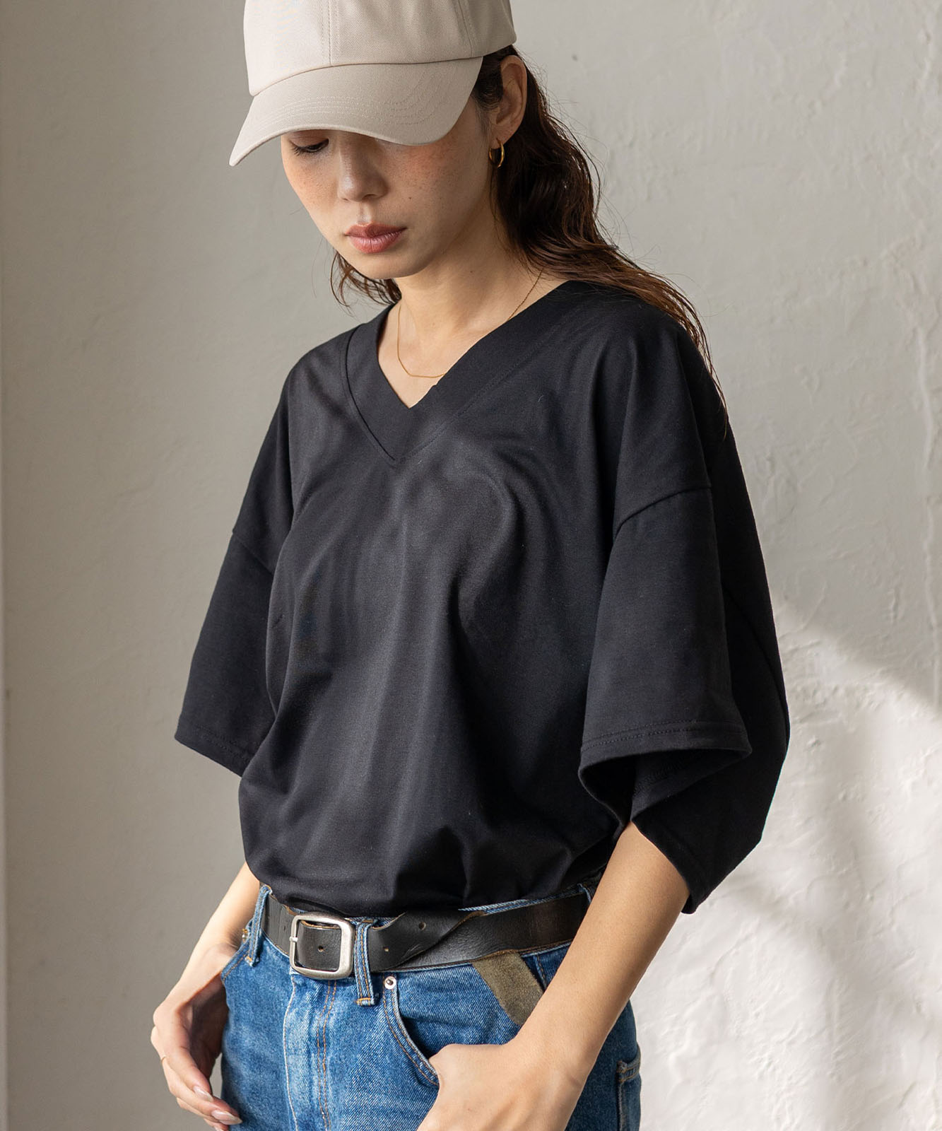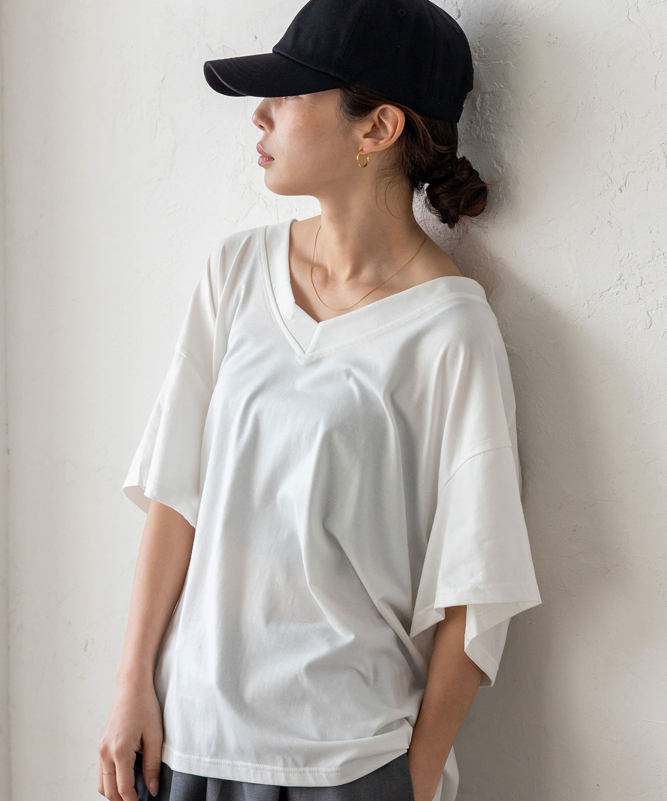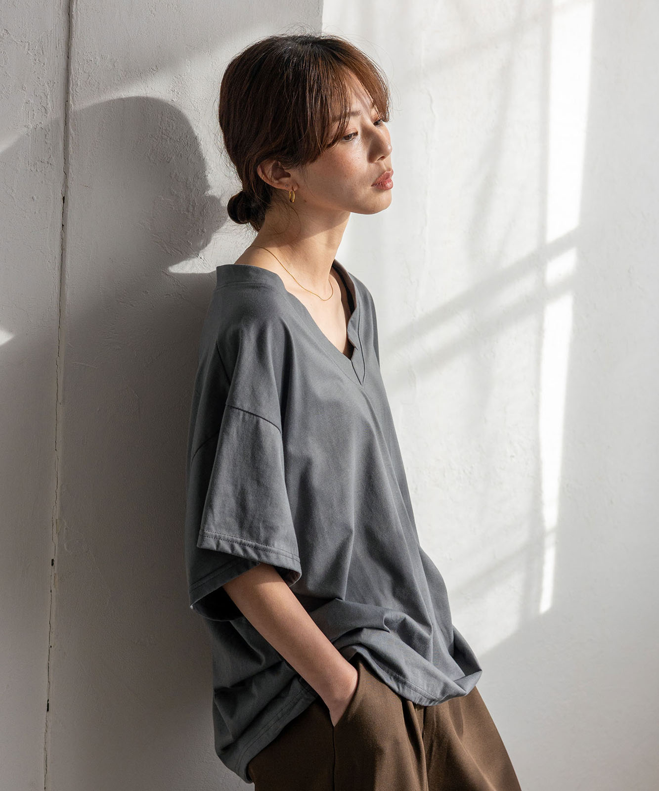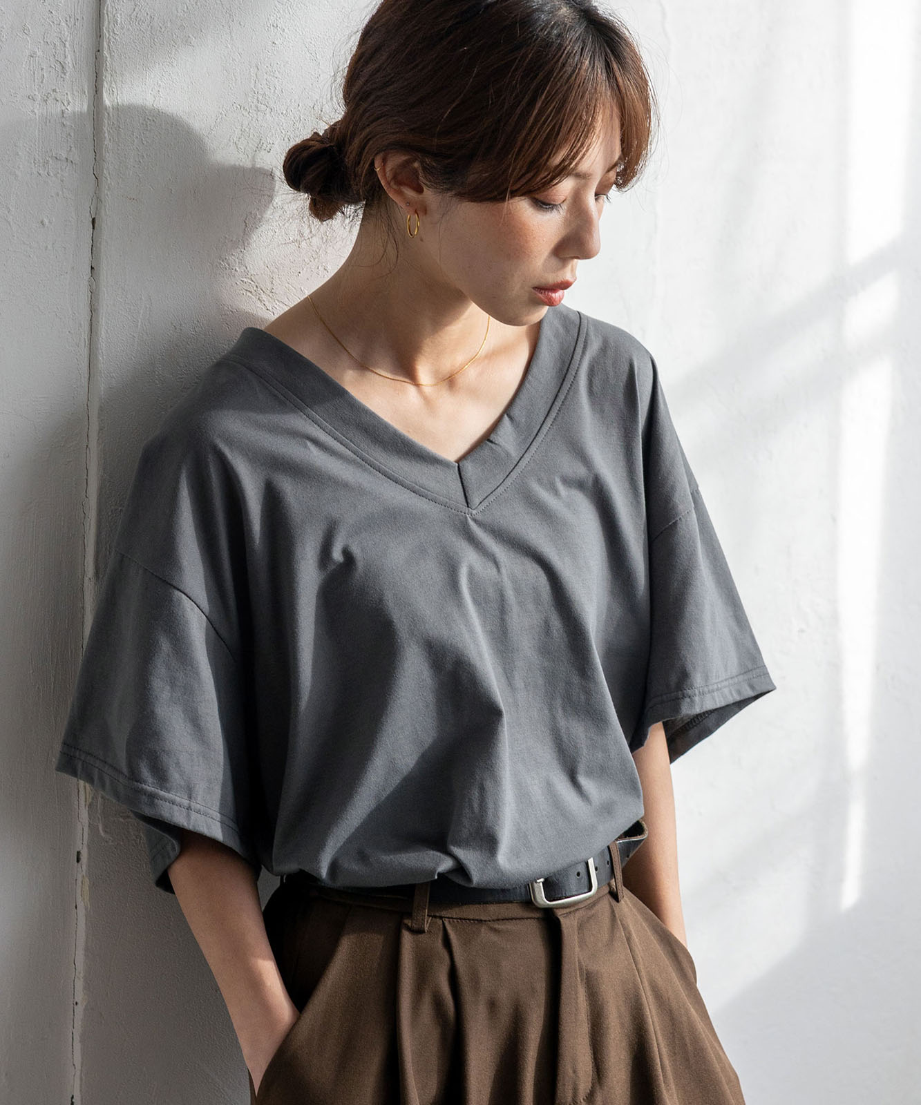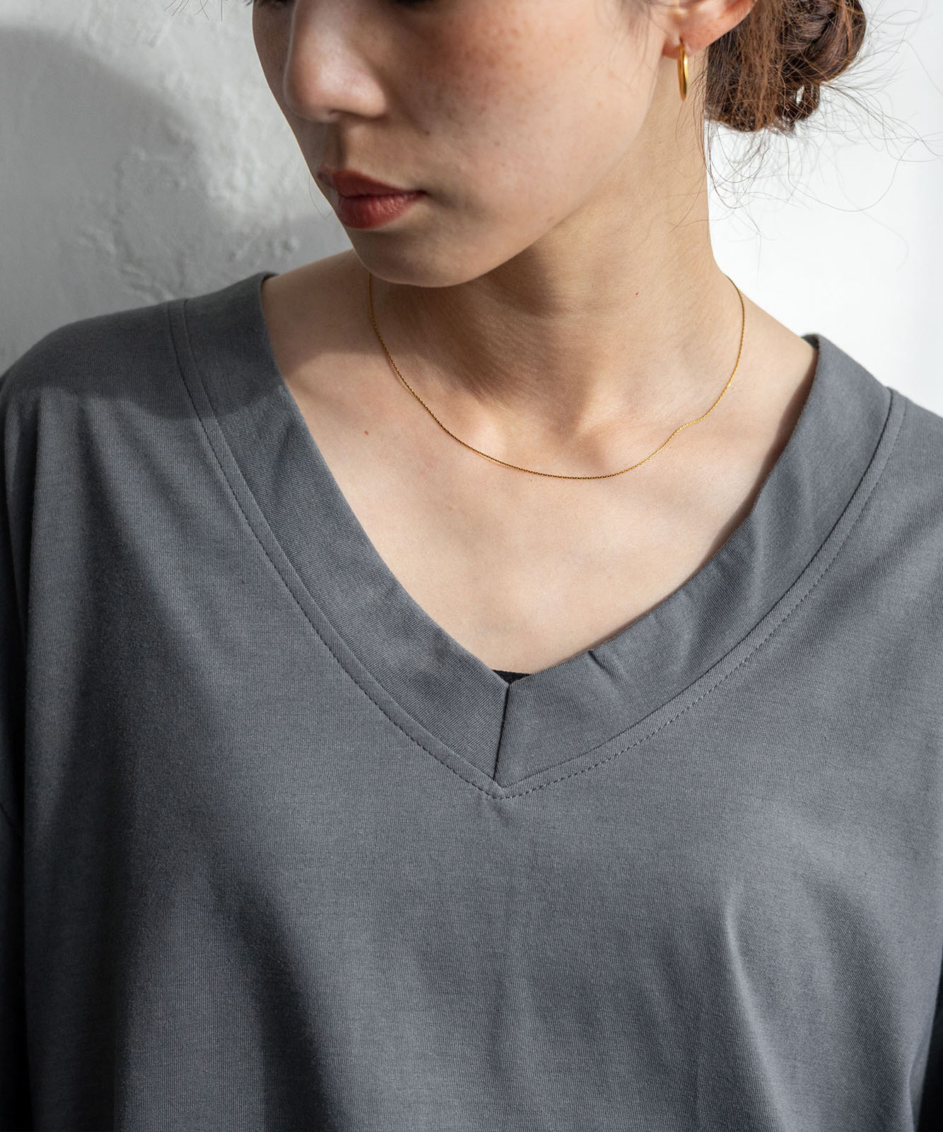 首元は抜け感のある深めのVネック仕様で、顔まわりをすっきりとした印象に。
