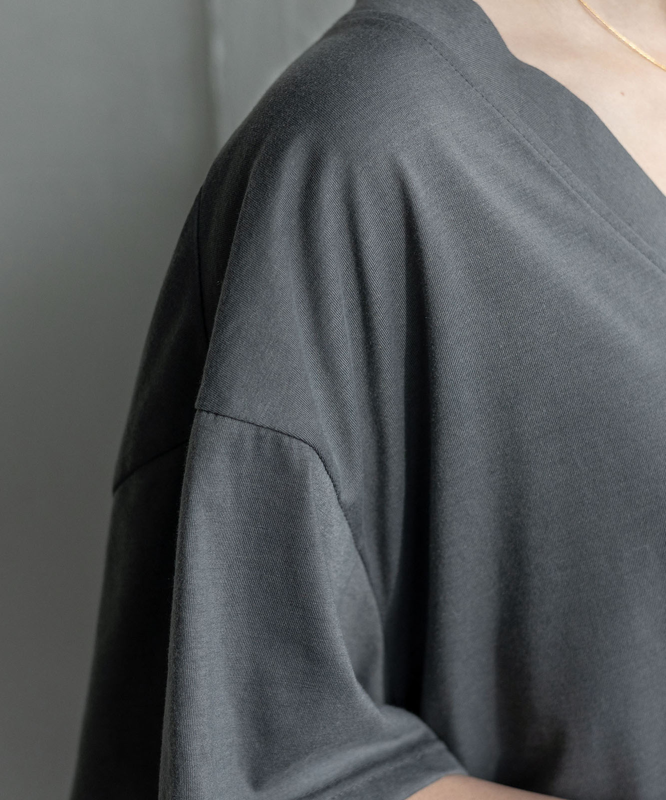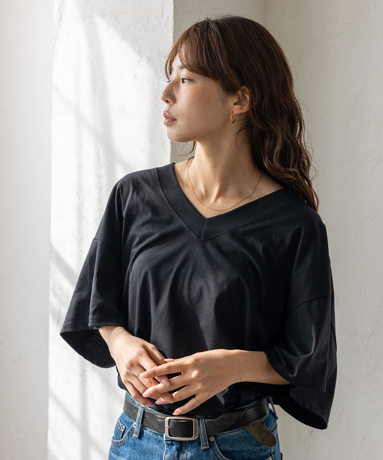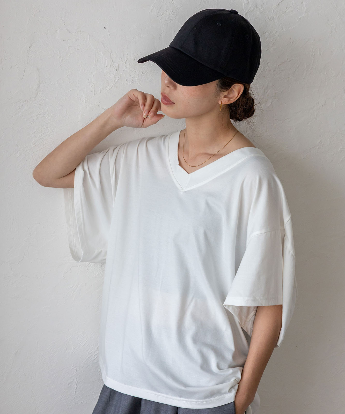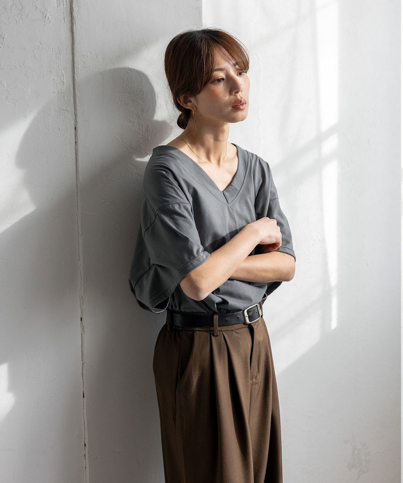 首元は抜け感のある深めのVネック仕様で、顔まわりをすっきりとした印象に。