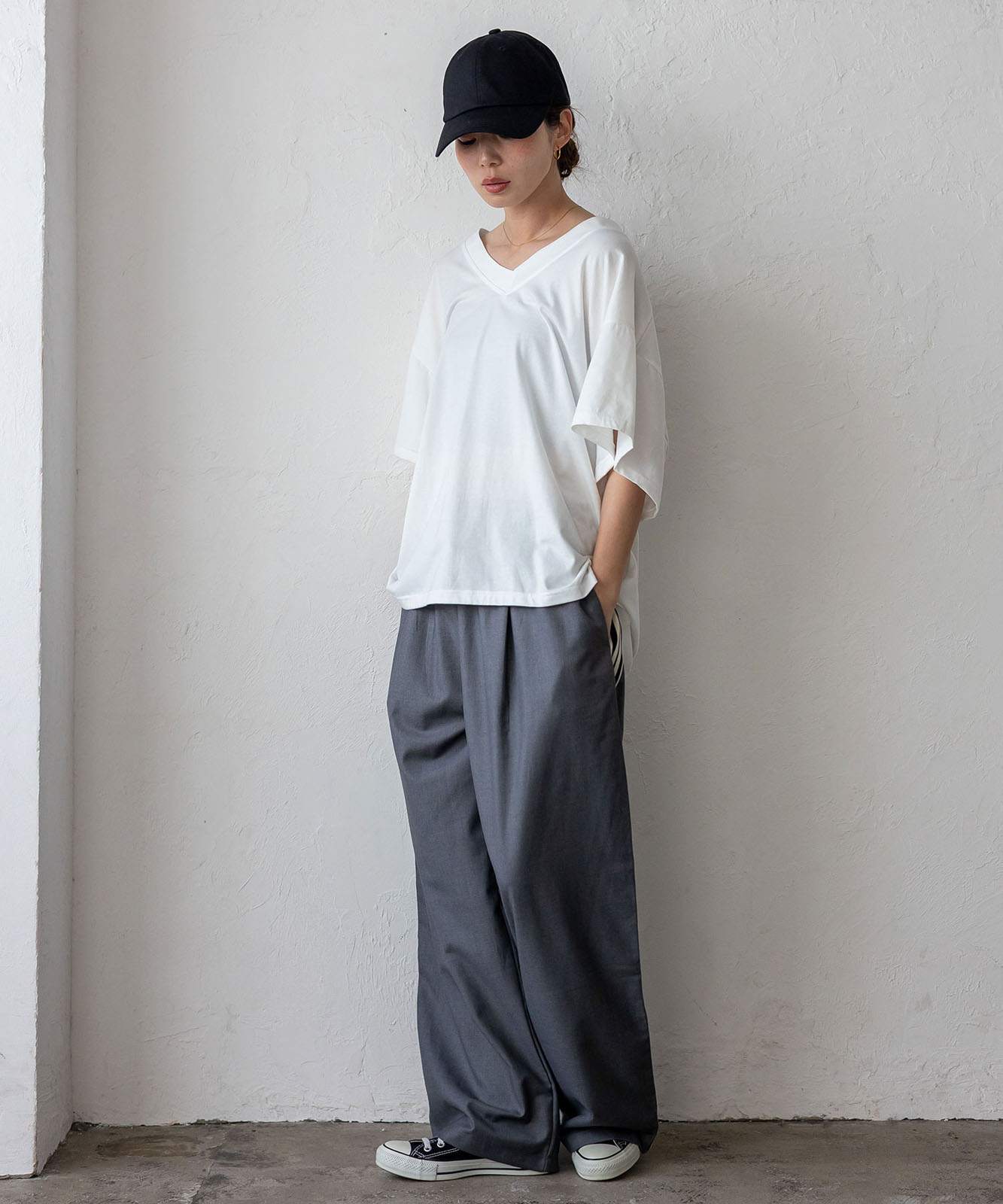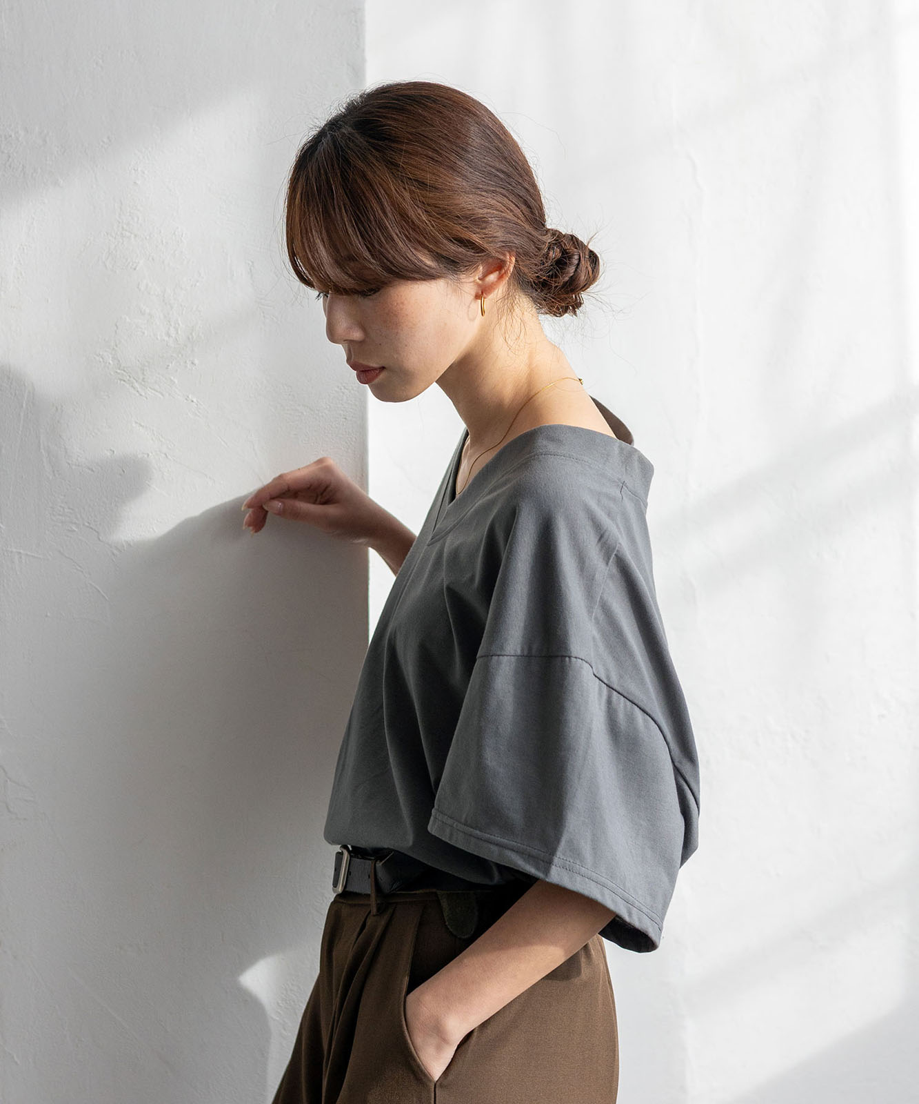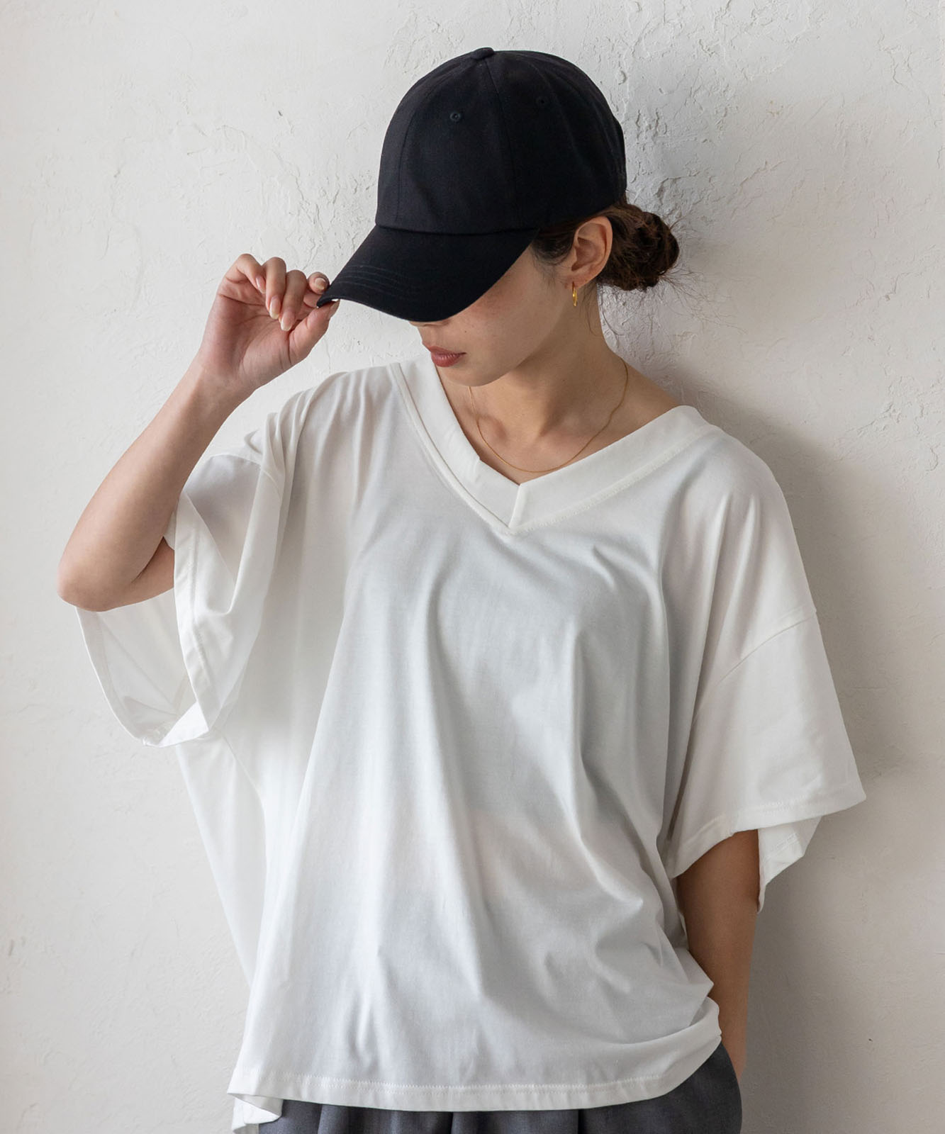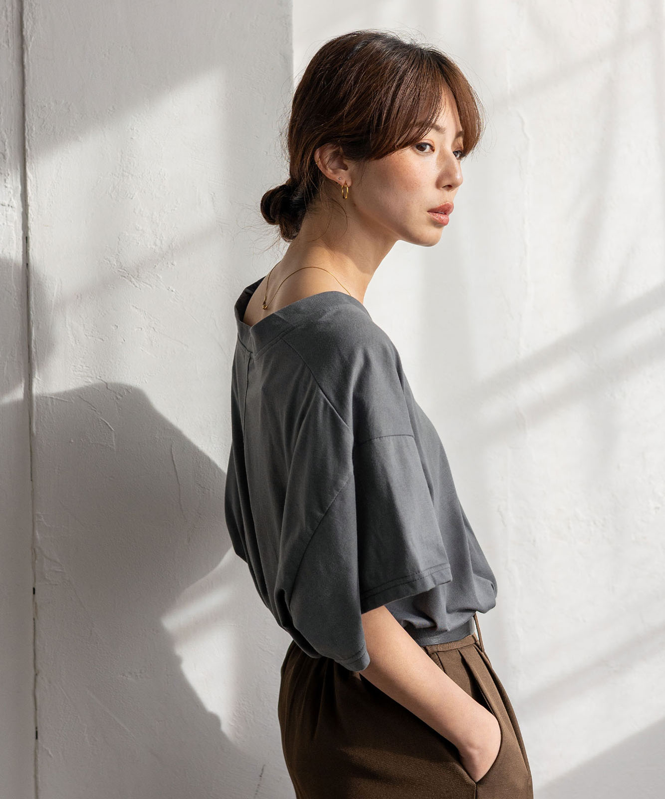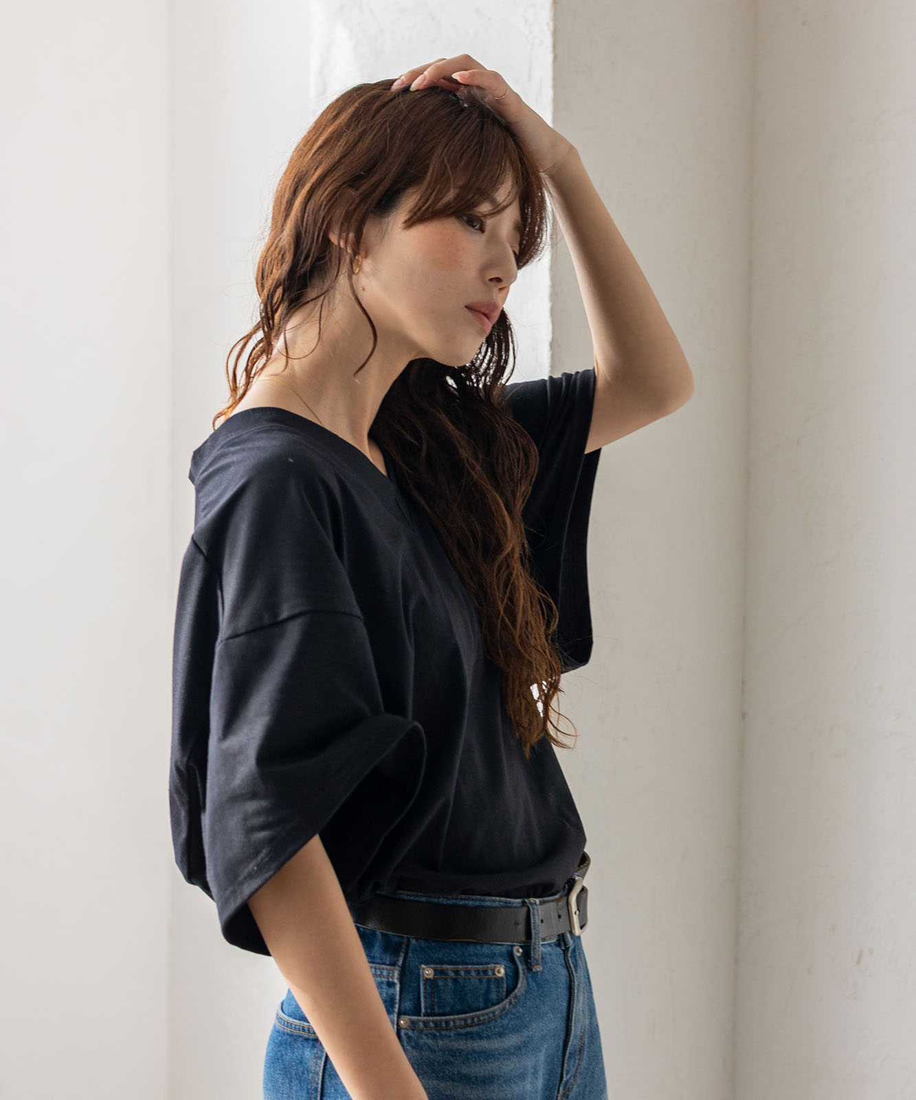 首元は抜け感のある深めのVネック仕様で、顔まわりをすっきりとした印象に。