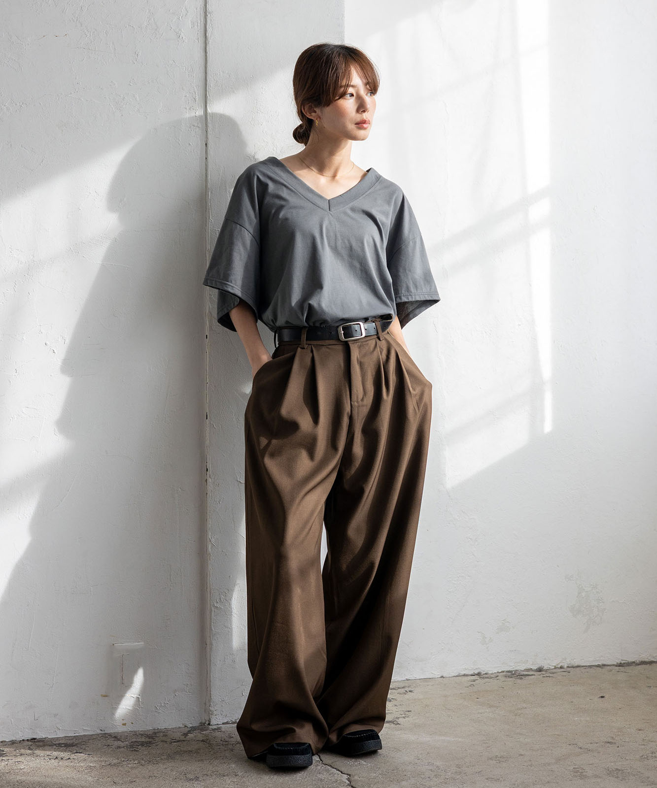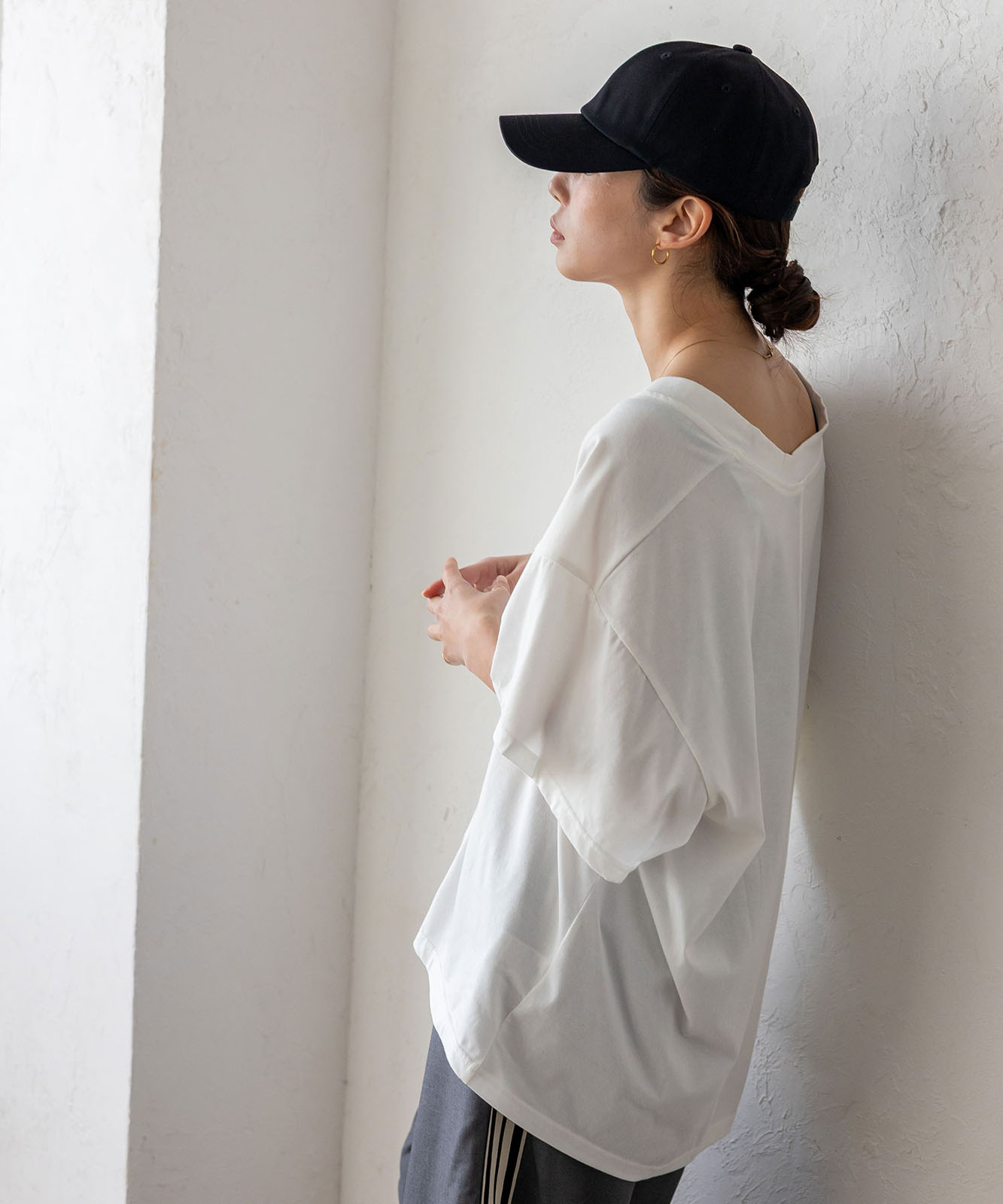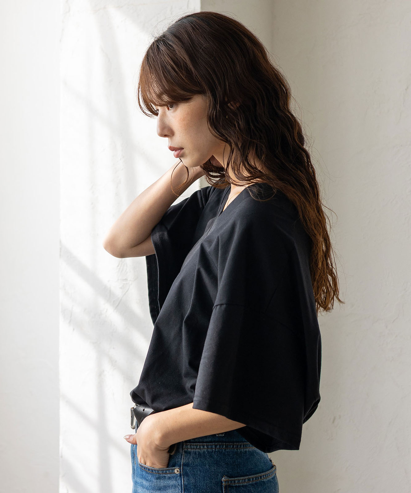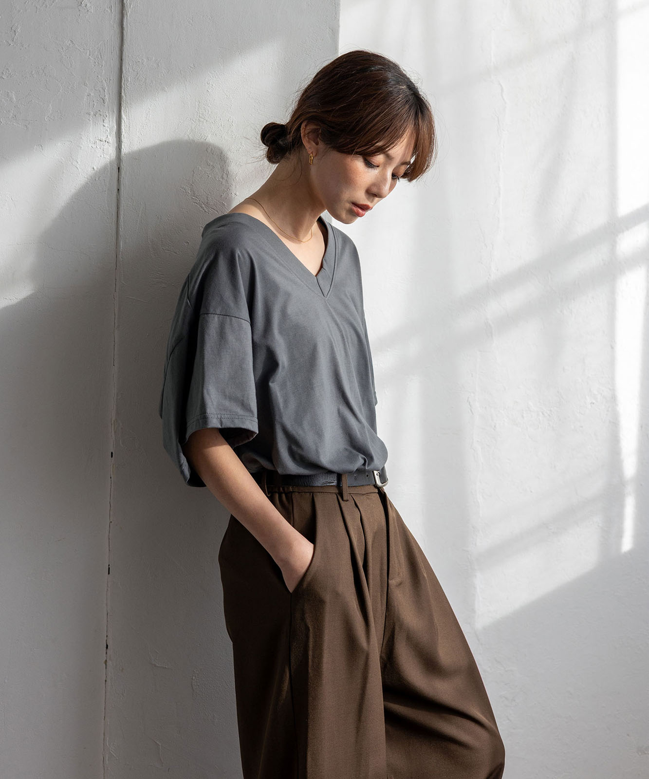 首元は抜け感のある深めのVネック仕様で、顔まわりをすっきりとした印象に。