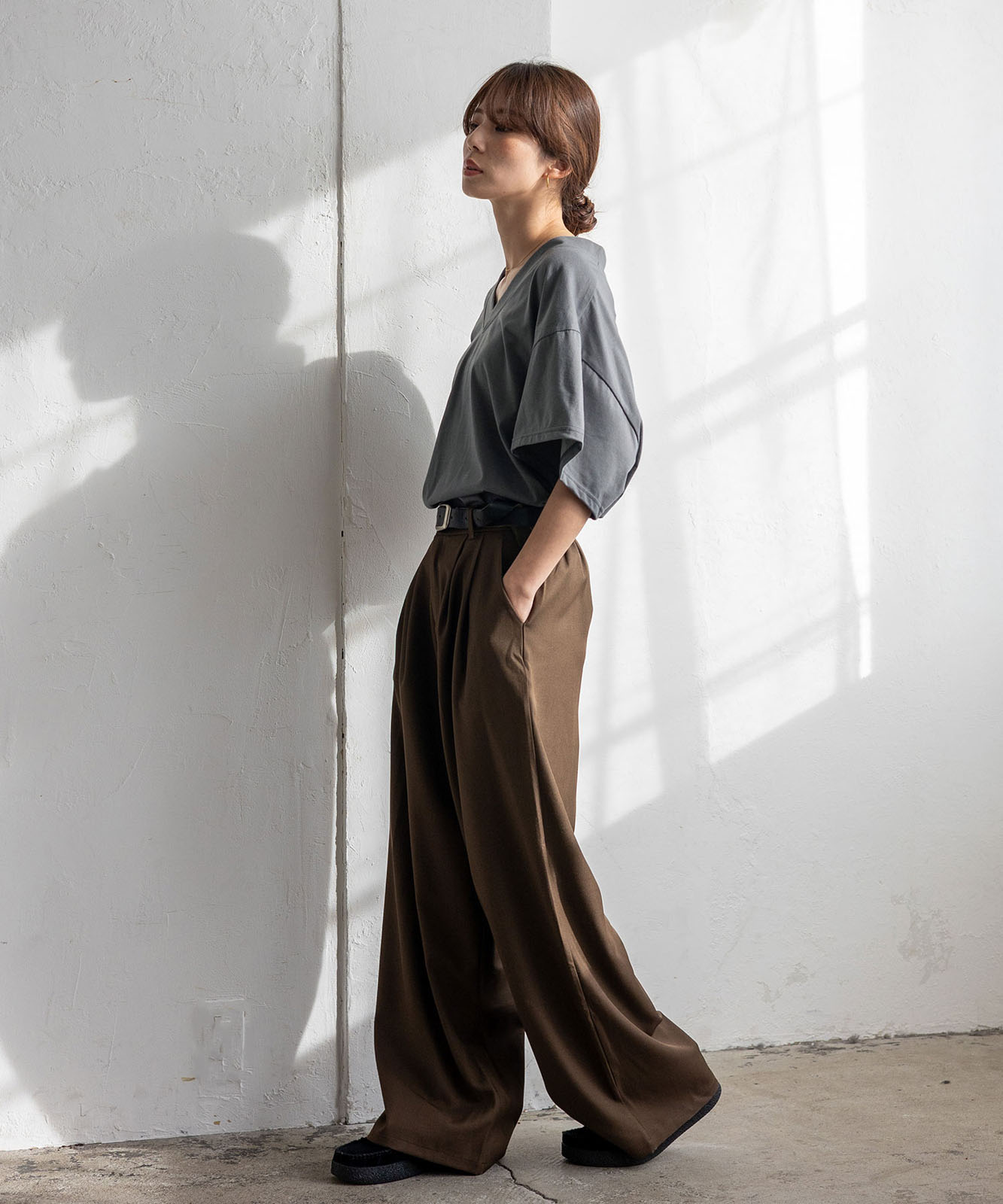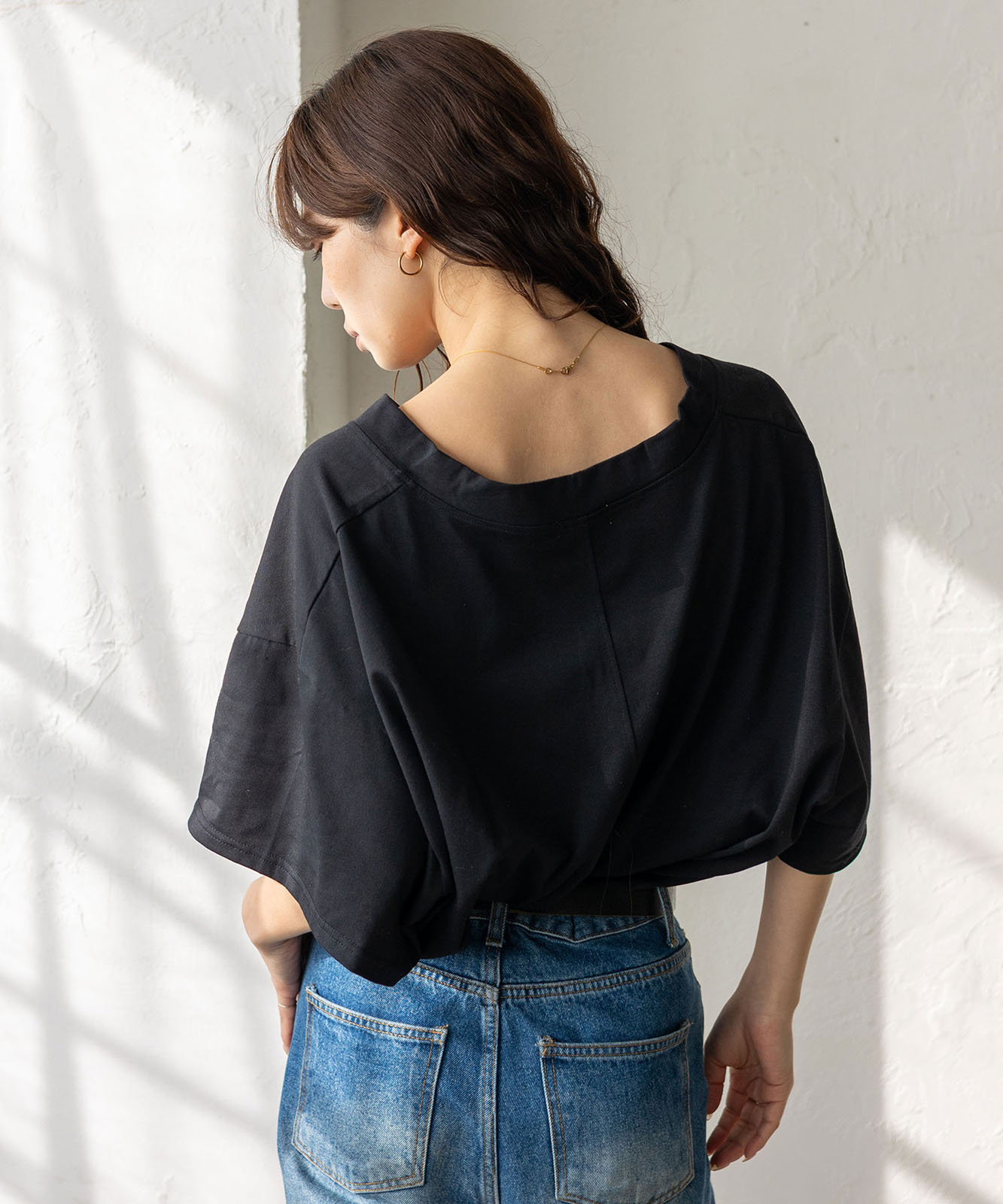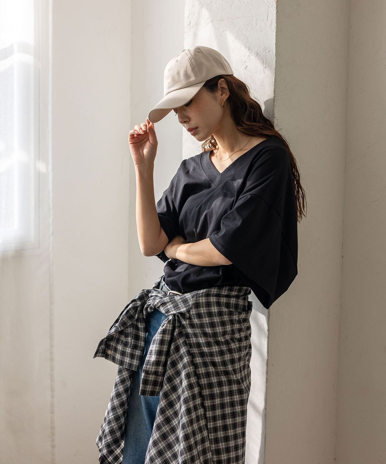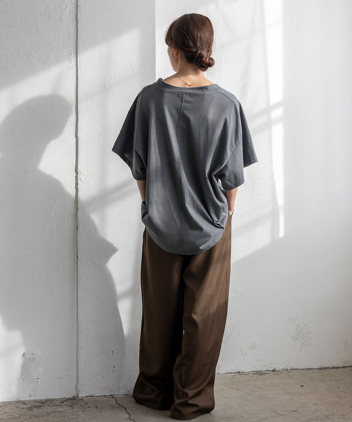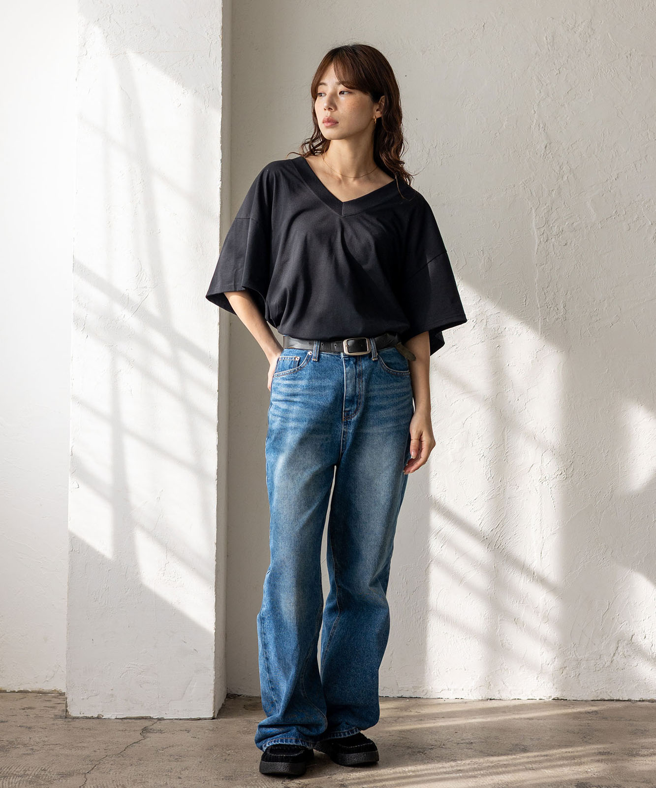 首元は抜け感のある深めのVネック仕様で、顔まわりをすっきりとした印象に。