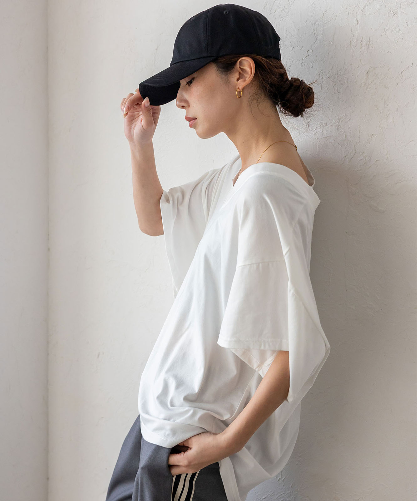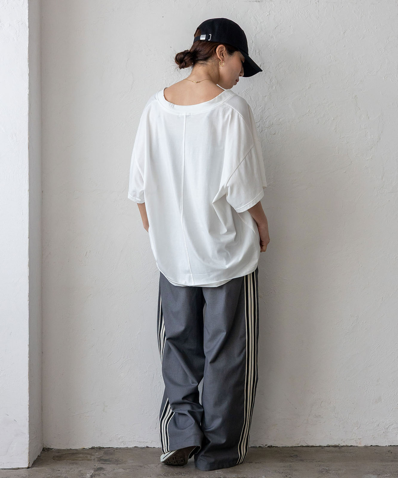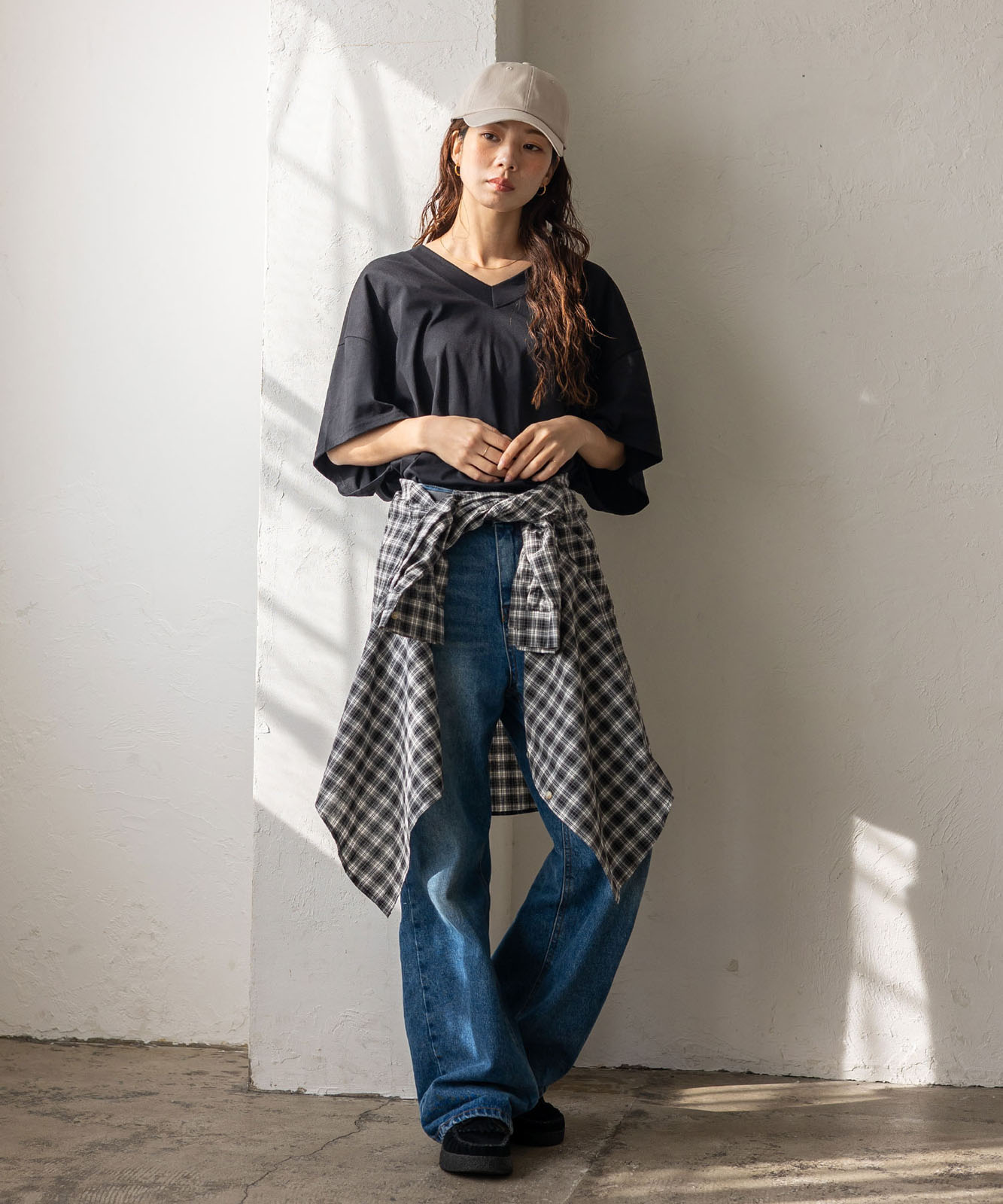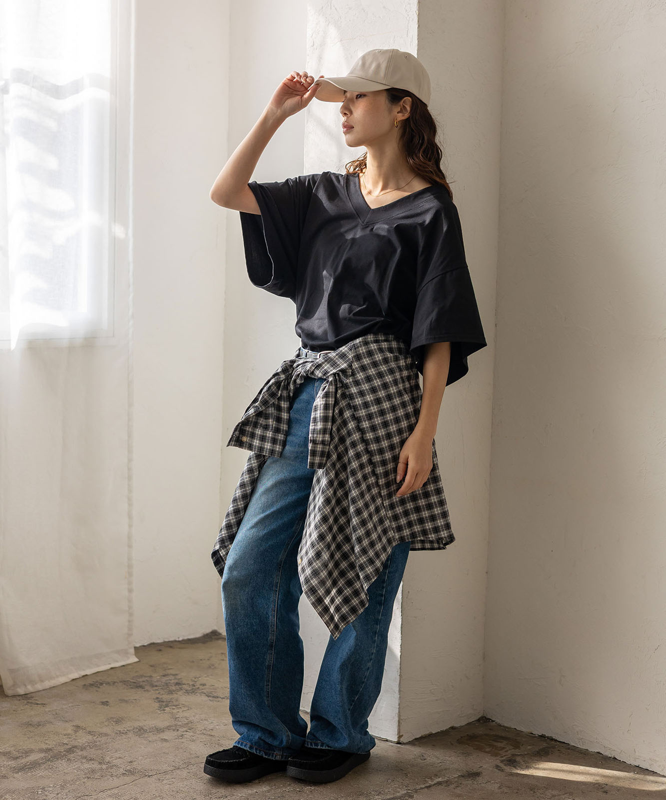 首元は抜け感のある深めのVネック仕様で、顔まわりをすっきりとした印象に。