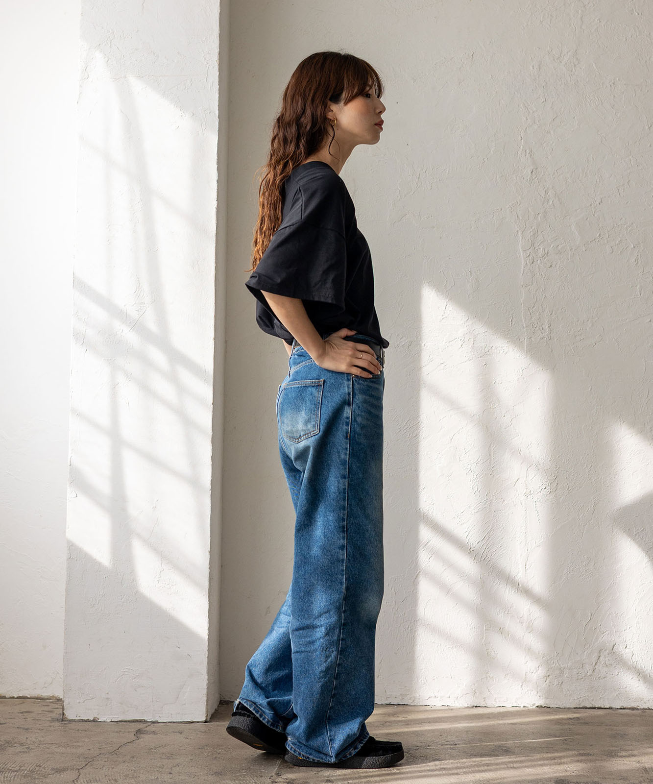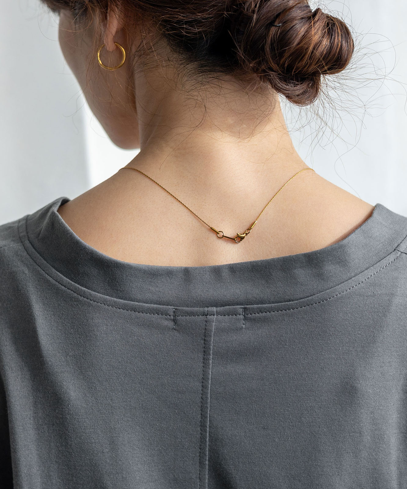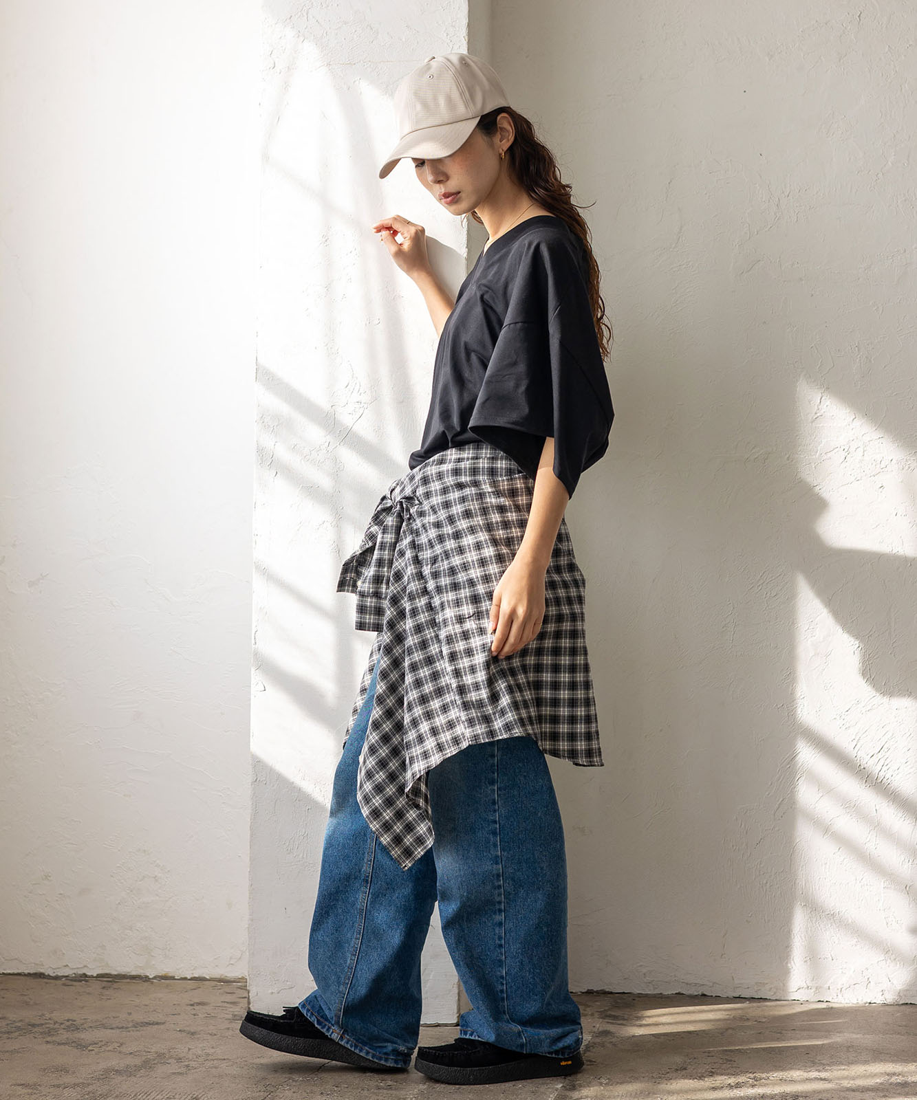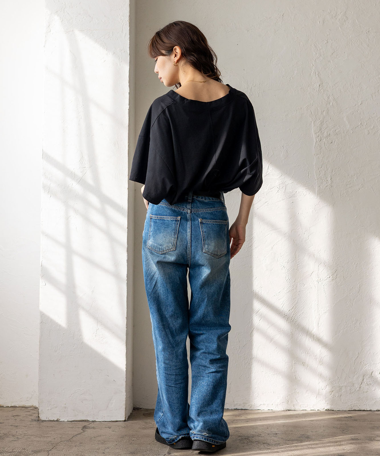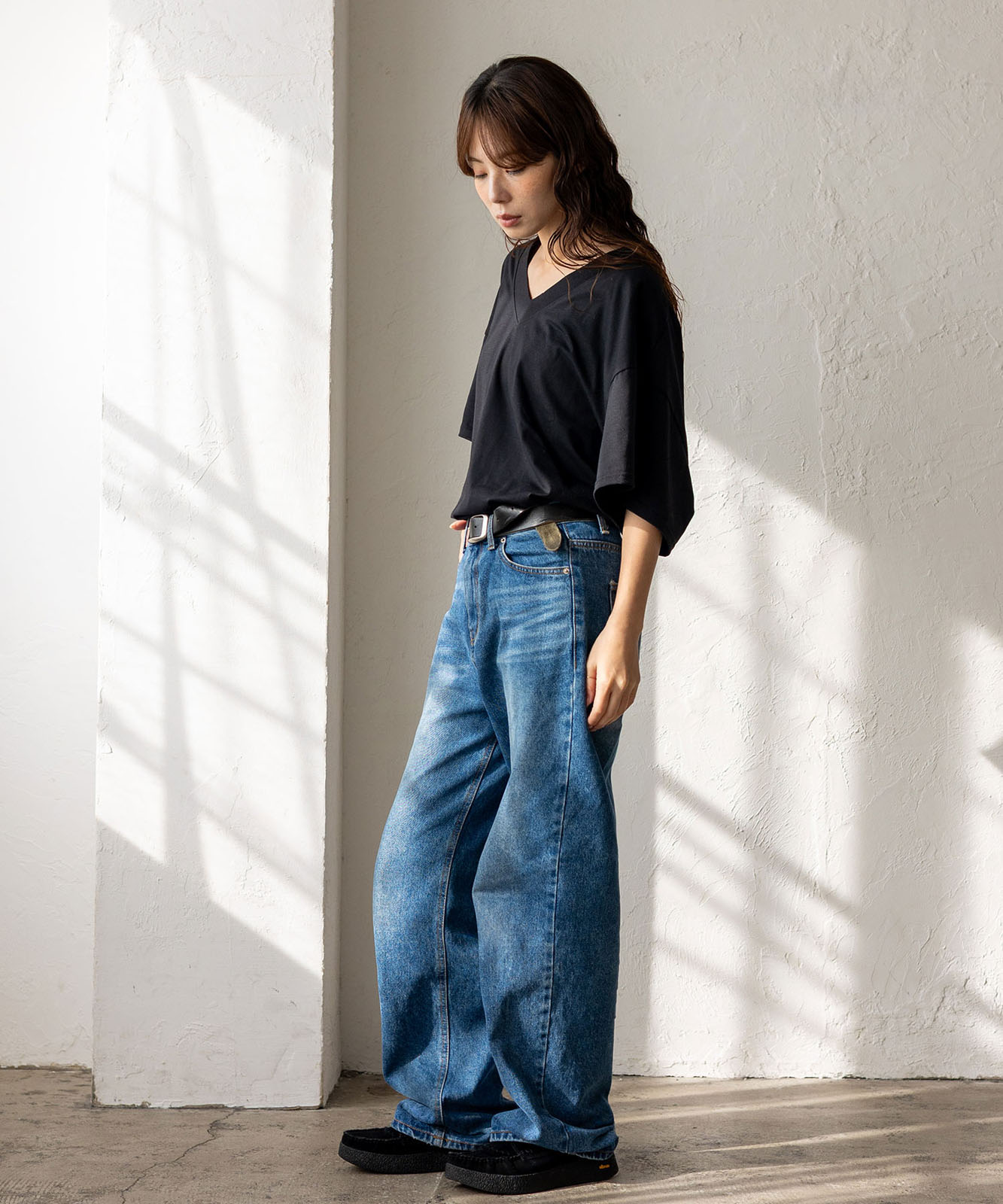 首元は抜け感のある深めのVネック仕様で、顔まわりをすっきりとした印象に。