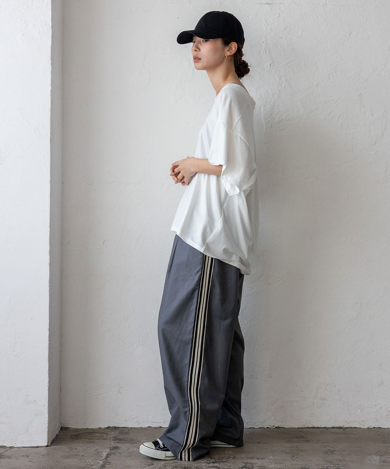 程よい厚みのカットソー素材で、季節を問わず活躍。