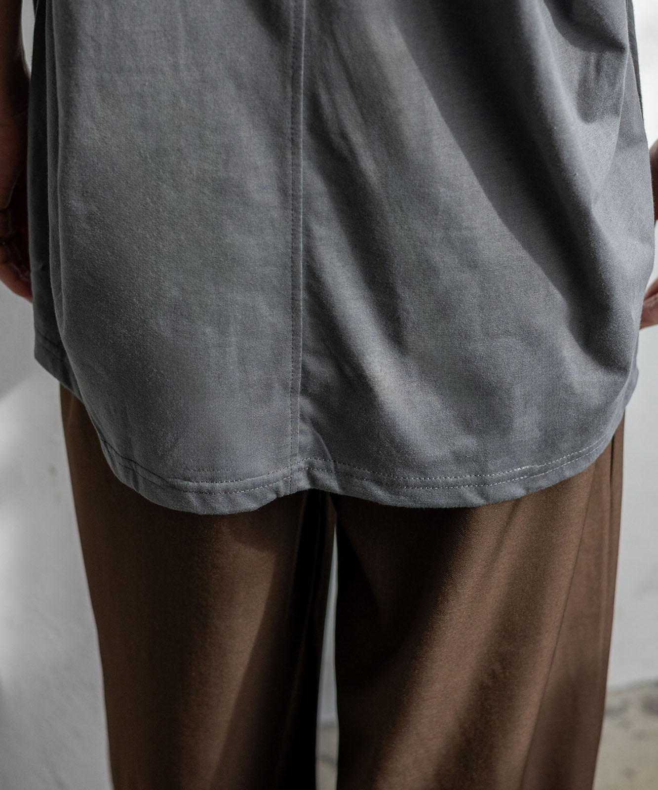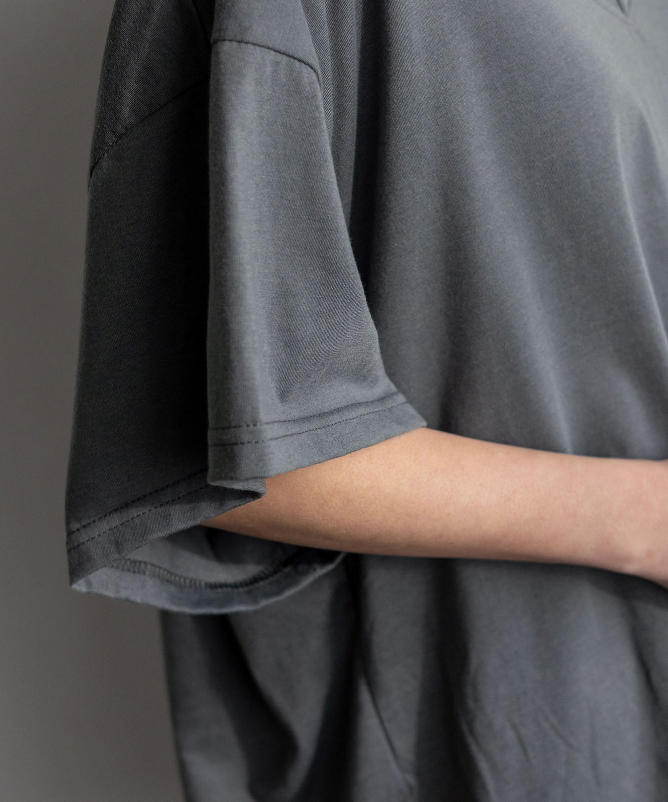 ゆったりとしたオーバーサイズシルエットで、体のラインを拾いにくくリラックス感のある着心地。