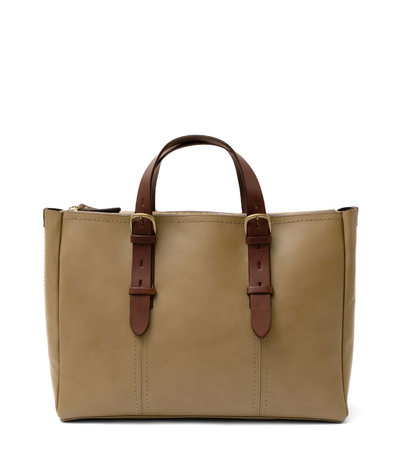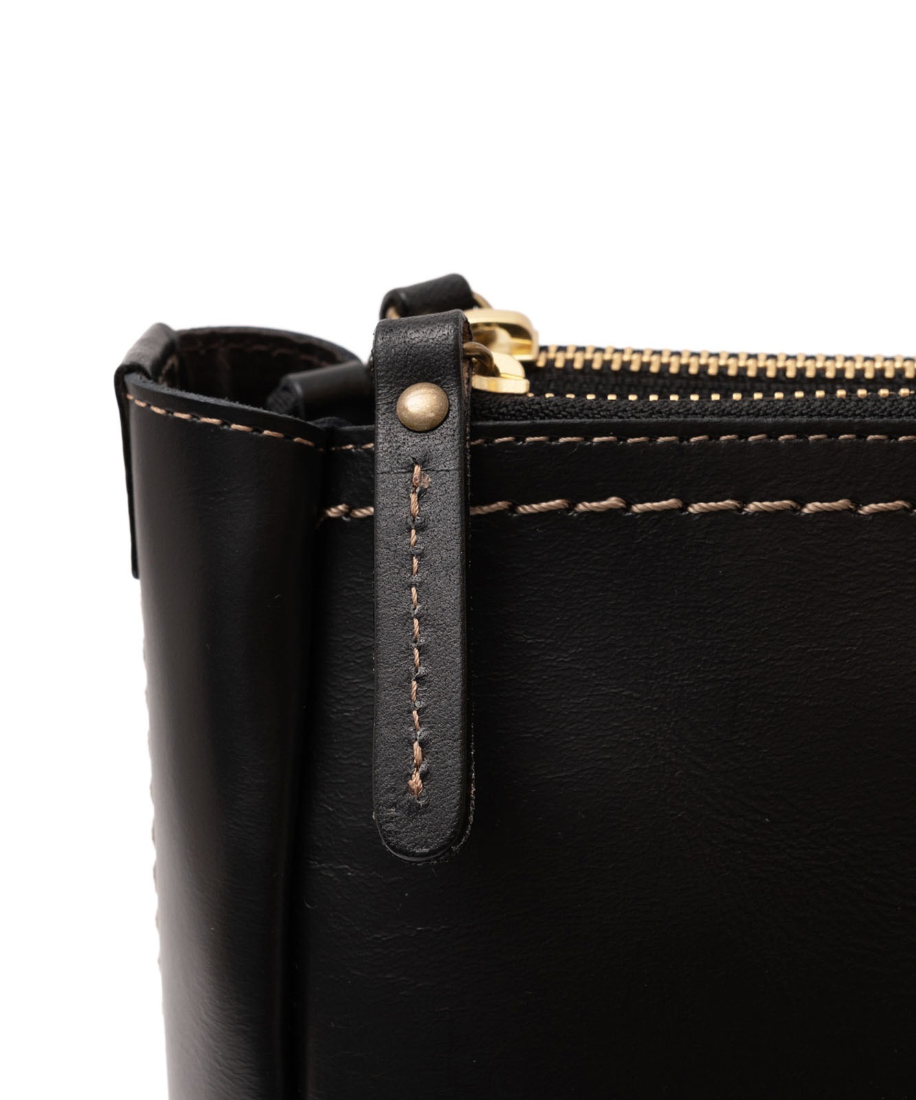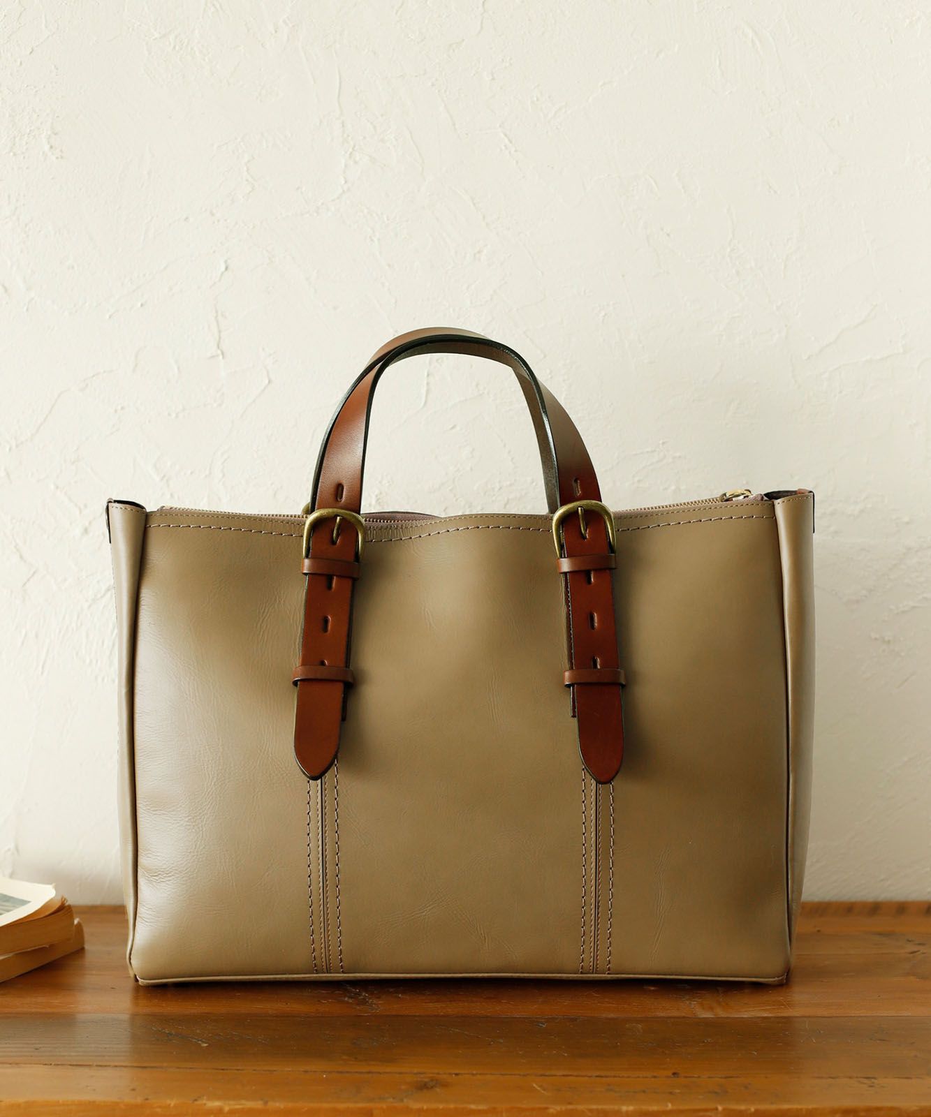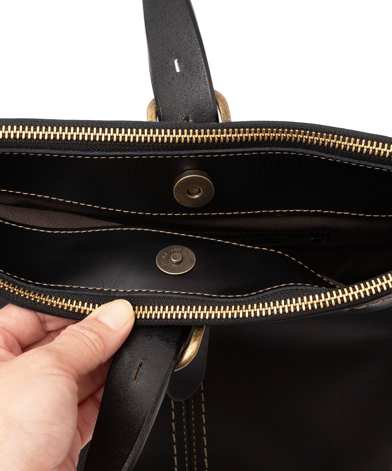 YKKファスナー、底鋲付き。ハンドルと引手には上質なヌメ革(牛革)を使用し、金具はアンティークゴールドで統一。