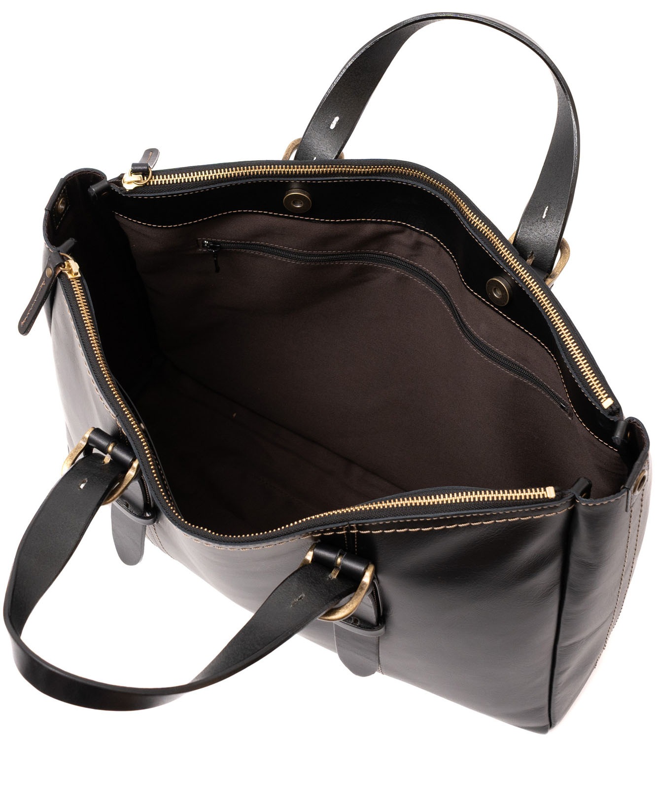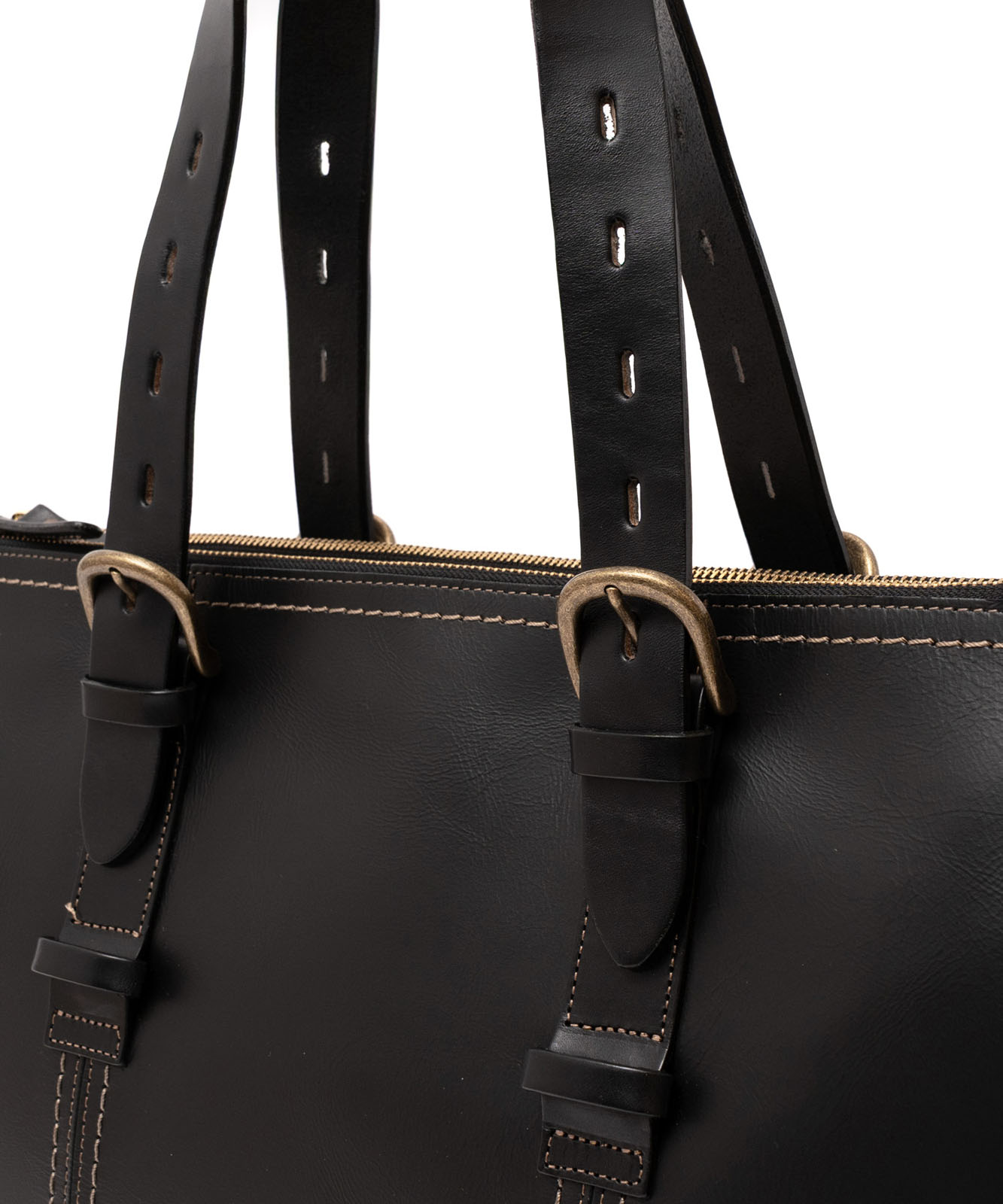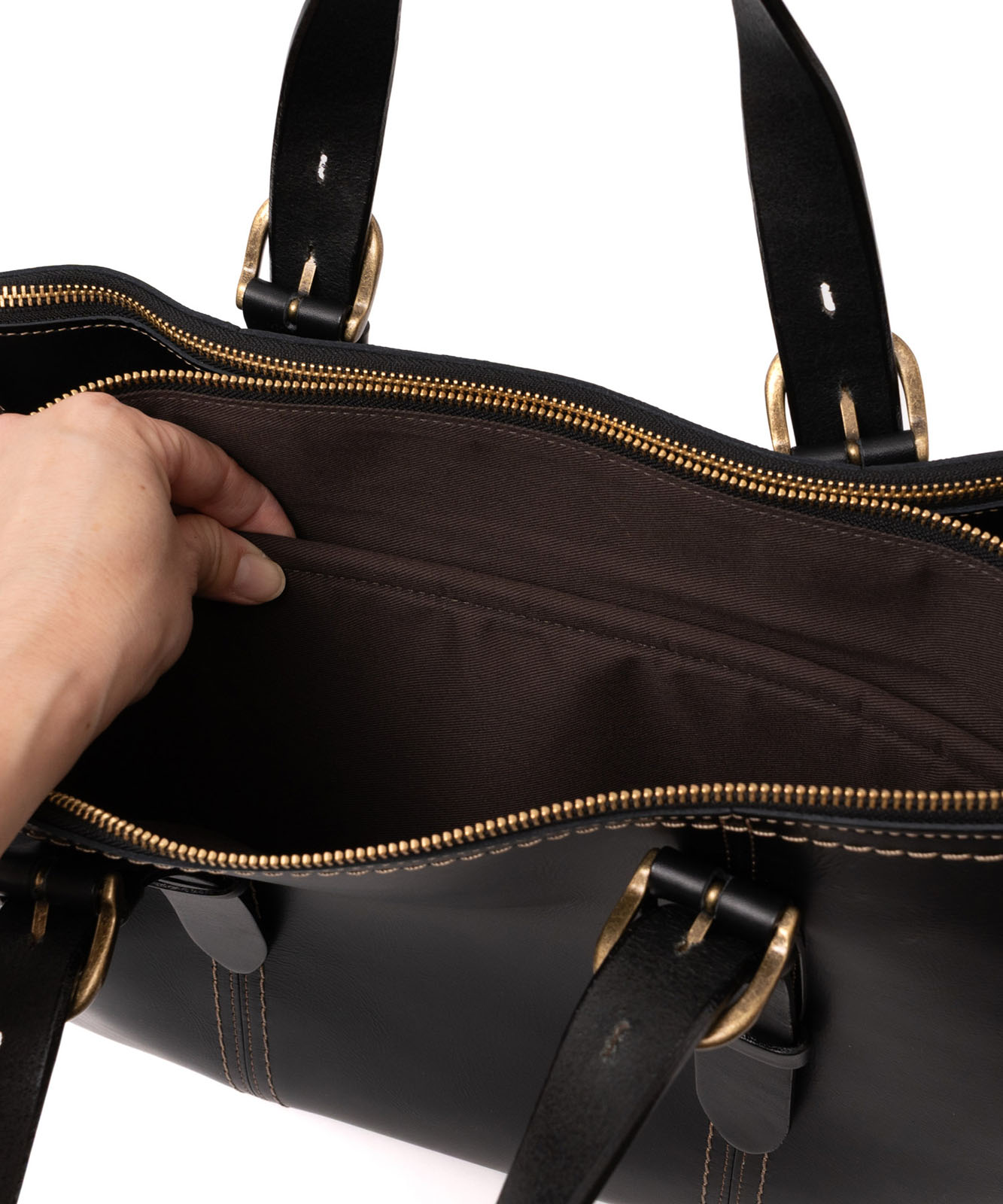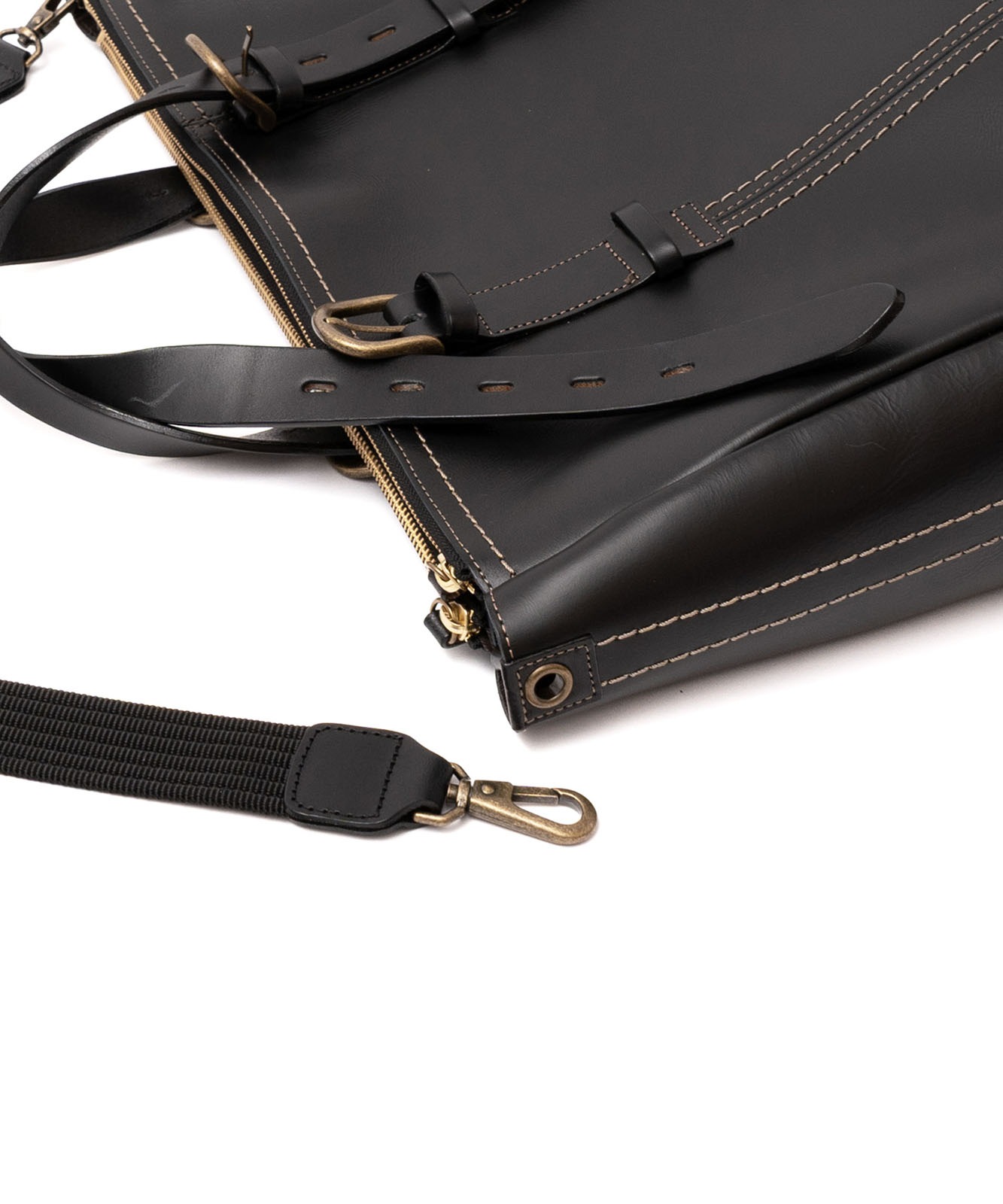 YKKファスナー、底鋲付き。ハンドルと引手には上質なヌメ革(牛革)を使用し、金具はアンティークゴールドで統一。