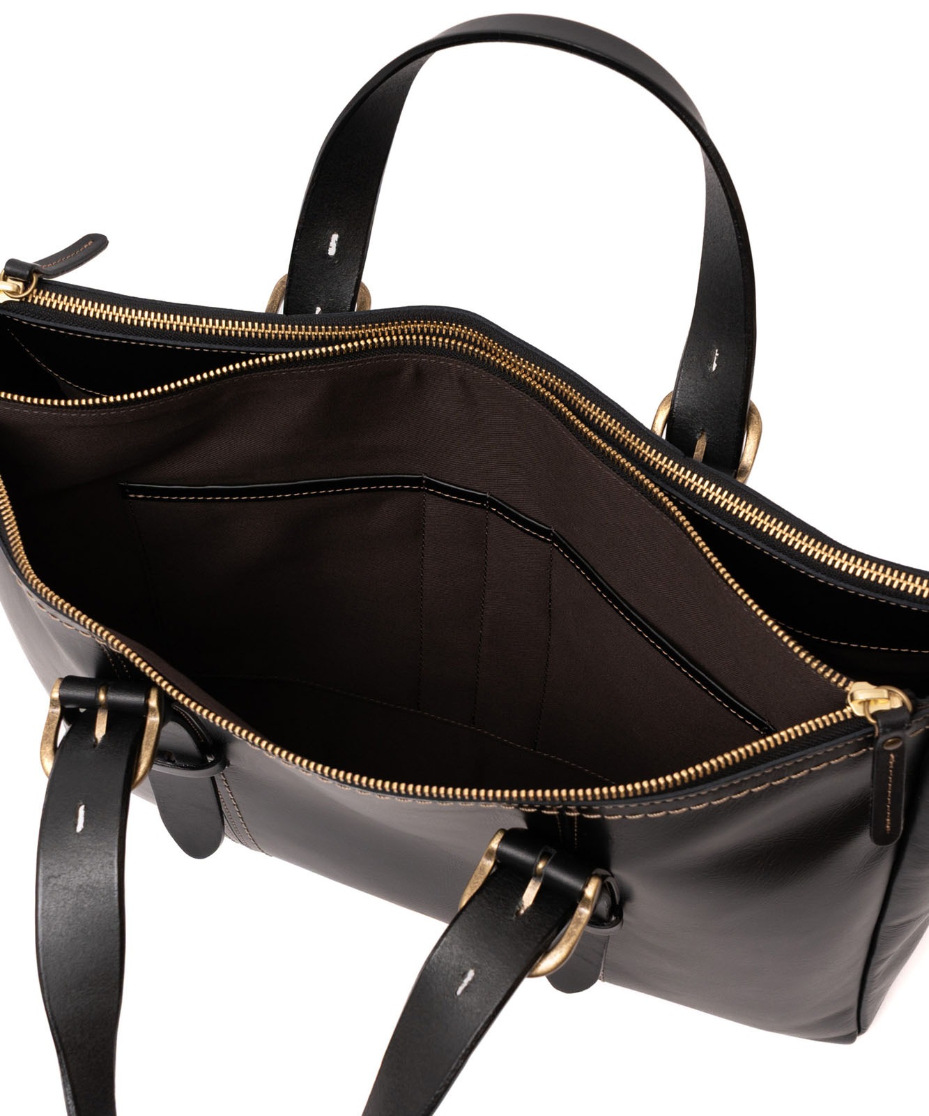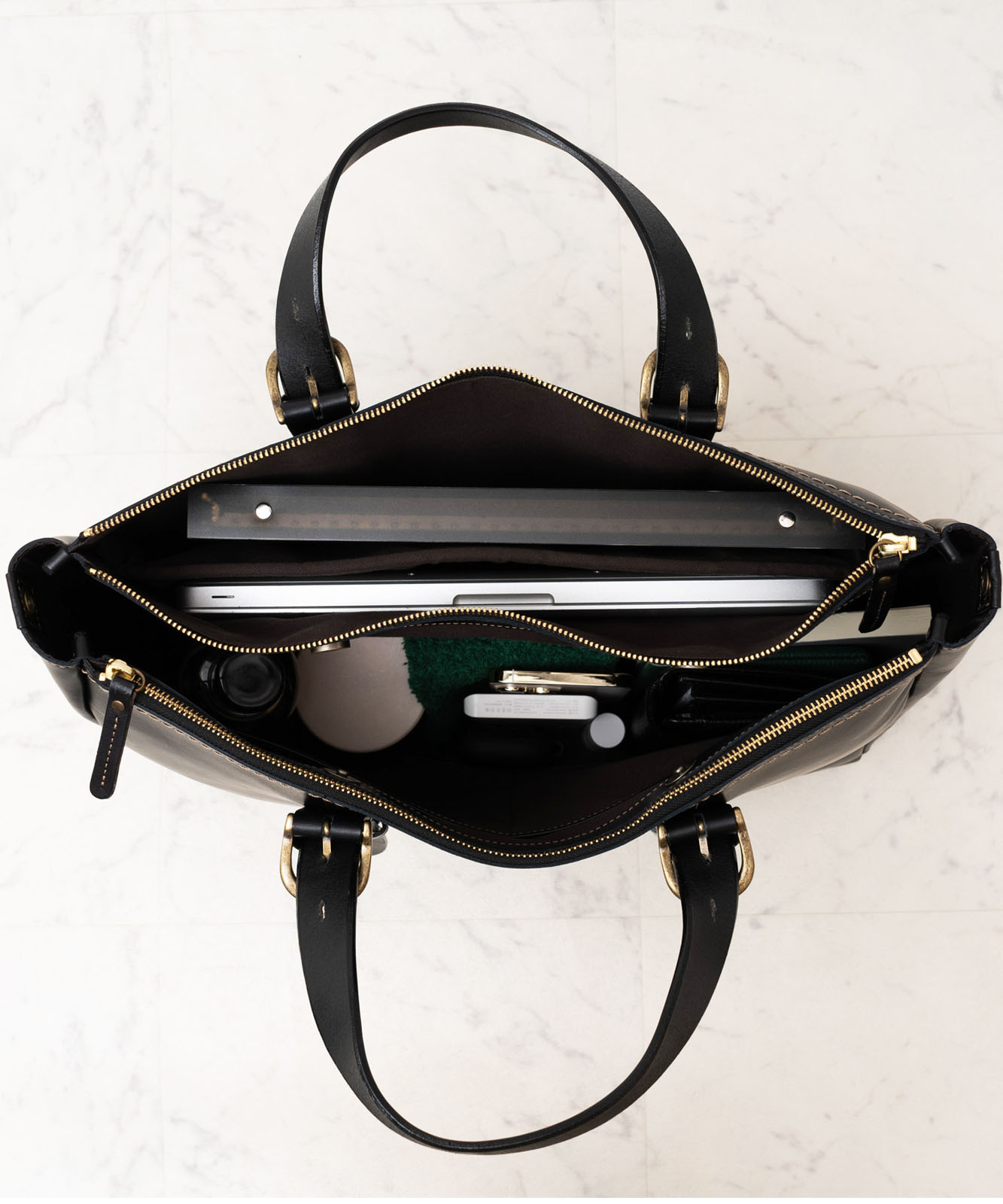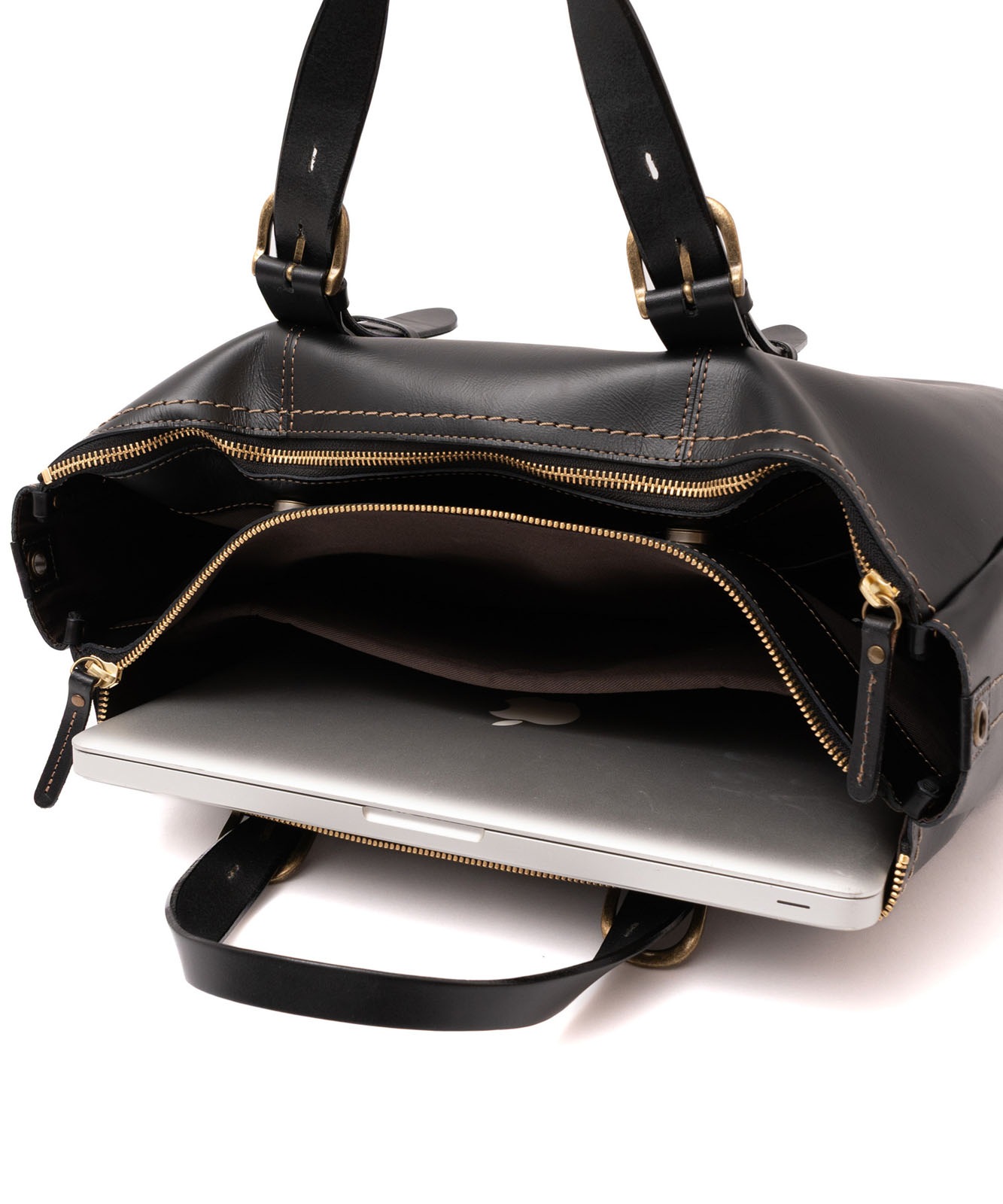 バッグ内部は3スペース構造。書類やデバイス、小物類をすっきり整理できます。